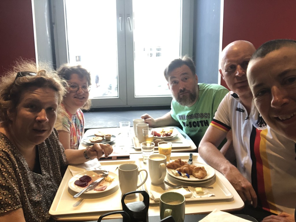 Hier était jour de lessive pour moi, il était temps après trois jours… Bien qu’elle soit sèche ce matin, je change quand même de tenue – on a sa coquetterie, même à vélo – puis on part retrouver nos amis au petit-déjeuner.