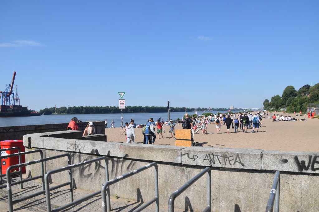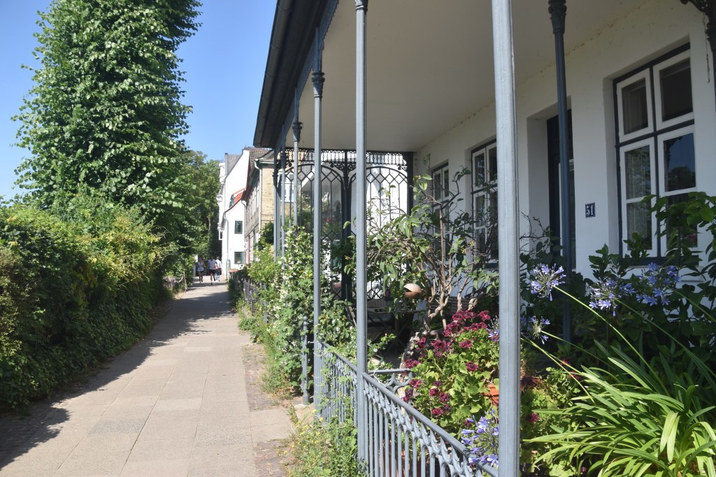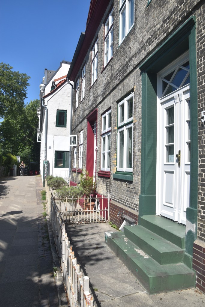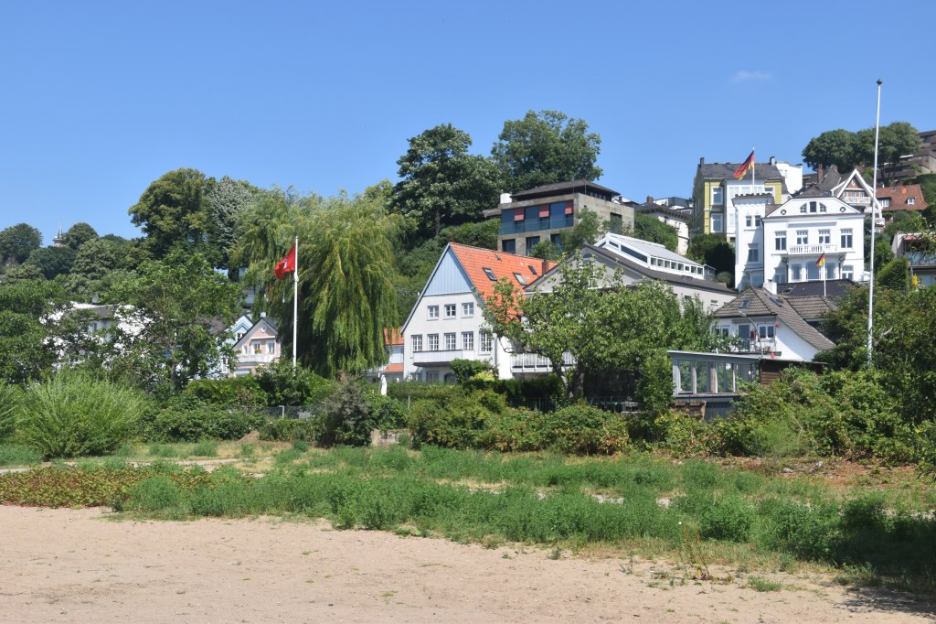 Le fléchage est toujours lamentable, et en suivant les panneaux Nordseeradweg, on arrive donc à une charmante petite plage qu’il est évidemment impossible de traverser à vélo. Un des policiers présents, à qui Philipp fait part fort civilement de sa perplexité et de son mécontentement, nous conseille de rejoindre la Elbchausee un peu plus haut, mais à mi-hauteur, on bifurque vers une adorable ruelle étroite, où on ne peut d’ailleurs pas rouler à vélo, bordée de magnifiques maisonnettes à droite et de leurs jardins à gauche, le tout à flanc de colline.