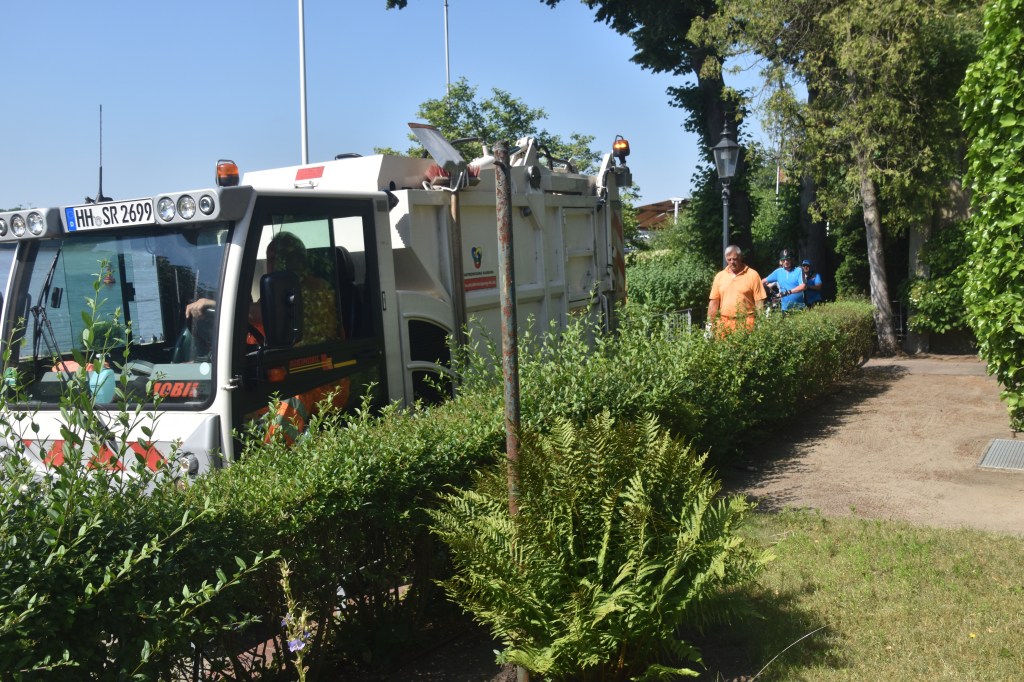 Les choses se compliquent quand on doit laisser passer le camion poubelle, dont on croirait qu’il a été fabriqué exprès pour passer dans cette ruelle. On se range avec nos vélos sur le porche d’une maison, puis on repart et on rejoint finalement la Elbchaussee, en prenant une côte qui me fait un peu penser à celle que nous avons dû gravir pour atteindre notre hôtel à Koblenz. Horrible… et évidemment, en poussant nos vélos, rester dessus serait impossible.