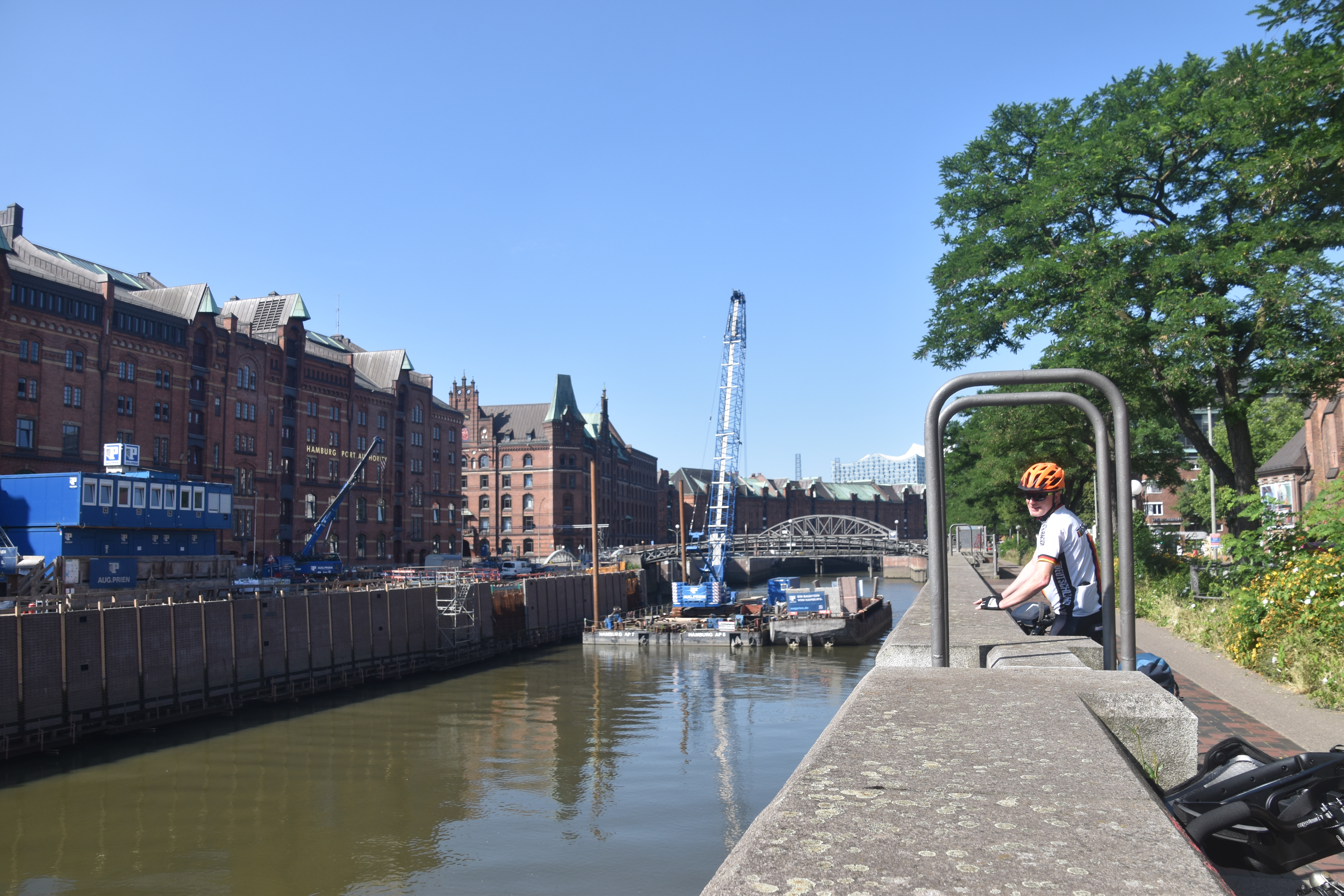 Du coup on papote un peu plus que d’habitude et on se met en route à 9h45 seulement. J’ai programmé Komoot pour qu’on retrouve la rive de l’Elbe sans problème, et c’est en effet ce qui se passe. On admire au passage les anciens entrepôts (la Speicherstadt) et les ascenseurs qui mènent au tunnel sous l’Elbe (celui que Philipp aurait voulu qu’on emprunte hier), puis on continue vers Blankenese, dernier endroit connu de Philipp en Allemagne du Nord.