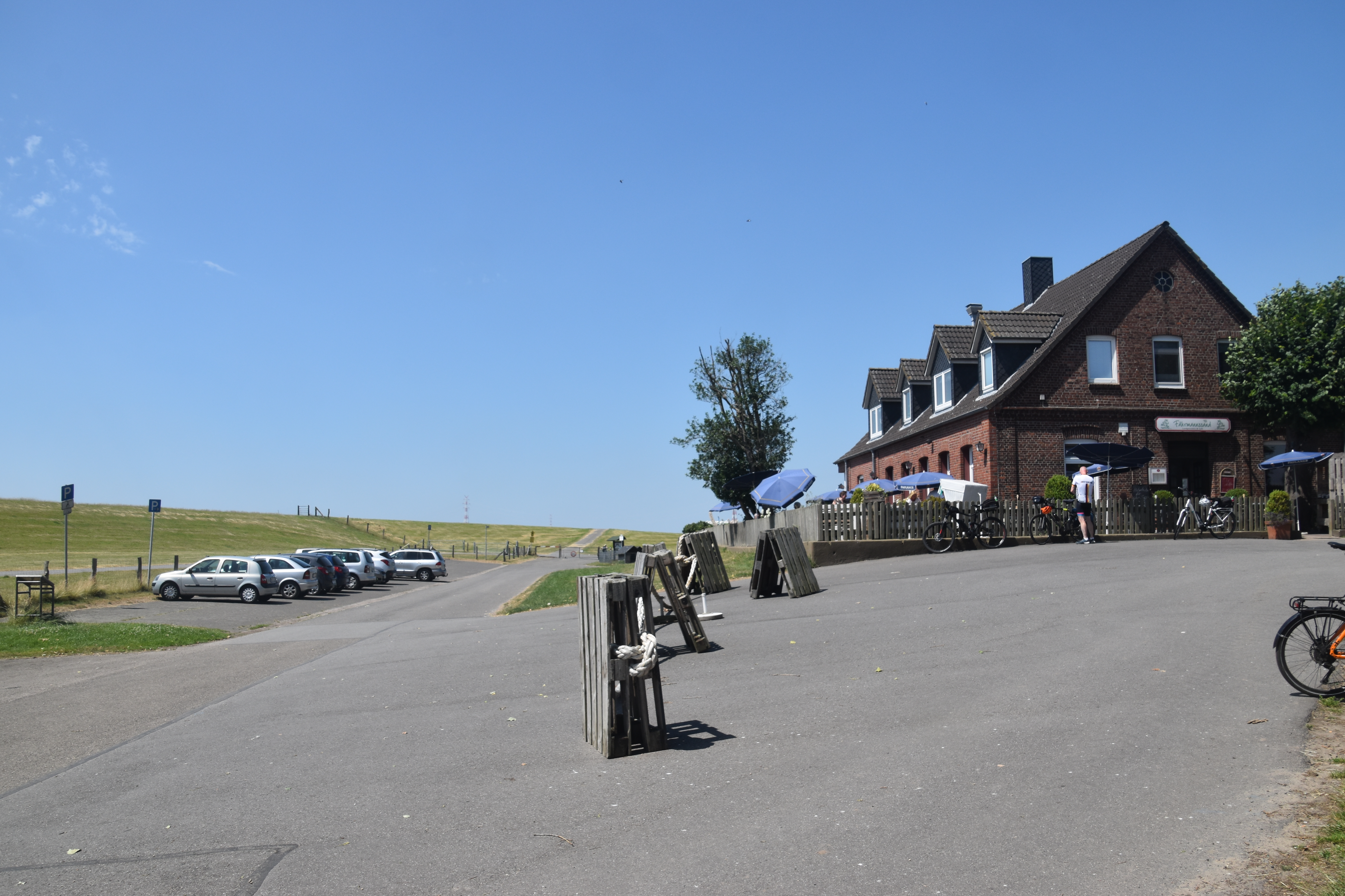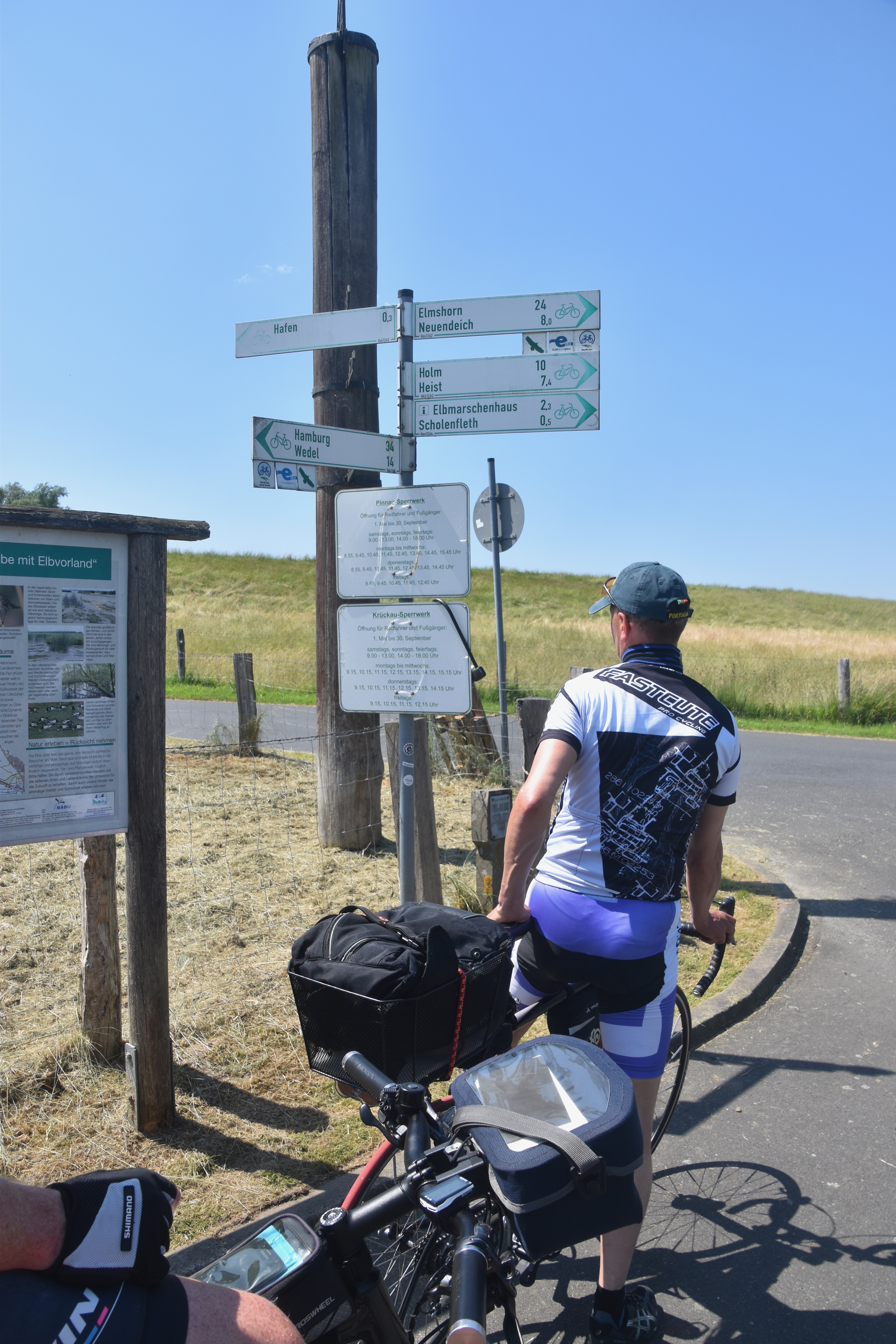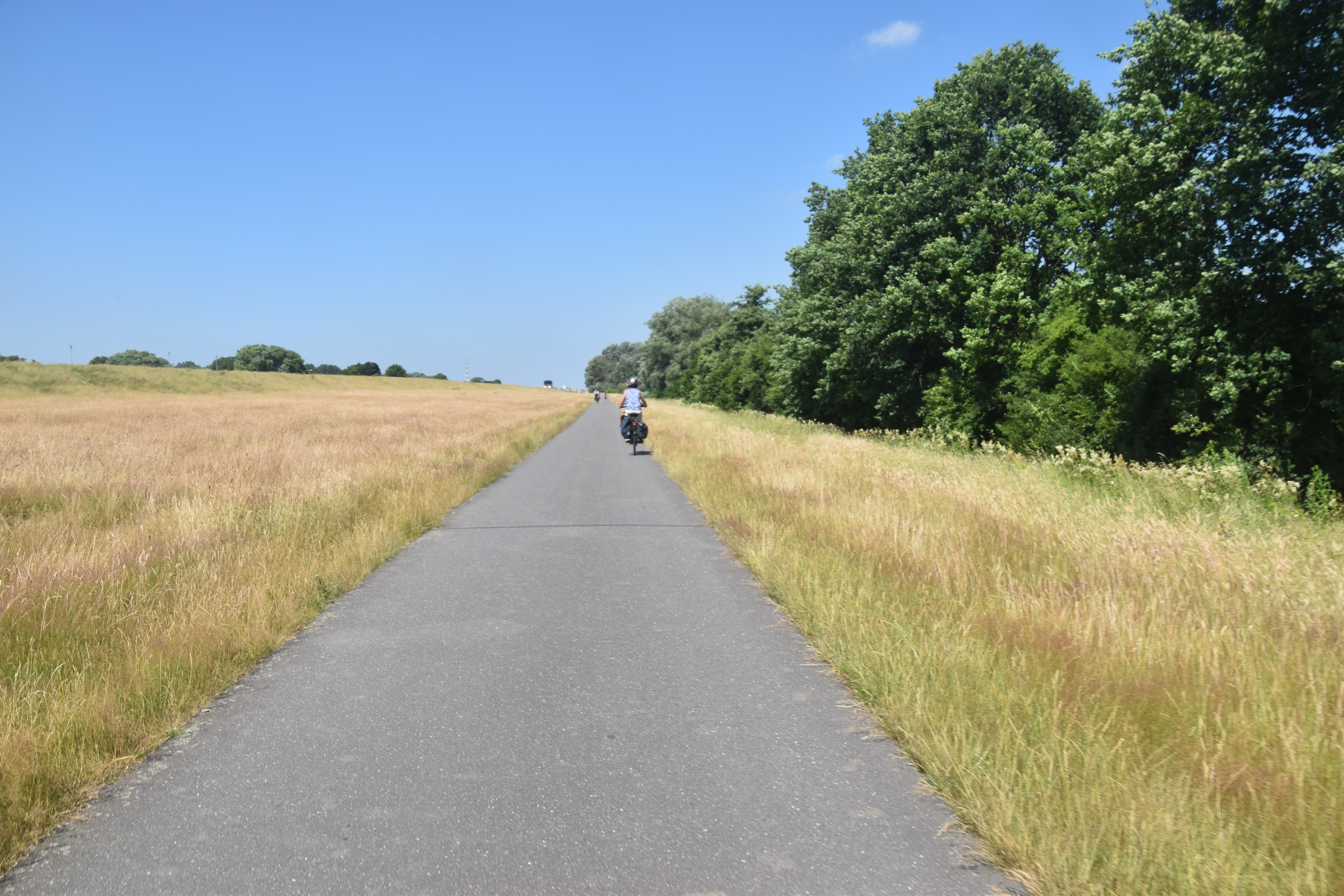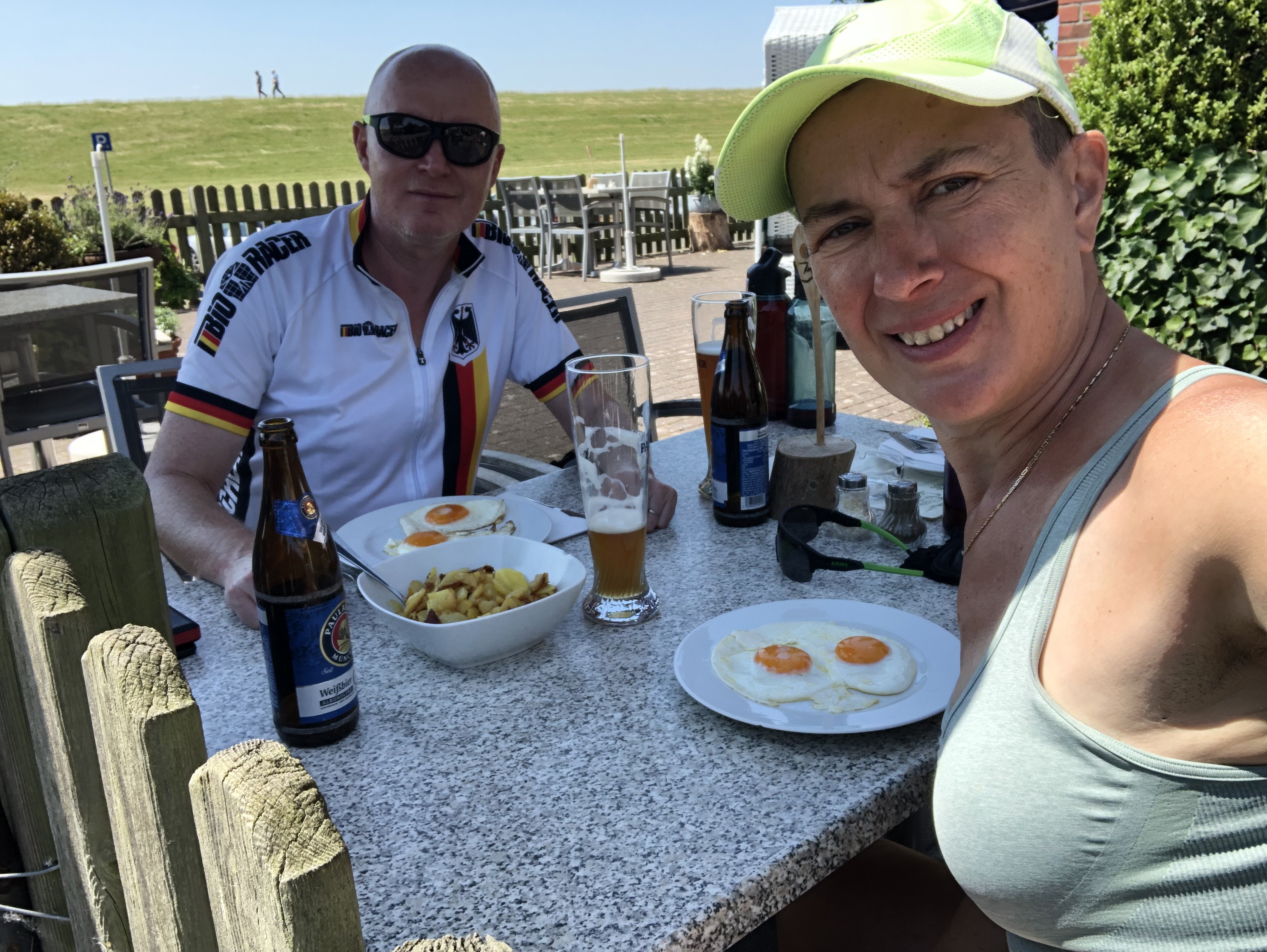 À partir de là, on ne quitte plus vraiment l’Elbe, à une petite exception. Le vent n’a pas changé de direction depuis hier et on l’a donc dans le dos, on avance bien et on se paie même le luxe d’une petite course (on a tous les deux gagné !) sur une magnifique piste cyclable dans une réserve naturelle, juste avant de s’arrêter pour manger, à 12h20 a l’établissement Fährmannsand, à Wedel. On n’a fait que 28km, mais on doit être à peu près à la moitié du chemin. On reprend des forces avec deux œufs sur le plat (chacun) et des pommes de terre rissolées, le tout accompagné de force bière sans alcool – de la Weissbier pour être exacte, autrement dit de la blanche, mais munichoise. C’est très bon et ça tient au corps ! Il fait à nouveau très chaud, et seul le vent rend cette chaleur supportable.