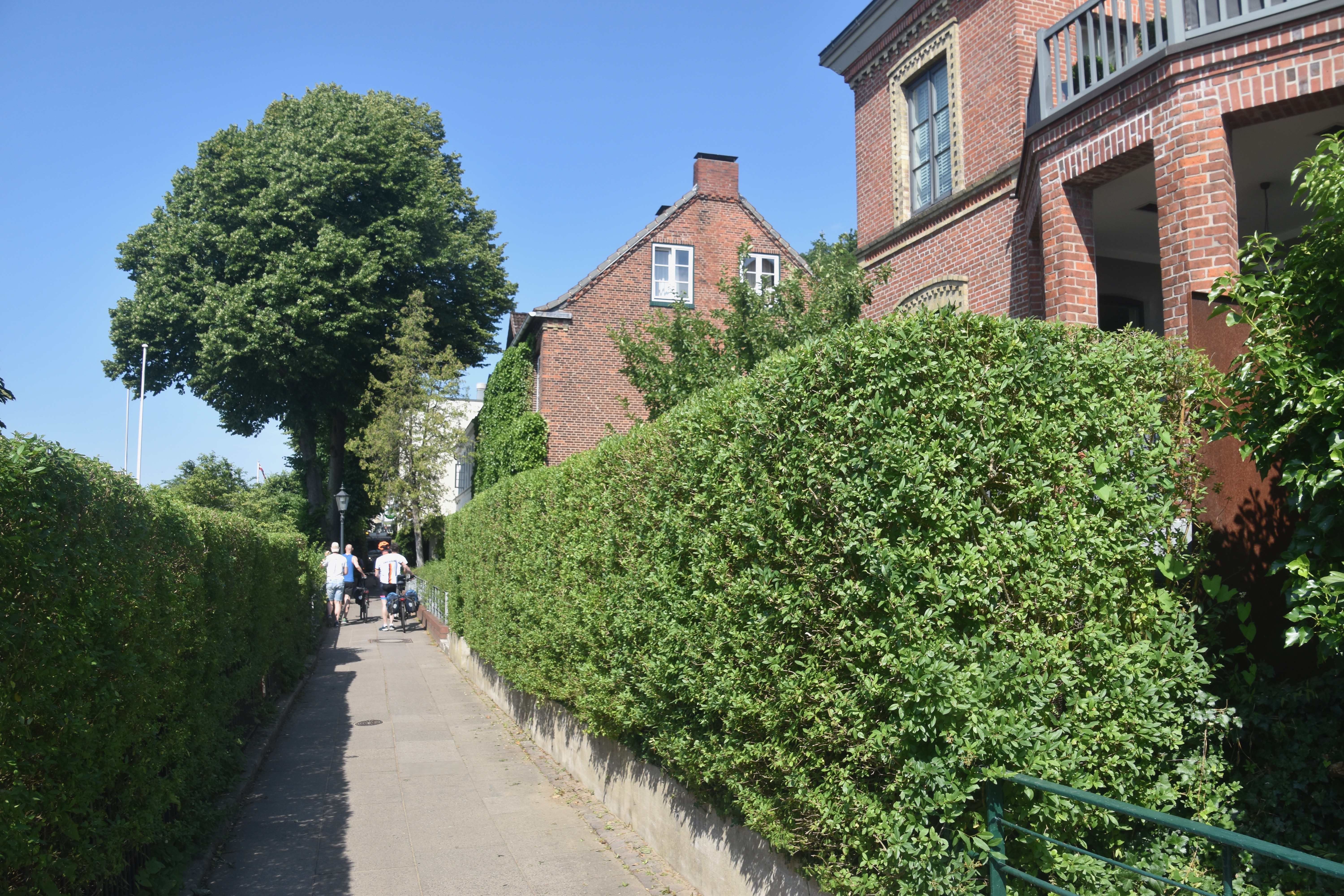 Le fléchage est toujours lamentable, et en suivant les panneaux Nordseeradweg, on arrive donc à une charmante petite plage qu’il est évidemment impossible de traverser à vélo. Un des policiers présents, à qui Philipp fait part fort civilement de sa perplexité et de son mécontentement, nous conseille de rejoindre la Elbchausee un peu plus haut, mais à mi-hauteur, on bifurque vers une adorable ruelle étroite, où on ne peut d’ailleurs pas rouler à vélo, bordée de magnifiques maisonnettes à droite et de leurs jardins à gauche, le tout à flanc de colline.