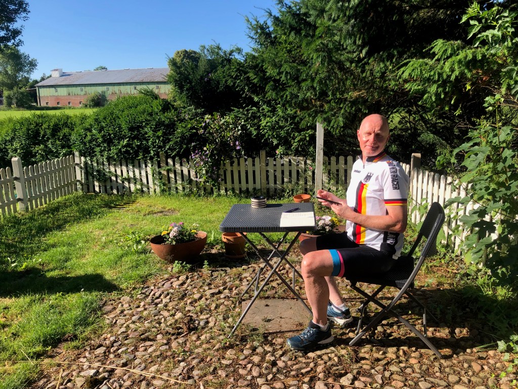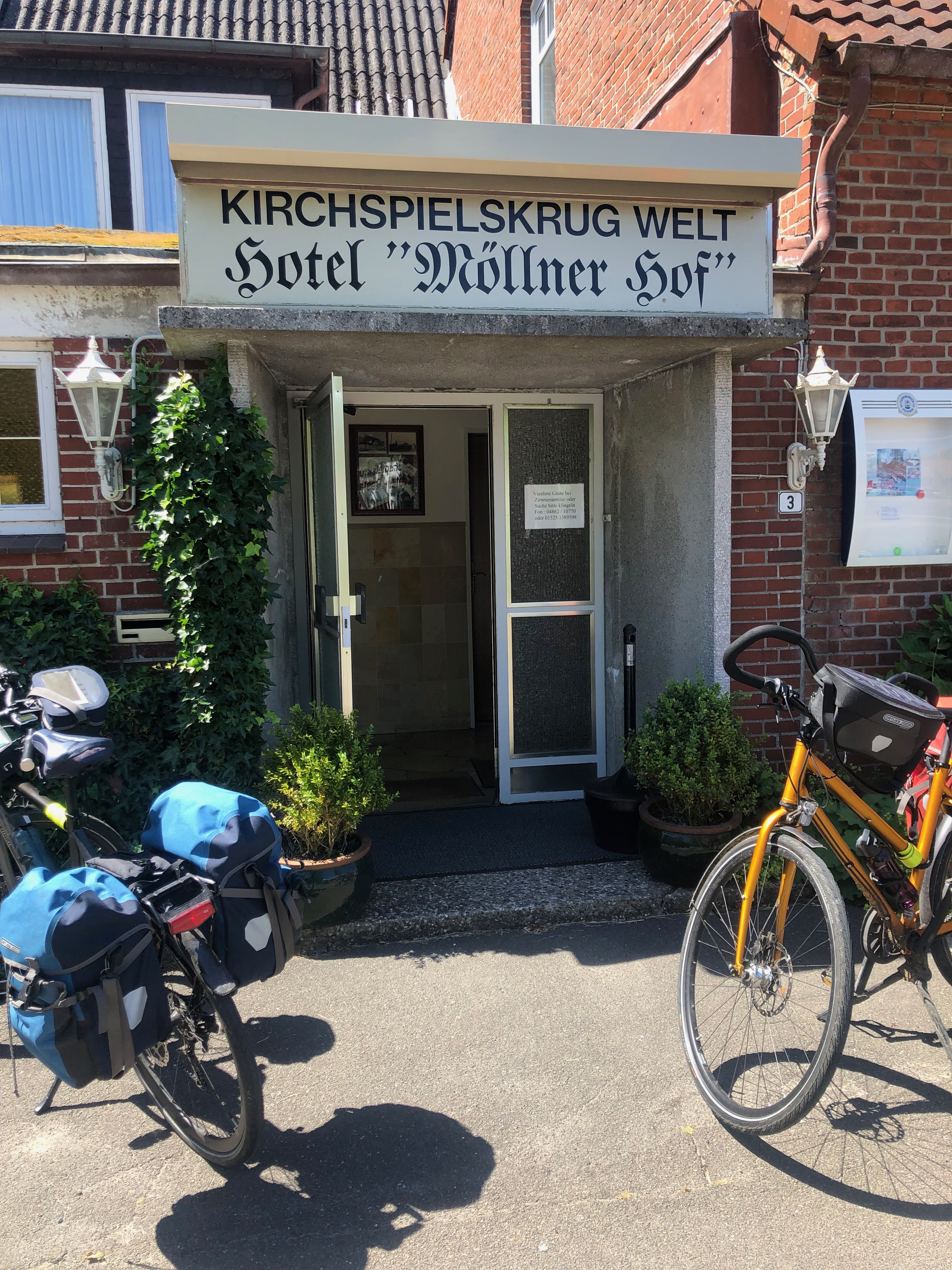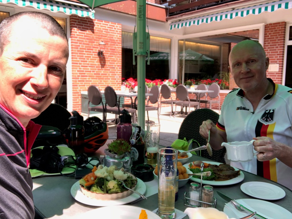 On commence à avoir faim, mais il n’y a pas des masses de choses dans les environs, c’est le moins qu’on puisse dire. Alors, on se résout à utiliser les grands moyens : Google Maps nous renseigne un hôtel-restaurant, le Kirchspielskrug Welt hôtel « Möllner Hof », à 2km, à Welt, et on y fonce. Il est 12h40 quand on y arrive, on a fait 61,46km ce matin ! On s’installe à l’arrière, sur la petite terrasse, qui jouxte un très joli jardin où on laisse nos vélos. La carte ne propose rien de végétarien, mais la dame est toute disposée à me préparer un petit quelque chose. Et en fait de petit quelque chose, je reçois une énorme assiette de légumes (carottes, haricots, chou-fleur, brocoli et champignons), accompagnée de sauce hollandaise et de croquettes de pommes de terre. Philipp, lui, s’offre des joues de boeuf, et il paraît qu’il a rarement aussi bien mangé.