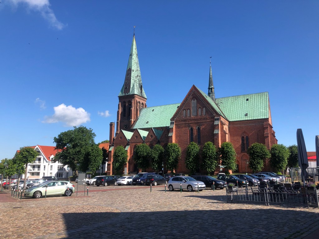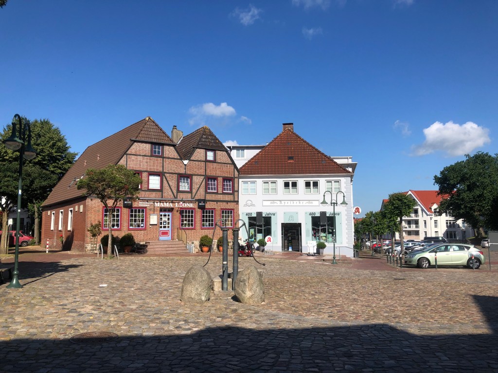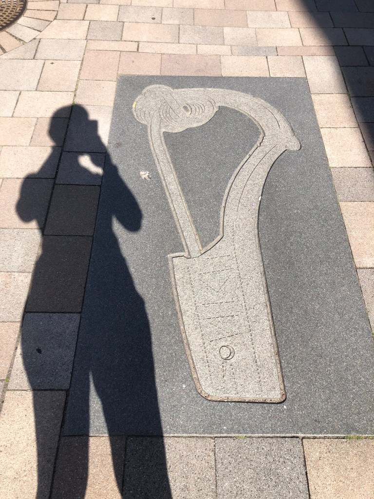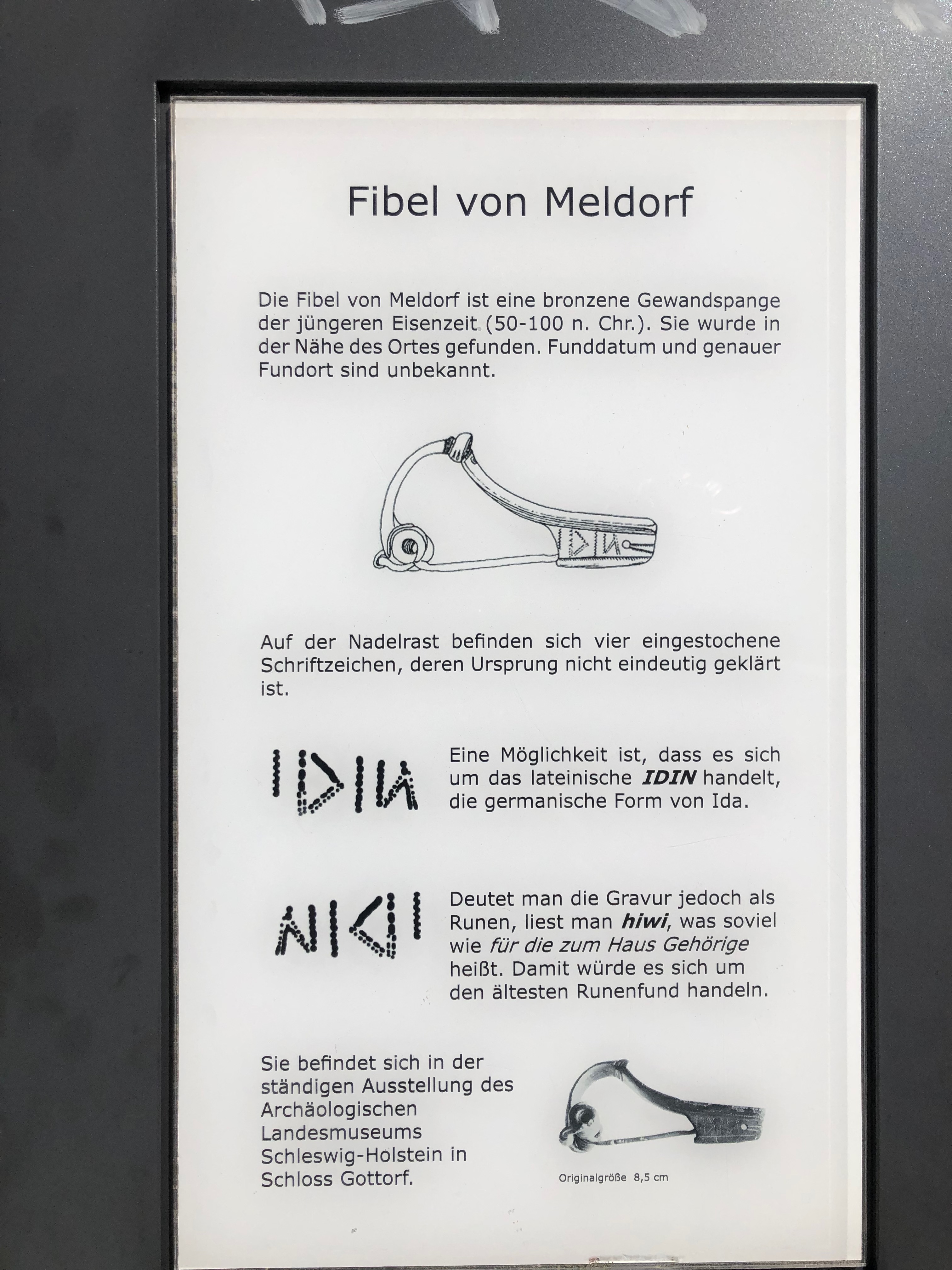 À 9h35, on fait un petit arrêt sur la ravissante place de Meldorf, après 15km. On y reste un instant perplexe devant une dalle gravée au sol, qui représente quelque chose qu’on peine à identifier. Heureusement, une plaque explicative supplée à notre ignorance : il s’agit d’une broche, pas préhistorique mais presque, dont l’original se trouve au musée du Schleswig-Hostein.