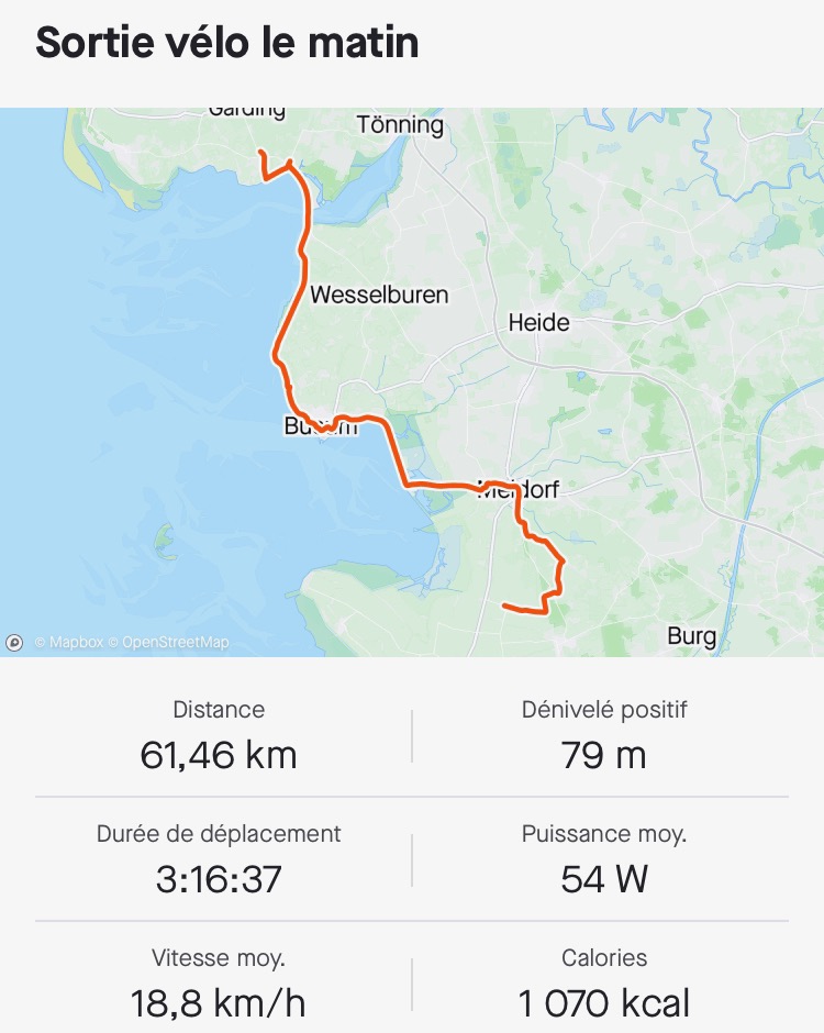 On se rend compte aussi que le Nordseeradweg nous fait faire le tour d’une presqu’île qui a l’air magnifique, mais porte notre trajet de demain à près de 100km, ce qui m’effraie quand même un peu. On trouve un compromis : on ne fera pas tout le tour de la presqu’ile, on se contentera d’y aller, de la « couper en deux » et d’en repartir.