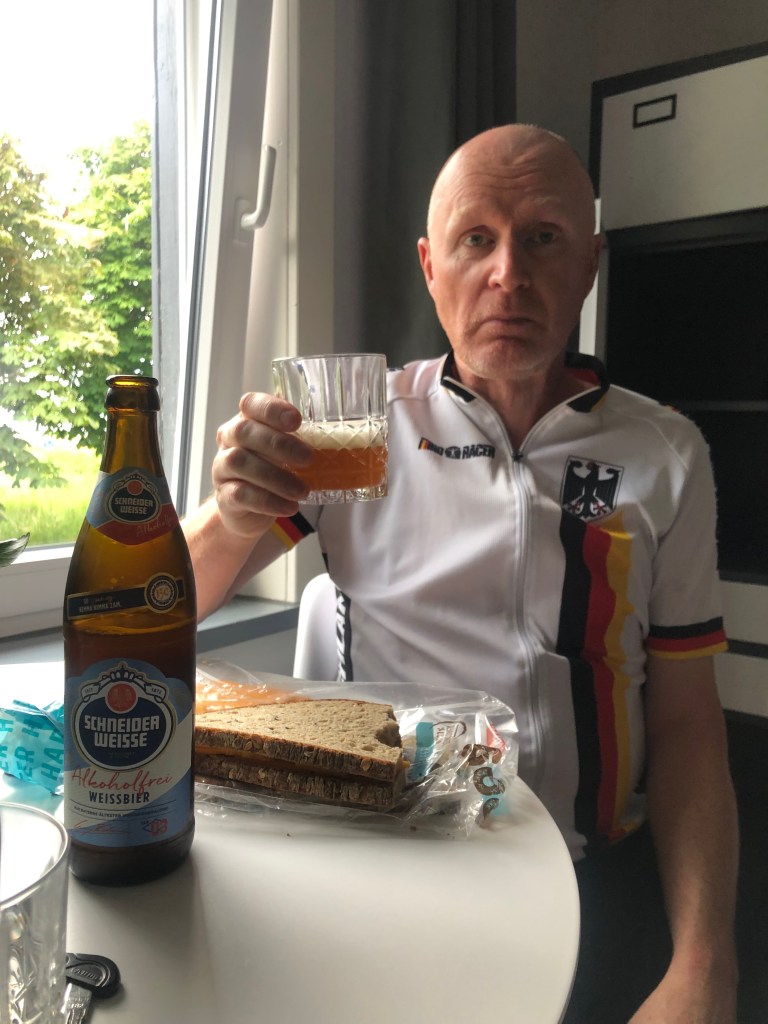 Je me rue sur mes biscuits au chocolat, et Philipp sur les restes d’hier : pain, fromage … et bière (heureusement sans alcool) ! C’est qu’une grosse journée de vélo nous attend !