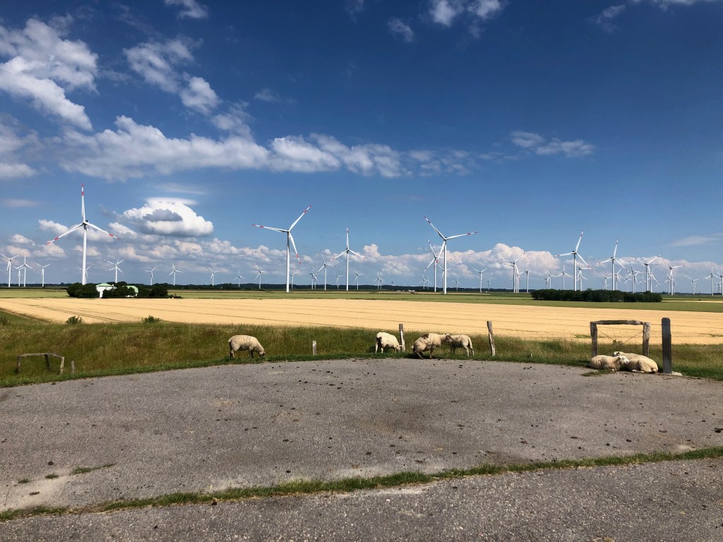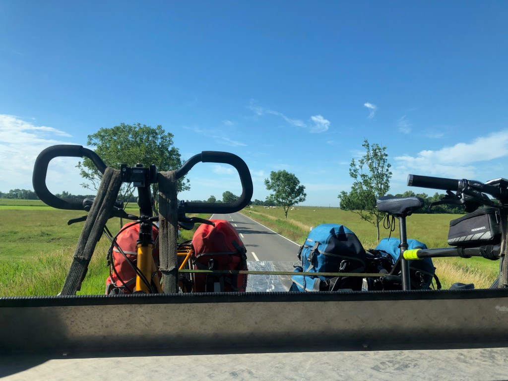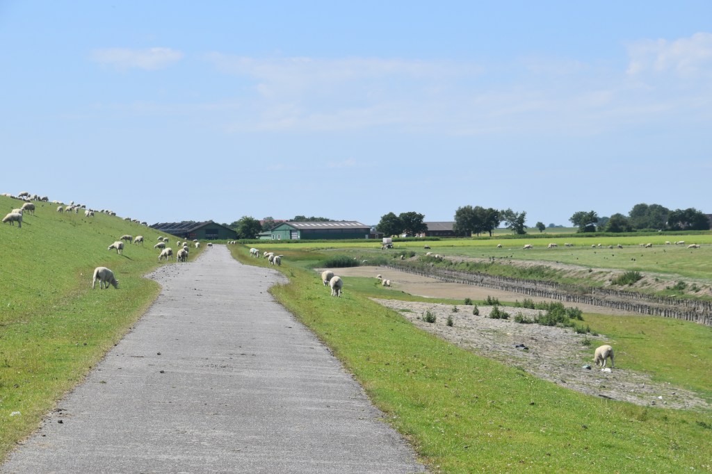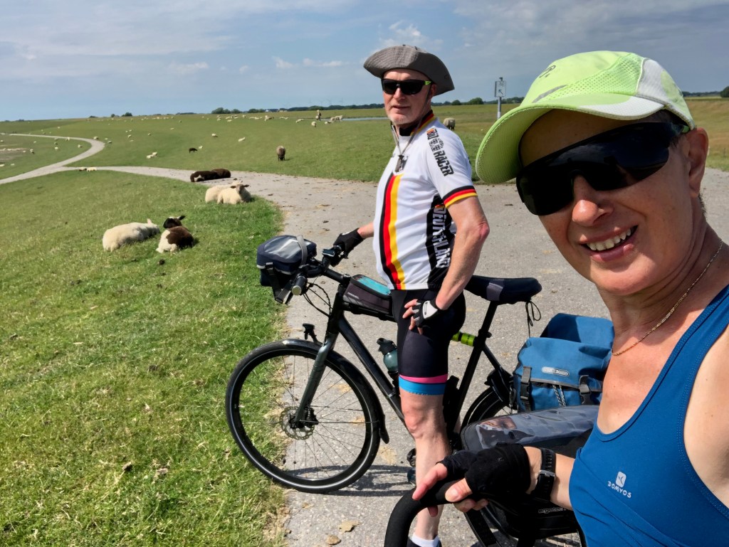 On repart vers 13h20, et c’est reparti pour des kilomètres de digues, de moutons, de barrières à ouvrir, de cieux magnifiques, de cyclistes en électrique (qu’on toise avec dédain) ou en « musculaire » (qu’on salue d’autant plus gentiment qu’ils sont lourdement chargés, comme nous). J’exagère évidemment, on est charmants avec tout le monde, mais on n’en pense pas moins !