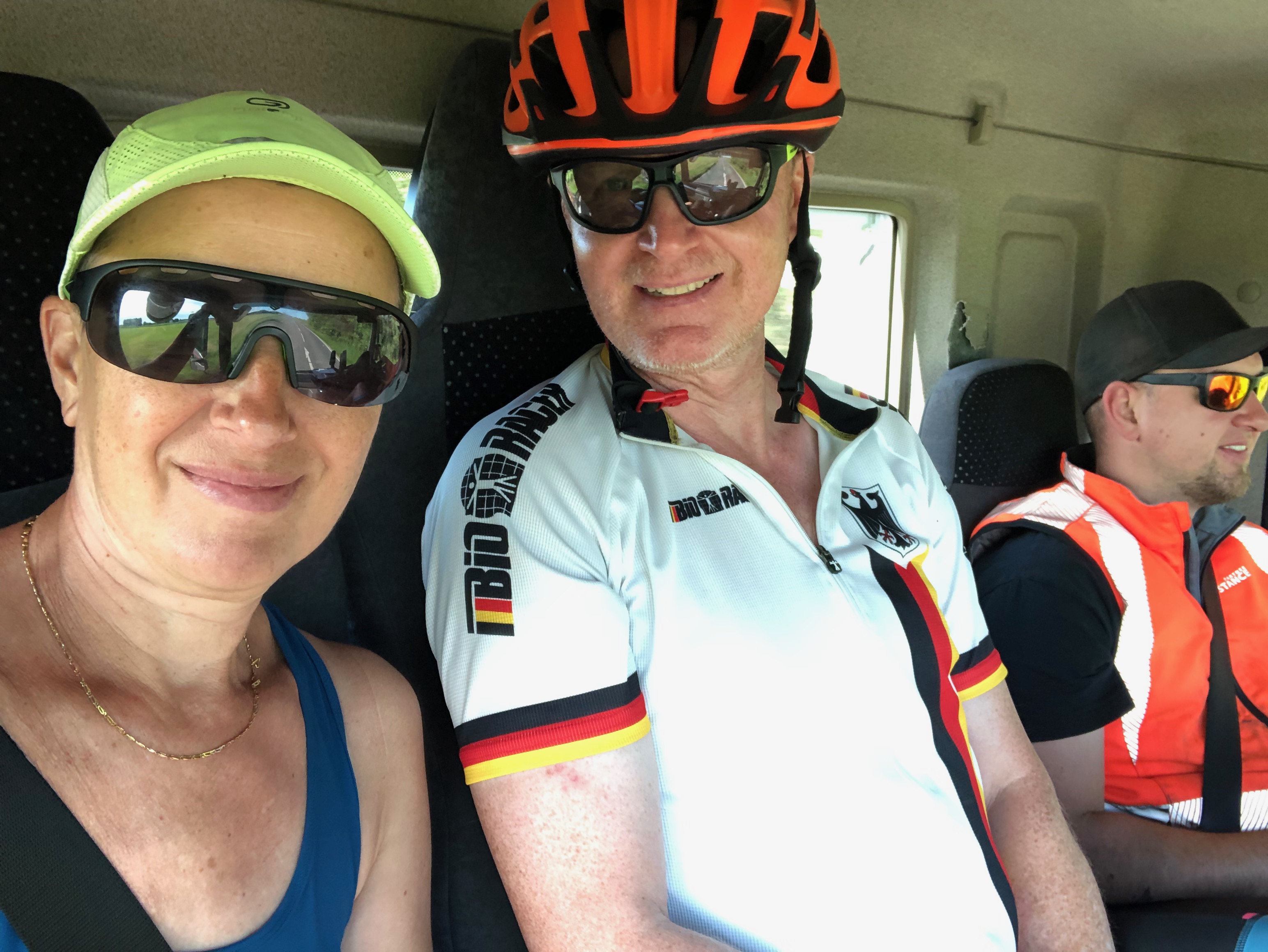 A 7h55 on est prêts à partir, et c’est à ce moment-là que je découvre que mon pneu avant est plat ! Je me mets en devoir d’examiner la chambre à air, on essaie de repérer l’origine de la fuite, mais peine perdue. Parallèlement, Philipp a contacté notre assurance, un dépanneur du coin l’a rappelé et peut nous conduire quelque part où on trouvera peut-être un réparateur de vélos (et c’est évidemment toujours un dimanche que ça arrive, ce genre de choses..) et après réflexion, on finit par décider de lui demander de nous amener à Husum, ce qui aura en outre l’avantage de raccourcir un peu notre étape du jour. Il accepte de nous prendre tous les deux et arrive un peu avant 10h. Entre-temps, les propriétaires de la Pension Seerose sont arrivés et nous ont prêté une pompe, avec laquelle Philipp regonfle mon pneu à bloc.