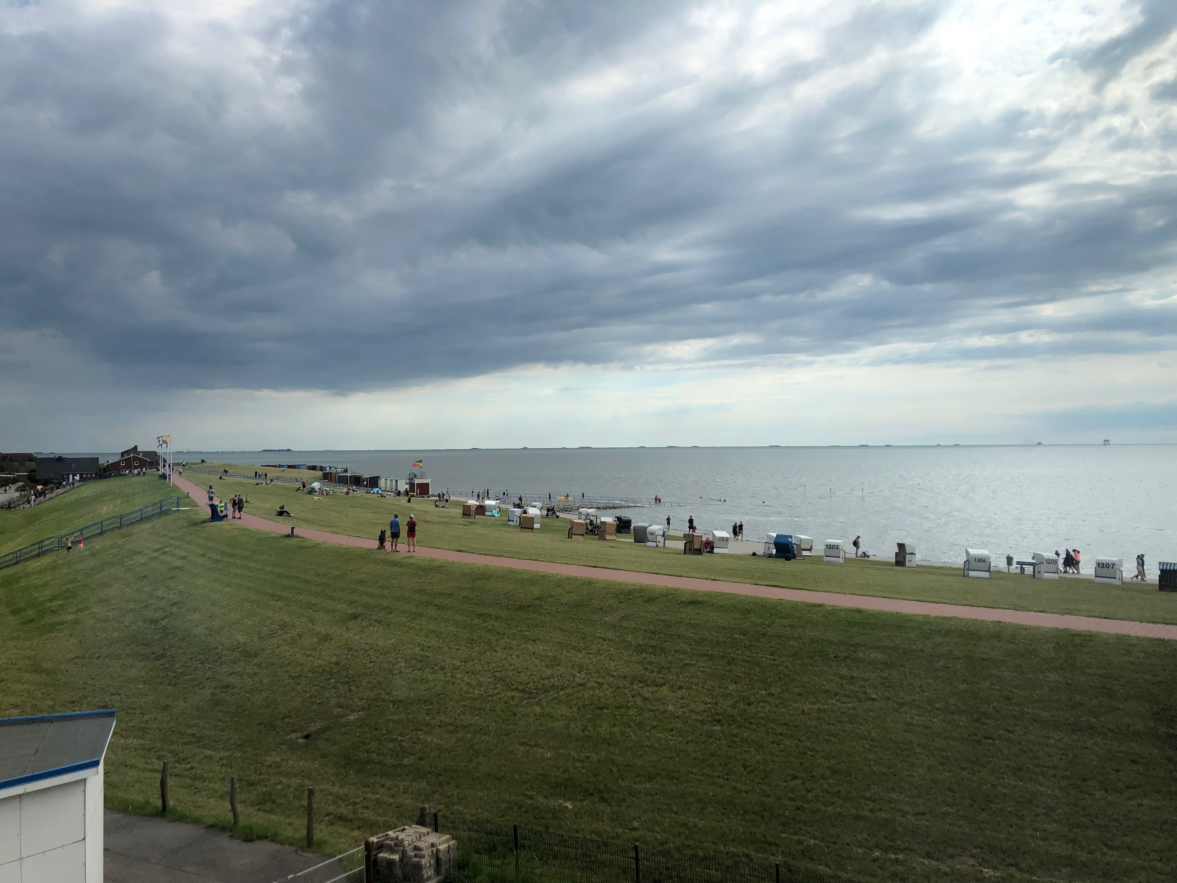 Le vent est toujours fort, et rarement dans notre dos, et on est donc passablement fatigués quand on arrive enfin à Dagebüll et au Strandhotel du même nom, à 16h35 après avoir fait 45,26 km. On a une chambre magnifique au 2è étage (la chambre 23), d’où on a une vue imprenable sur la mer, la plage, les Strandkörbe et les gens qui se baignent. On resterait bien deux nuits ici, tiens ! A noter pour la prochaine fois : dix jours sans la moindre pause (ce qu’on a prévu), c’est beaucoup trop.