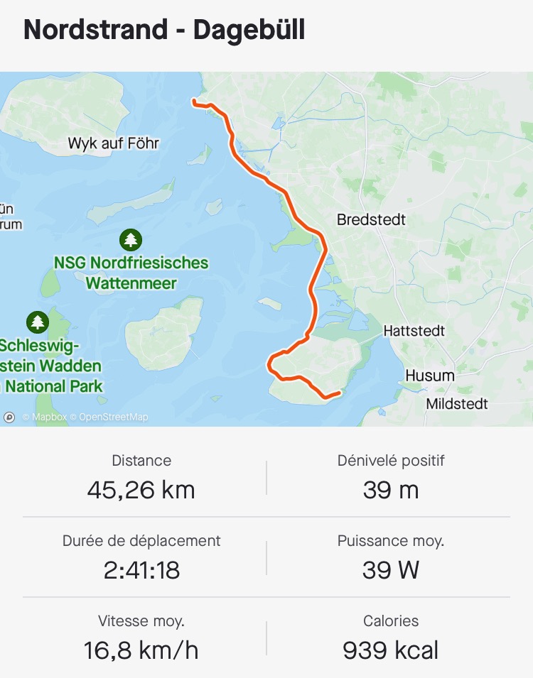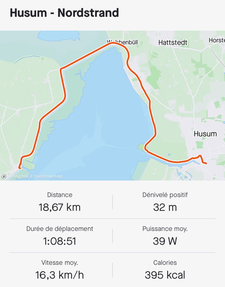 Du coup, ce qui est bien, c’est que toute notre discussion d’hier soir n’a plus aucune raison d’être : on avait en effet renoncé à faire le tour de la « presqu’île » (qui en fait n’est pas du tout une presqu’ile, puisque, comme nous l’apprend le dictionnaire en ligne, qui dit presqu’ile dit isthme, c’est-à-dire étroite bande de terre reliant la quasi île à la terre) sur laquelle se trouve Tating, pour pouvoir faire en partie le tour de la presqu’ile (une vraie, cette fois) de Nordstrand. Mais maintenant que nous sommes à Husum, donc à une douzaine de kilomètres seulement de Nordstrand, plus rien ne nous empêche d’en faire le tour !