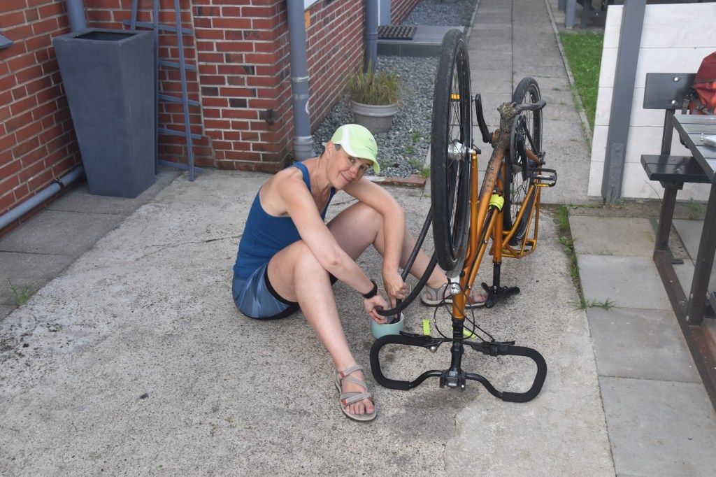 A la Radstation, la jeune fille qui nous accueille accepte de remplacer ma chambre à air pour être sûrs – car mon pneu n’a pas l’air de s’être dégonflé le moins du monde pendant le trajet; ça doit être un tout petit trou. et on peut enfin se mettre en route, peu après 11h !