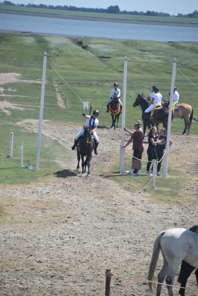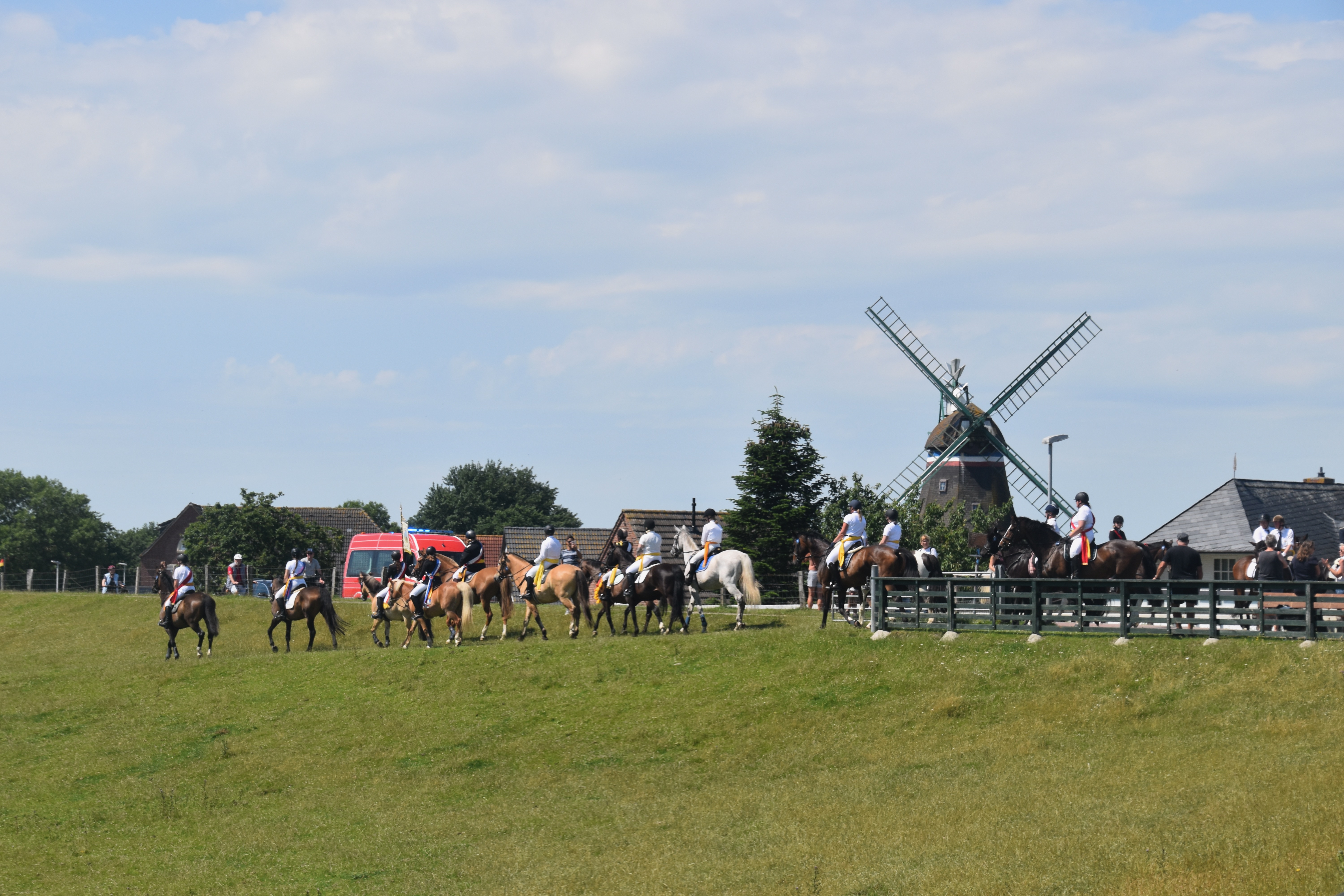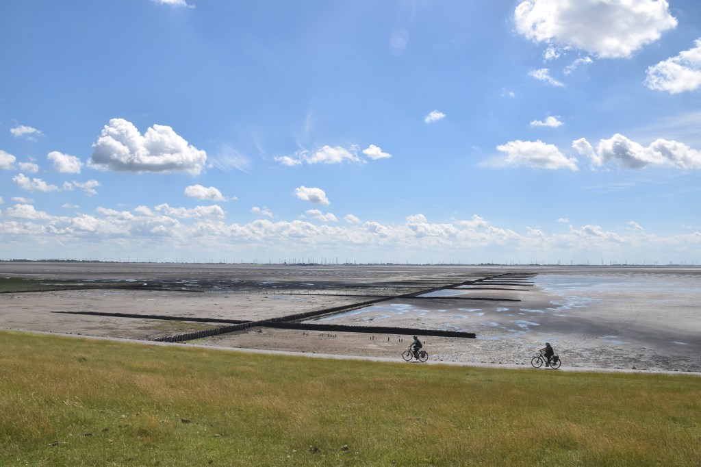 On entame donc notre périple, et en effet c’est magnifique, même si en fait très semblable aux paysages qu’on connaît déjà bien, un peu partout le long de la mer des Wadden. Mais bon, l’heure tourne et l’heure de manger arrive vite, d’autant que je n’ai quand même pas mangé grand chose ce matin, finalement. On jette notre dévolu sur le Watt’n Grill, où ils ont même deux burger végétariens différents ! Philipp en prend un, moi l’autre. On assiste à l’arrivée des participants à un tournoi qui a lieu une fois par an, des gens à cheval qui doivent faire passer des lances dans des anneaux et à la fin il y a un roi et/ou une reine, enfin si j’ai bien compris les explications données par une des cavalières à Philipp, qui n’a pas résisté à « taquiner l’indigène » pour savoir ce qui se passait.