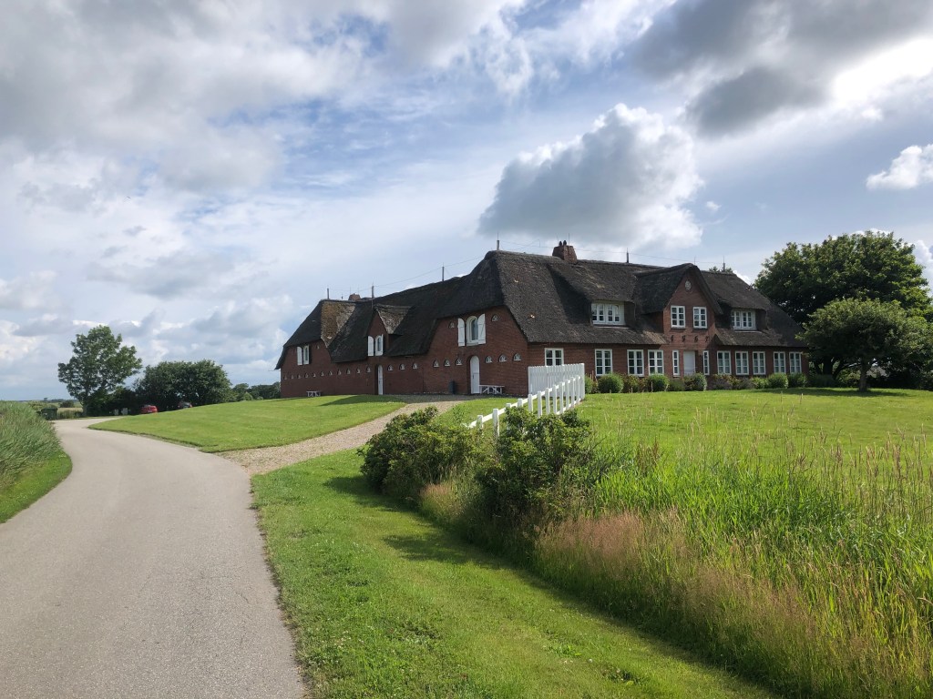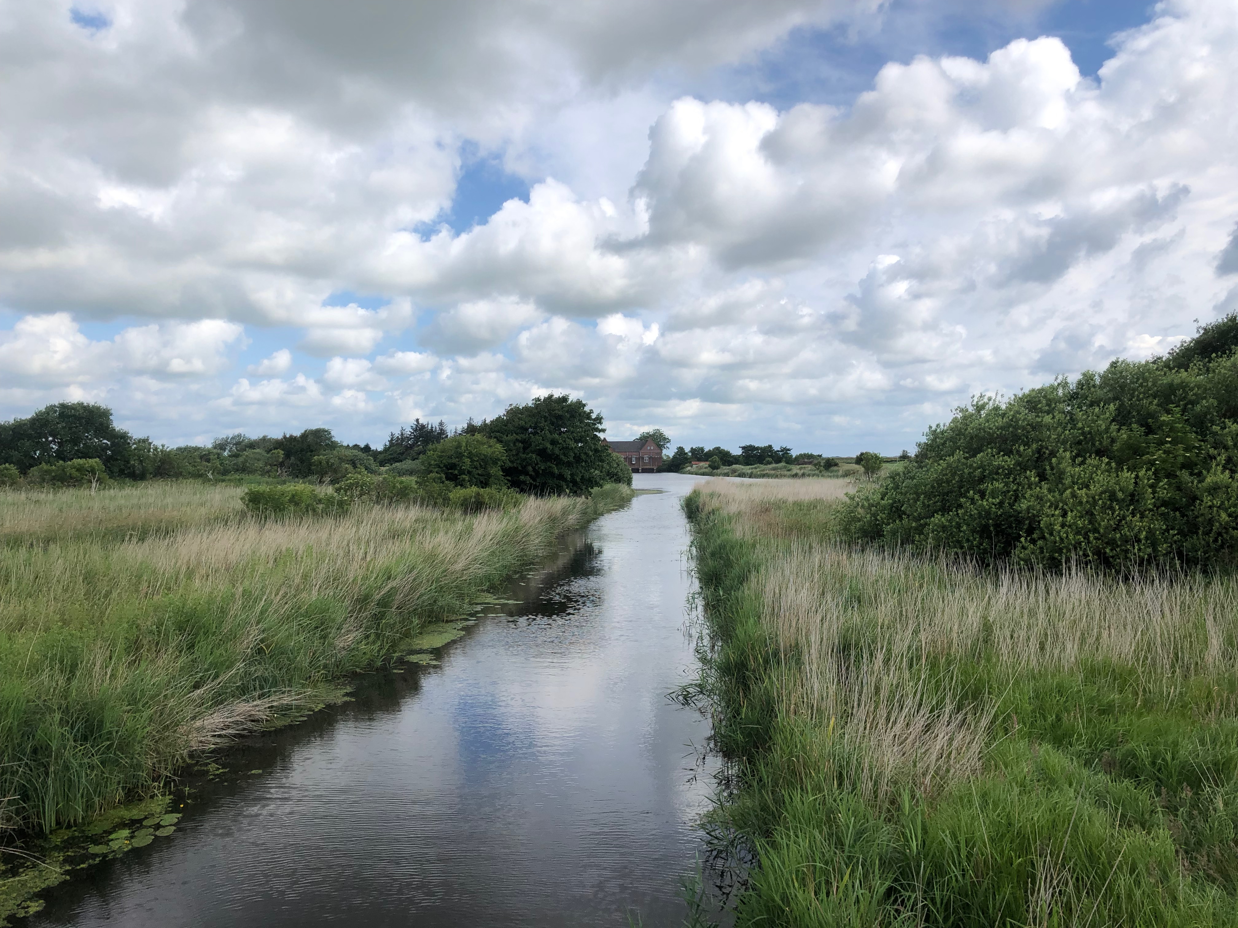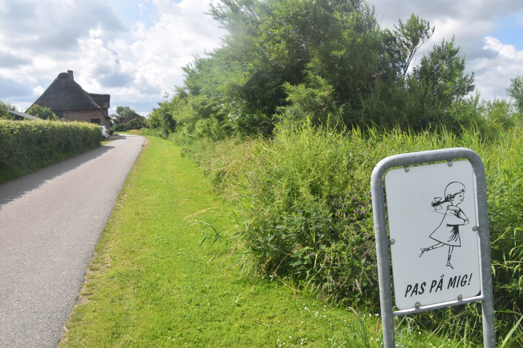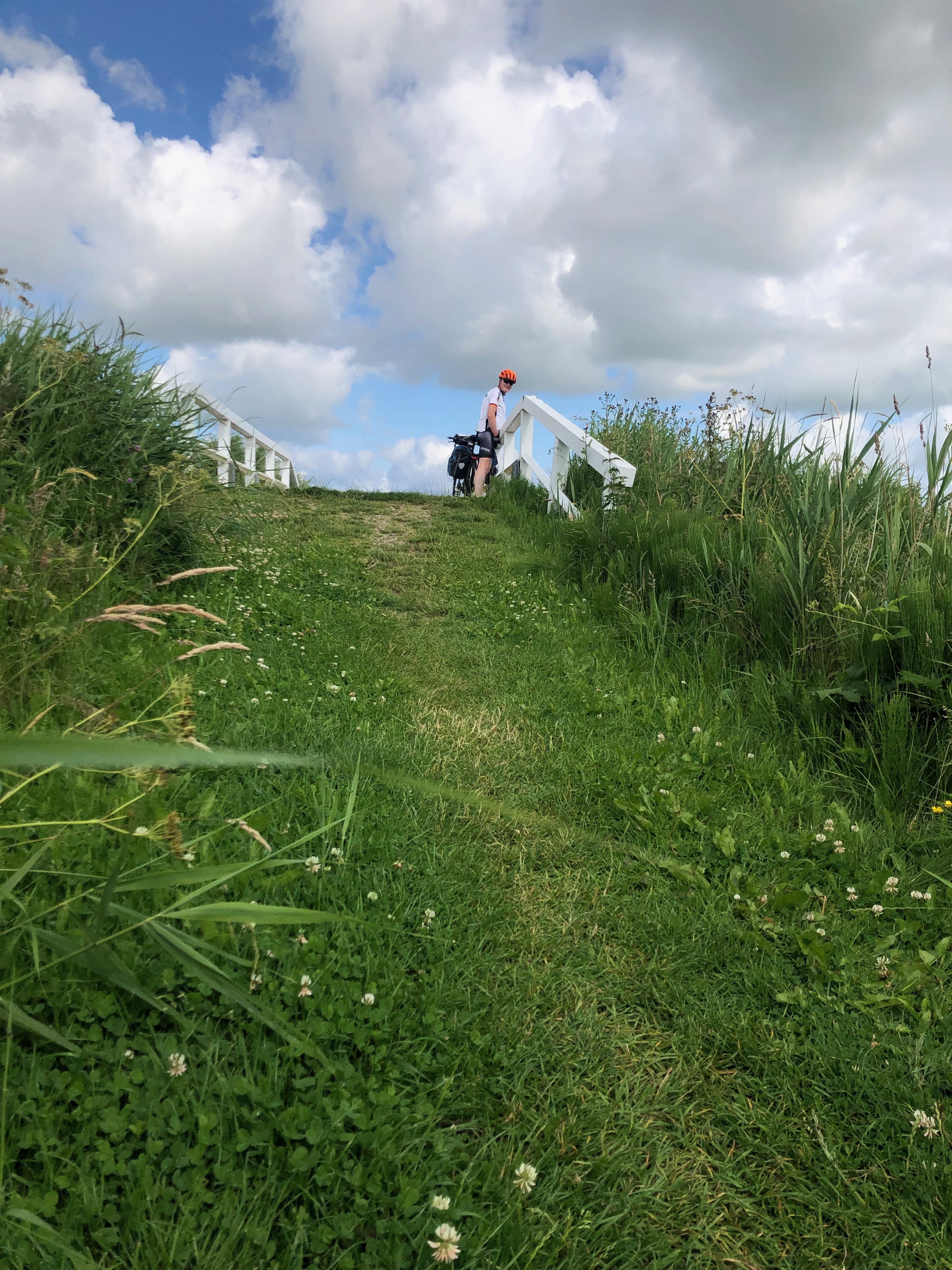 Tout près de la frontière, l’itinéraire nous amène soudain à un château (le Seebüll hof), puis à un chemin de coquillages, puis d’herbe, puis à un petit pont blanc adorable d’où Philipp s’amuse à faire pipi dans l’eau. Il est 10h15 et on a déjà fait 37km, c’est une journée comme je les aime !