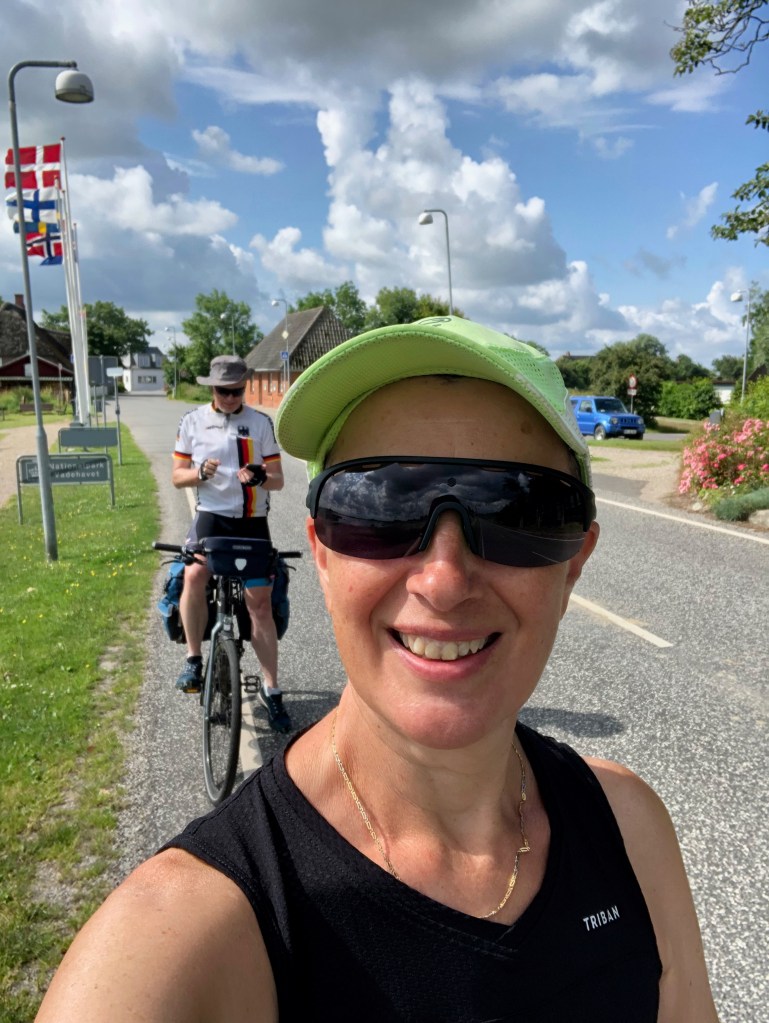 La pluie, heureusement, ne dure pas trop longtemps. On suit l’itinéraire Komoot que j’ai programmé hier soir, mais qui ne suit pas la North Sea Cycle Route (désolée, je ne sais pas comment on dit ça en danois). Ça perturbe un peu Philipp, qui croit toujours qu’on s’éloigne, mais il fait des efforts louables pour lâcher prise. Et la route est magnifique, le ciel superbe, les couleurs variées… Je fais peu de photos parce qu’on roule bien et qu’on savoure le fait de ne plus être obligés de s’arrêter tous les kilomètres pour ouvrir une barrière : on ne va pas remplacer les barrières par des pauses photo, ce serait con !