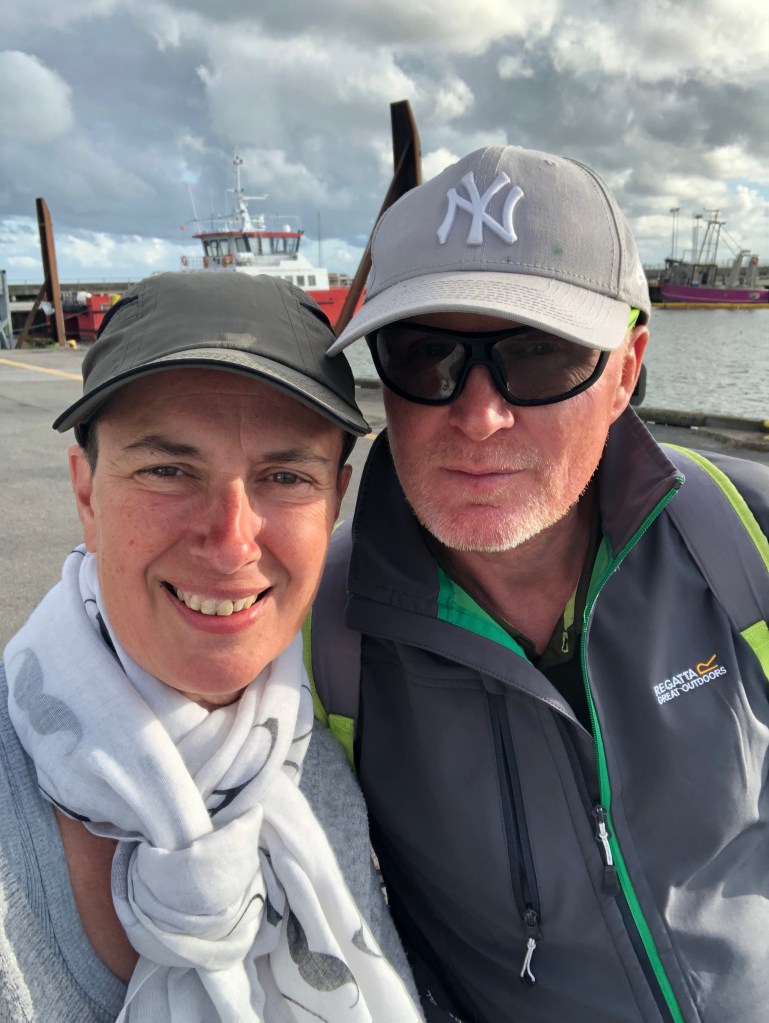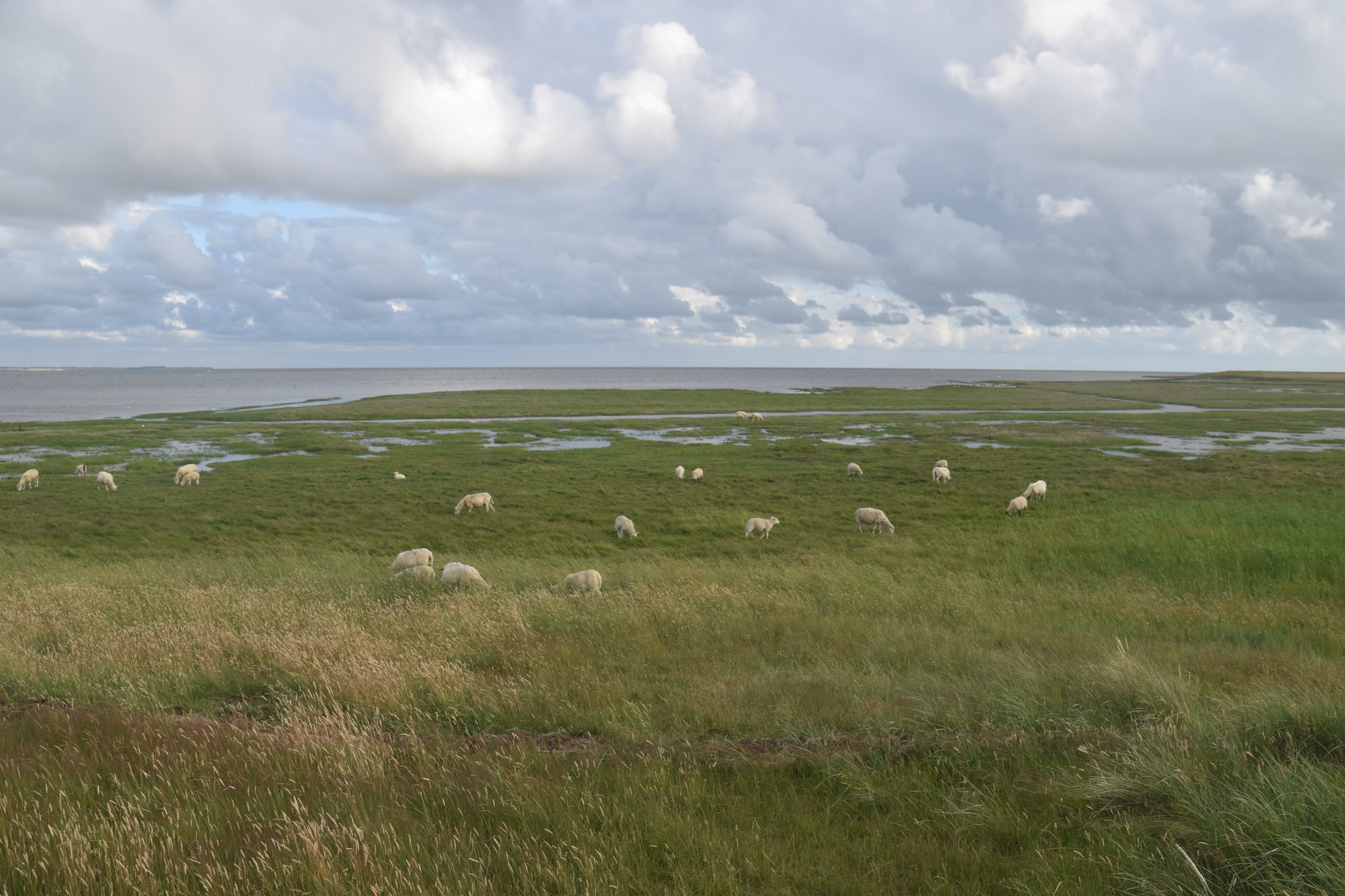 Ensuite on reprend nos vélos et on va jeter un œil à la mer – il y a des moutons sur la pelouse qui jouxte la plage, et pas de séparation entre la pelouse et la plage, les moutons peuvent donc aller dans le sable – et au port, puis on rentre « chez nous ».