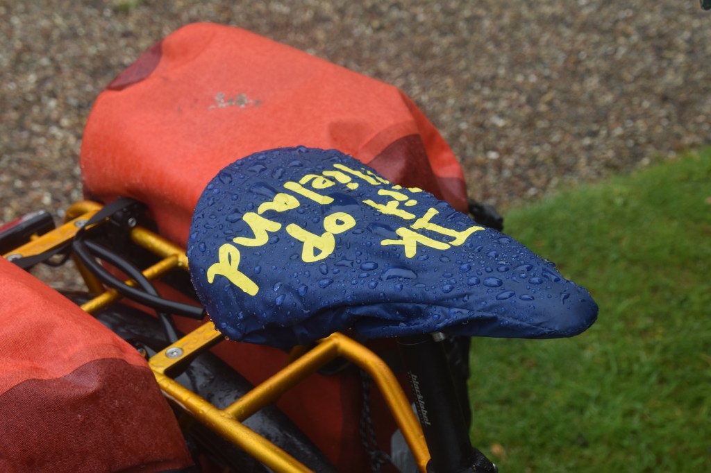 On repart sous la pluie, j’ai pensé à mettre mon superbe protège selle acheté à Vlieland cet hiver, mais Philipp a oublié et s’en sert donc pour protéger son postérieur de sa selle trempée !