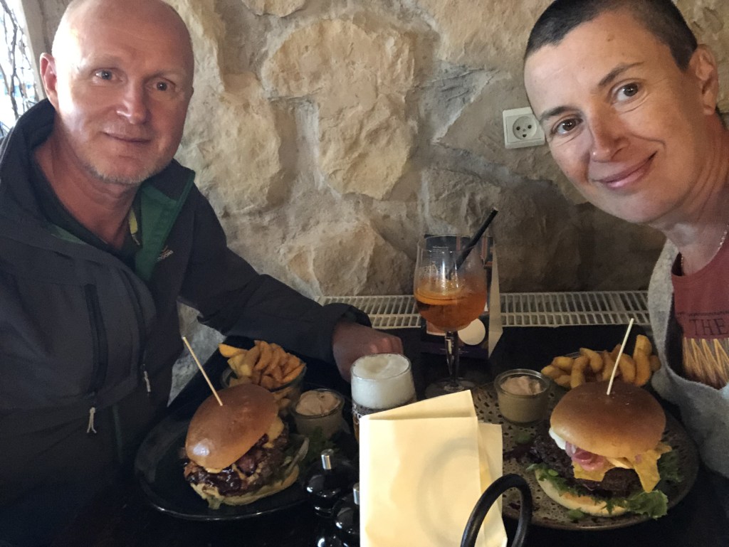 Hier, on a fait très fort, puisqu’on n’est finalement jamais ressortis de notre chambre une fois arrivés : une fois la douche prise et les diverses tâches habituelles accomplies, il était 21h ! On accuse sans doute la fatigue, même si chaque matin on est en forme pour se remettre en route. À retenir pour la prochaine fois : prévoir une pause de deux nuits au même endroit après une semaine. Dieu n’avait pas tout à fait tort quand il s’est reposé le 7è jour, en fait…