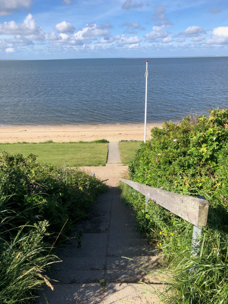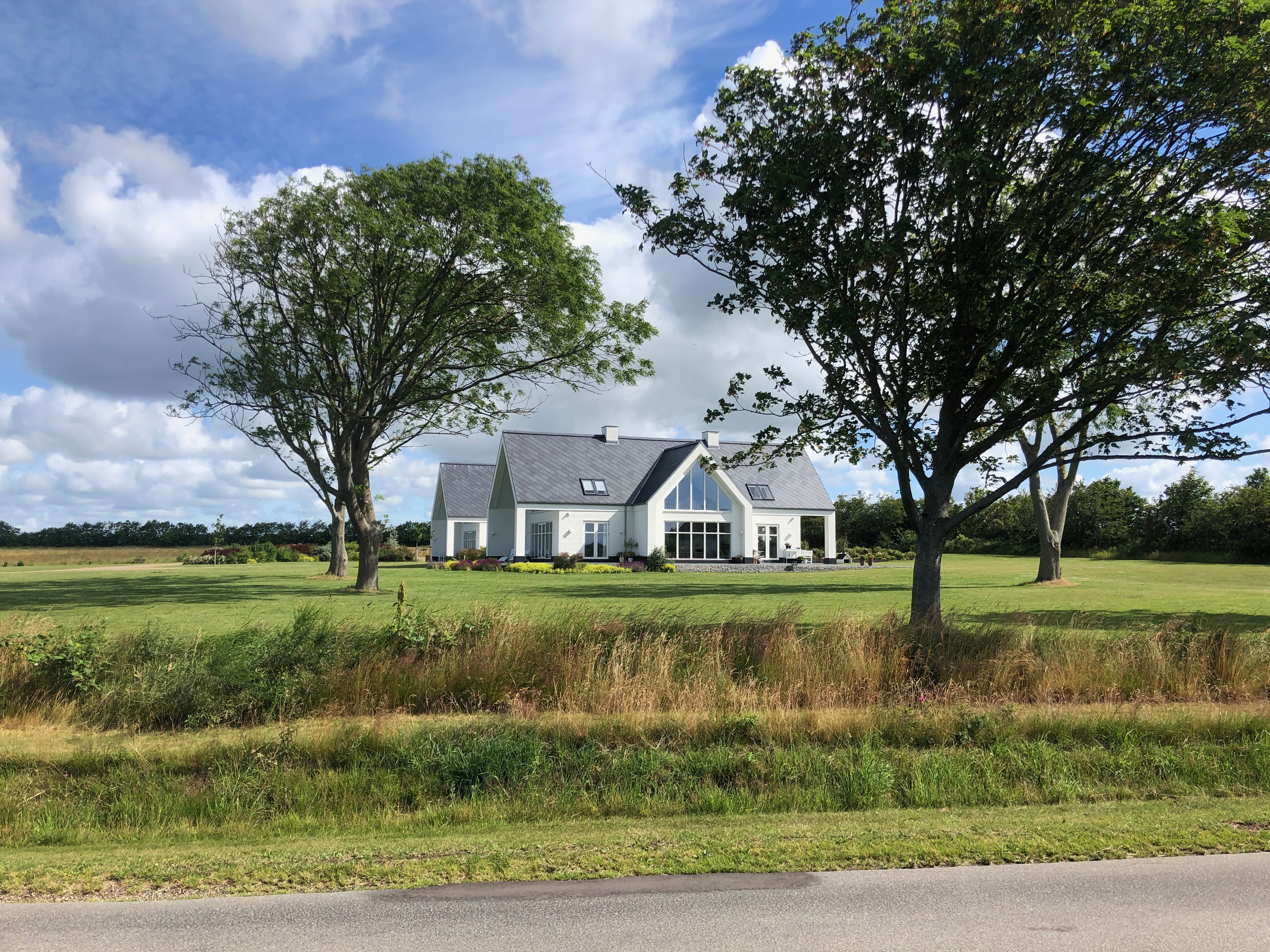 On prend le petit-déjeuner dans la salle commune, située dans le bâtiment de la réception – où il n’y avait personne hier, les clés étaient disponibles dans un petit coffre à code. Ensuite, peu avant 9h, on se met en route. On fait quelques kilomètres pour rejoindre la mer, puis on longe la route qui la longe (ben oui) jusqu’à ce qu’on arrive à un magnifique front de mer. Il n’y a pas un chat, et l’architecture est vraiment curieuse : beaucoup de constructions très modernes, et un peu plus loin, une fois rentrés un peu dans l’intérieur des terres, d’énormes baraques, parfois très prétentieuses, parfois pleines de charme, mais en tout cas tellement spacieuses qu’on à peine à croire que ce sont des habitations privées.