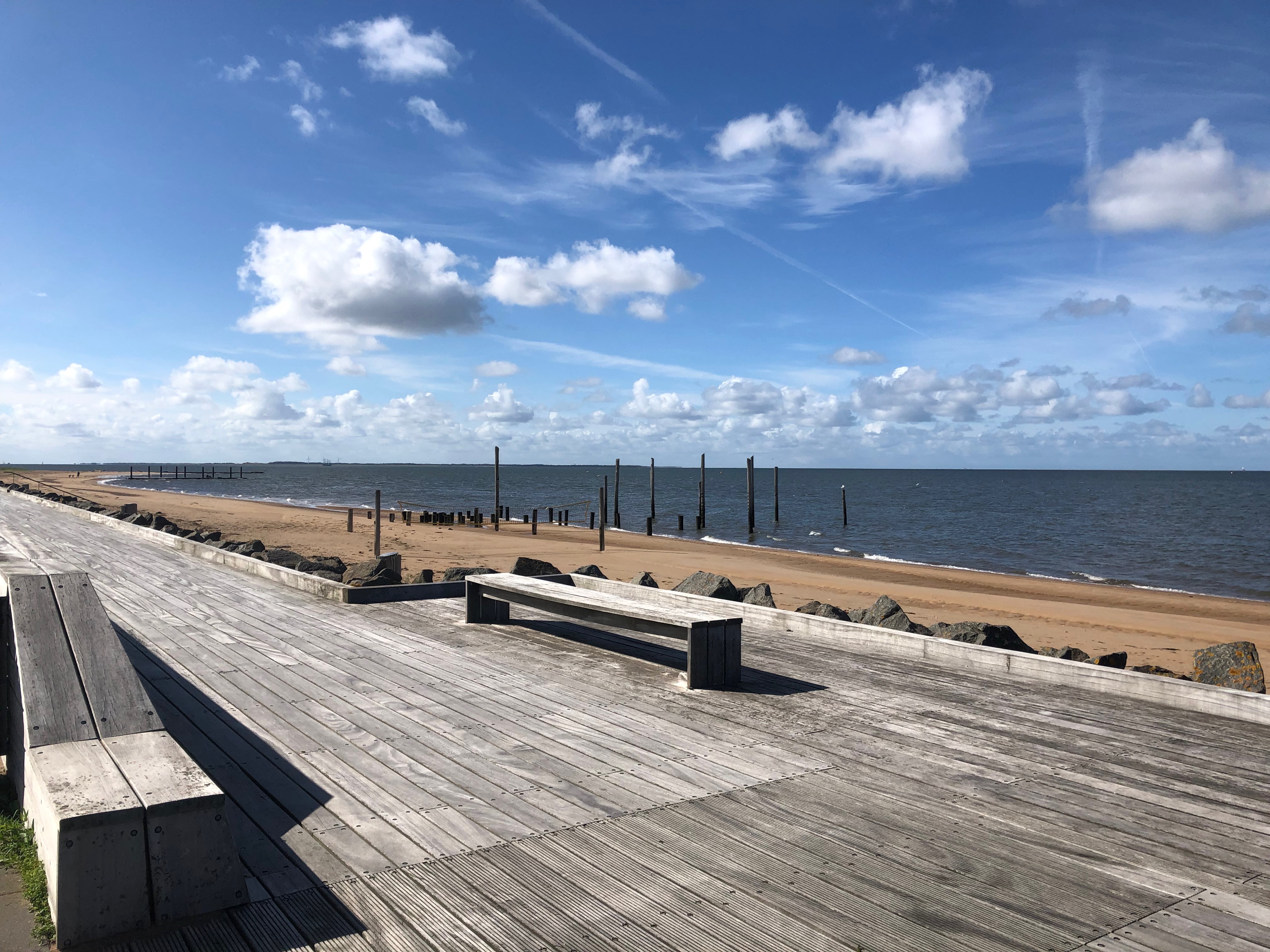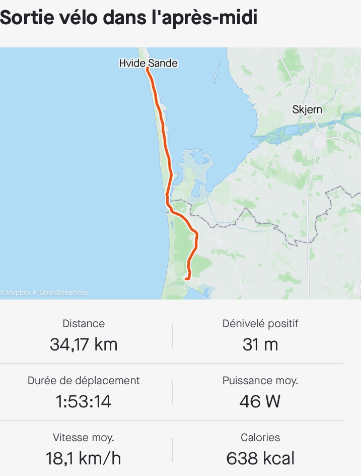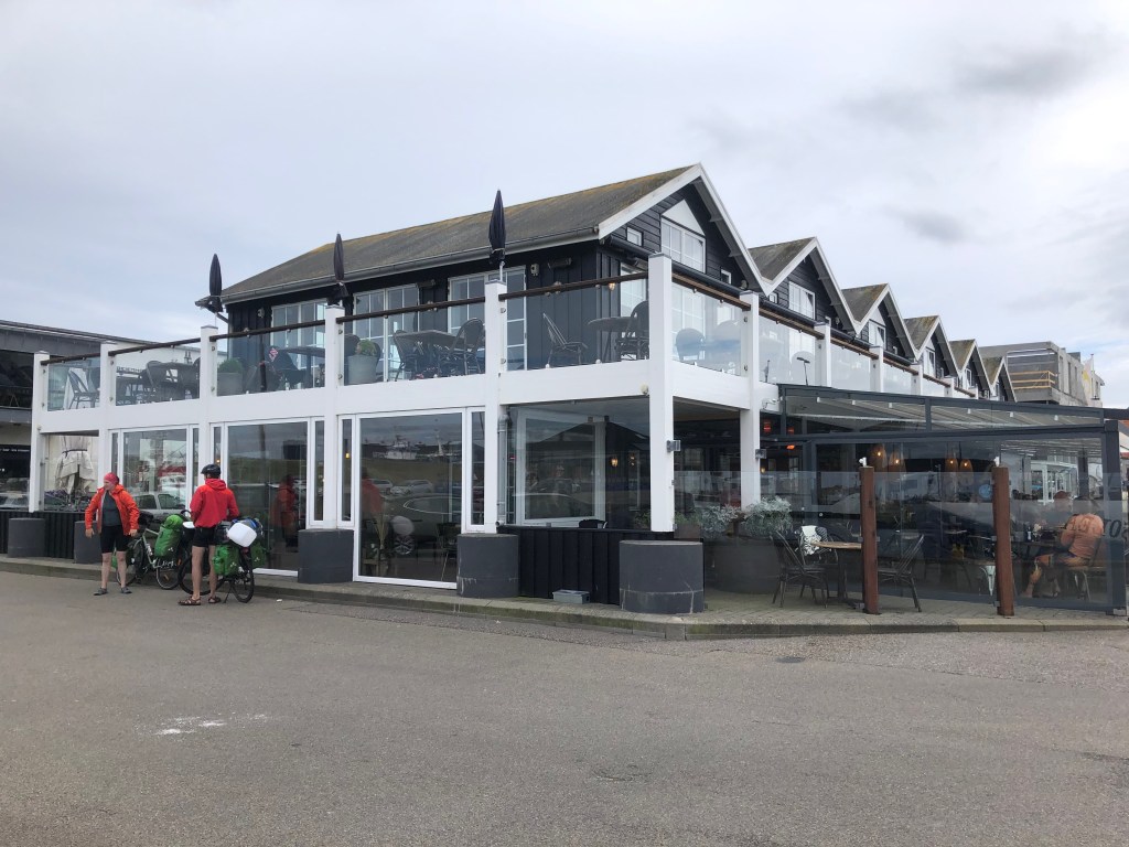Quand on arrive au port de Hvide Sand, il est 15h10, on a encore fait 35 km depuis notre pause de midi, et on commence à avoir mal un peu partout (le popotin, les genoux et les pieds surtout), même si sur cette étroite bande de terre où se trouve Hvide Sande, on a le vent dans le dos. On s’installe donc dans l’établissement Marina, où on fait le point en buvant une boisson chaude. Philipp est tenté de réitérer le système d’hier (manger tôt, ici, et puis aller s’installer), moi je préfère la formule classique, et comme il est gentil, il accepte qu’on fasse comme je veux (NON, pas « comme toujours »).
