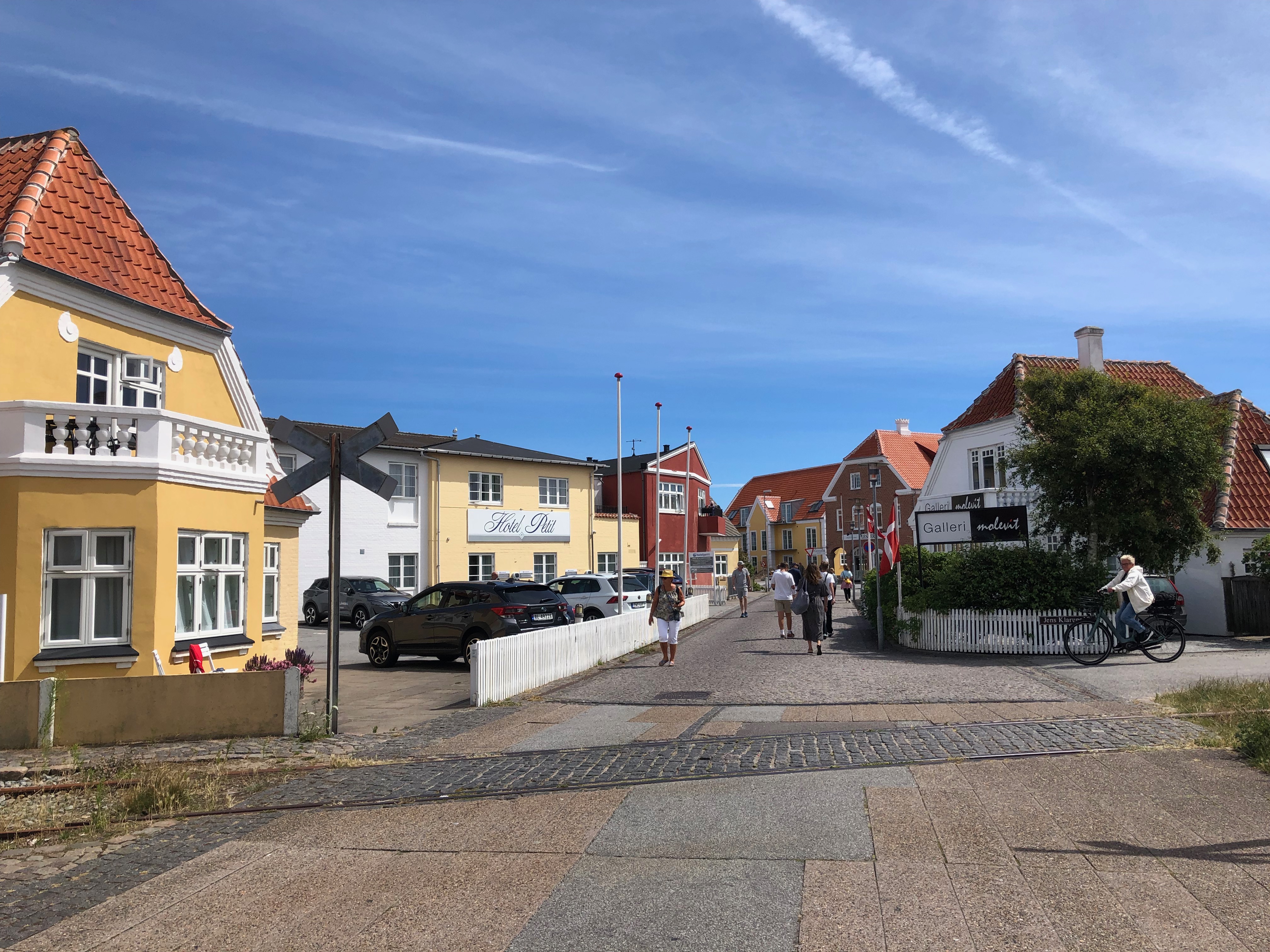 Notre chambre n’étant pas encore prête, on a déposé nos bagages et on est repartis sur des vélos considérablement allégés vers le centre de Skagen, situé à un kilomètre environ. Très joli, mais bondé, plein de magasins, de restaurants et de touristes, et d’ailleurs piétonnier.