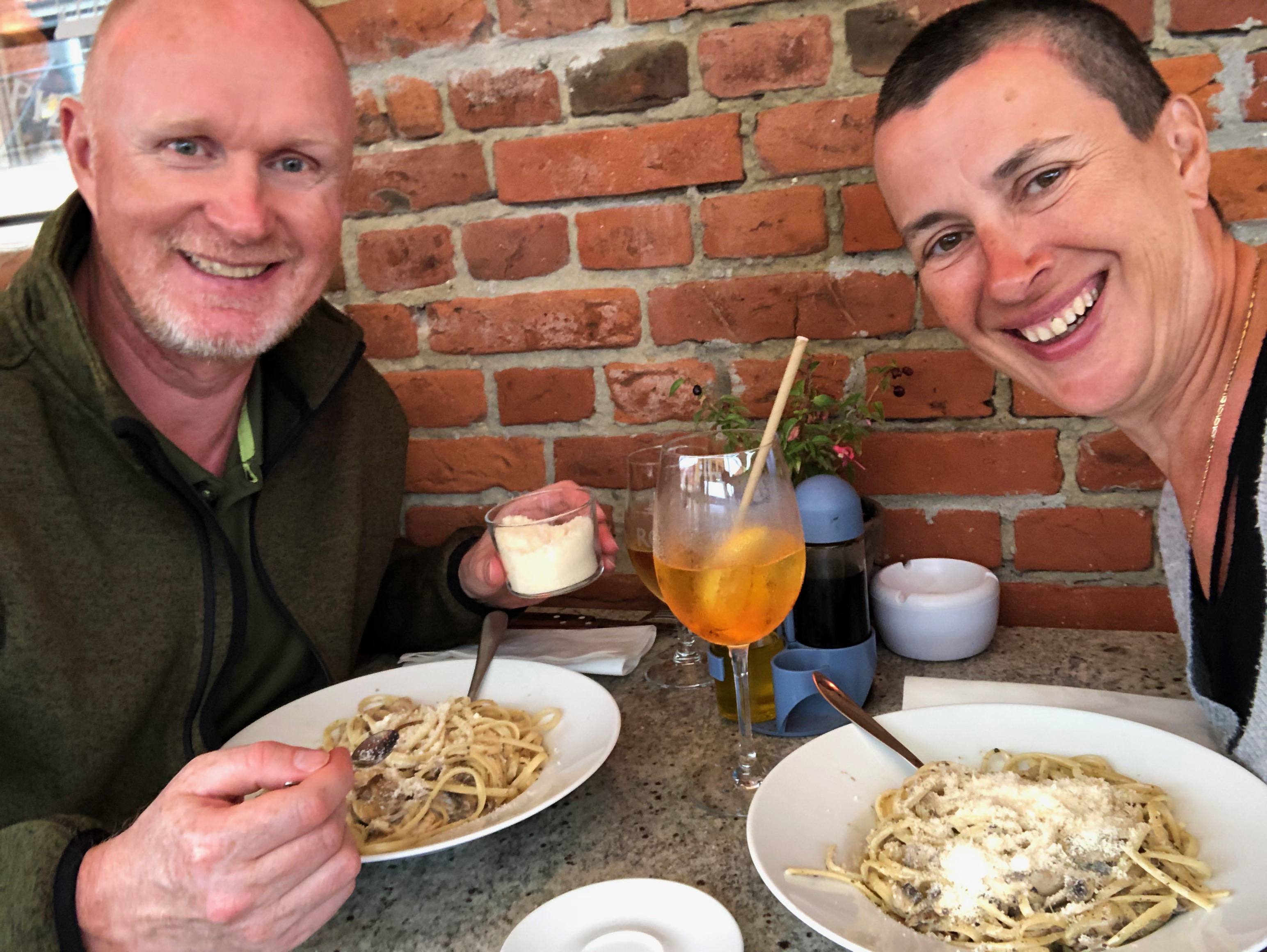 En fin d’après-midi on est donc repartis à pied vers le centre, où on a longuement flâné (Philipp s’achetant au passage deux chemises) afin de choisir notre restaurant du soir. On a finalement jeté notre dévolu sur le Firenze, un « authentique restaurant italien » qui me permettait, pour une fois, de ne manger ni pizza ni burger végétarien. Les pains à l’ail en entrée se sont avérés très décevants, et l’apérol spritz décidément toujours très inférieur aux standards belges, par contre le spaghetti aux champignons, ail et huile de truffe était délicieux.