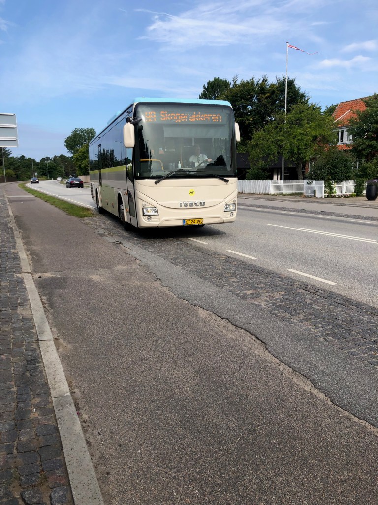 Bref, on a pris le 99, un bus (en fait plutôt un car) un peu irritant, car il vient de Blokhus (et Hune) et passe par Hirtshals, et les plus attentifs se souviennent qu’on a logé à Hune puis à Hirtshals. Ce bus fait donc en 2h ce que nous avons fait en deux jours.