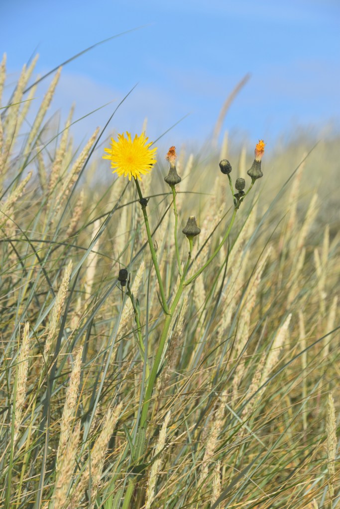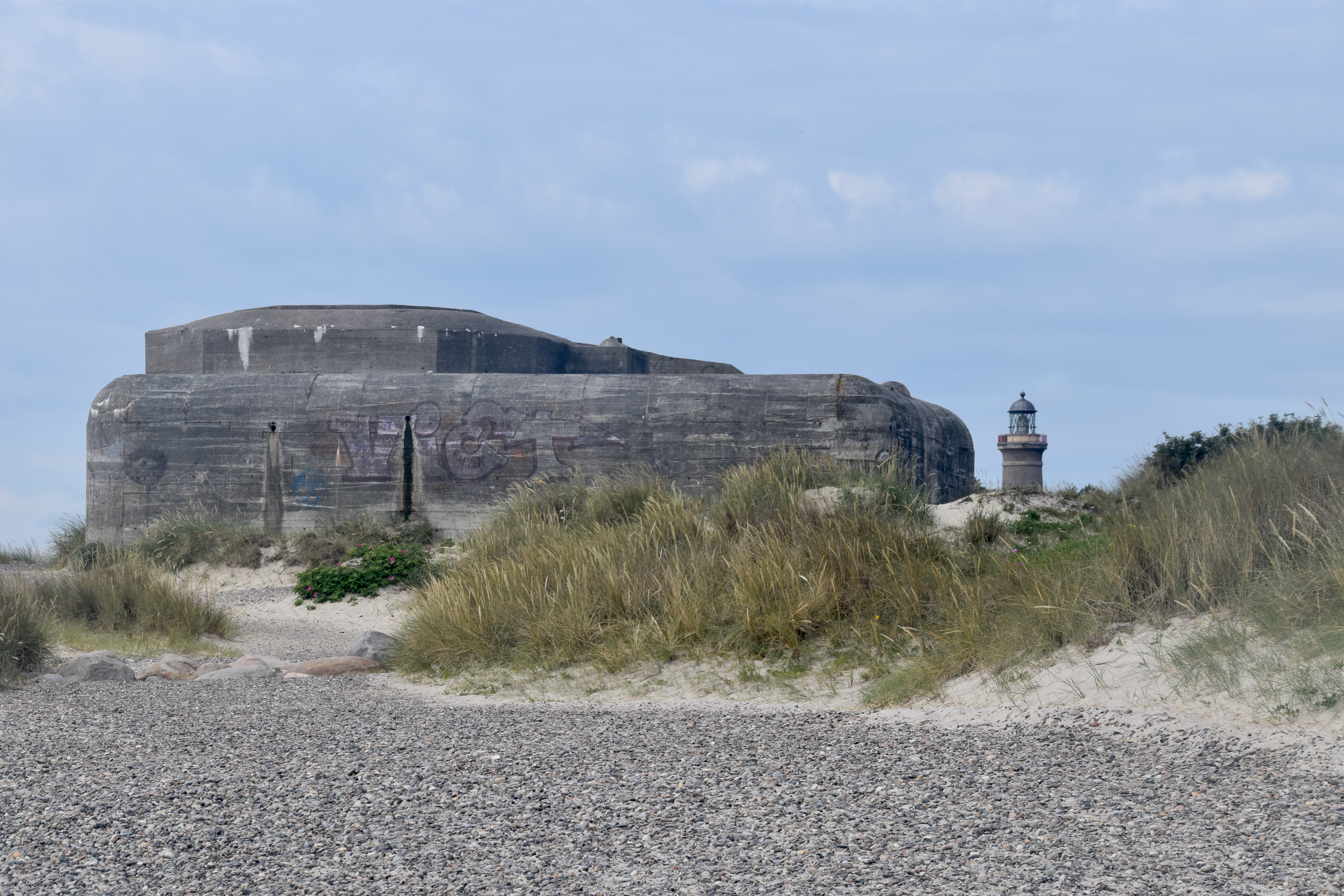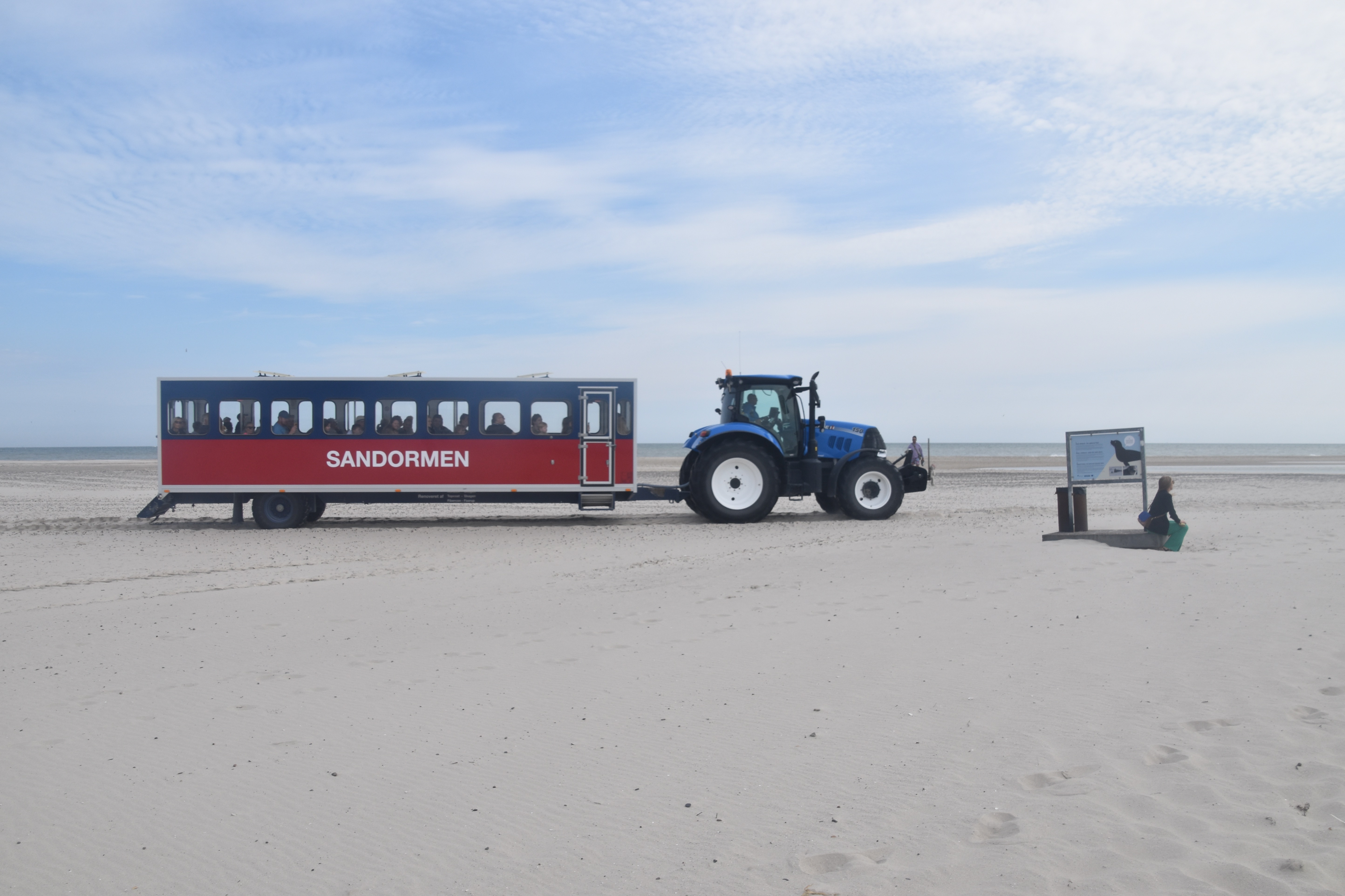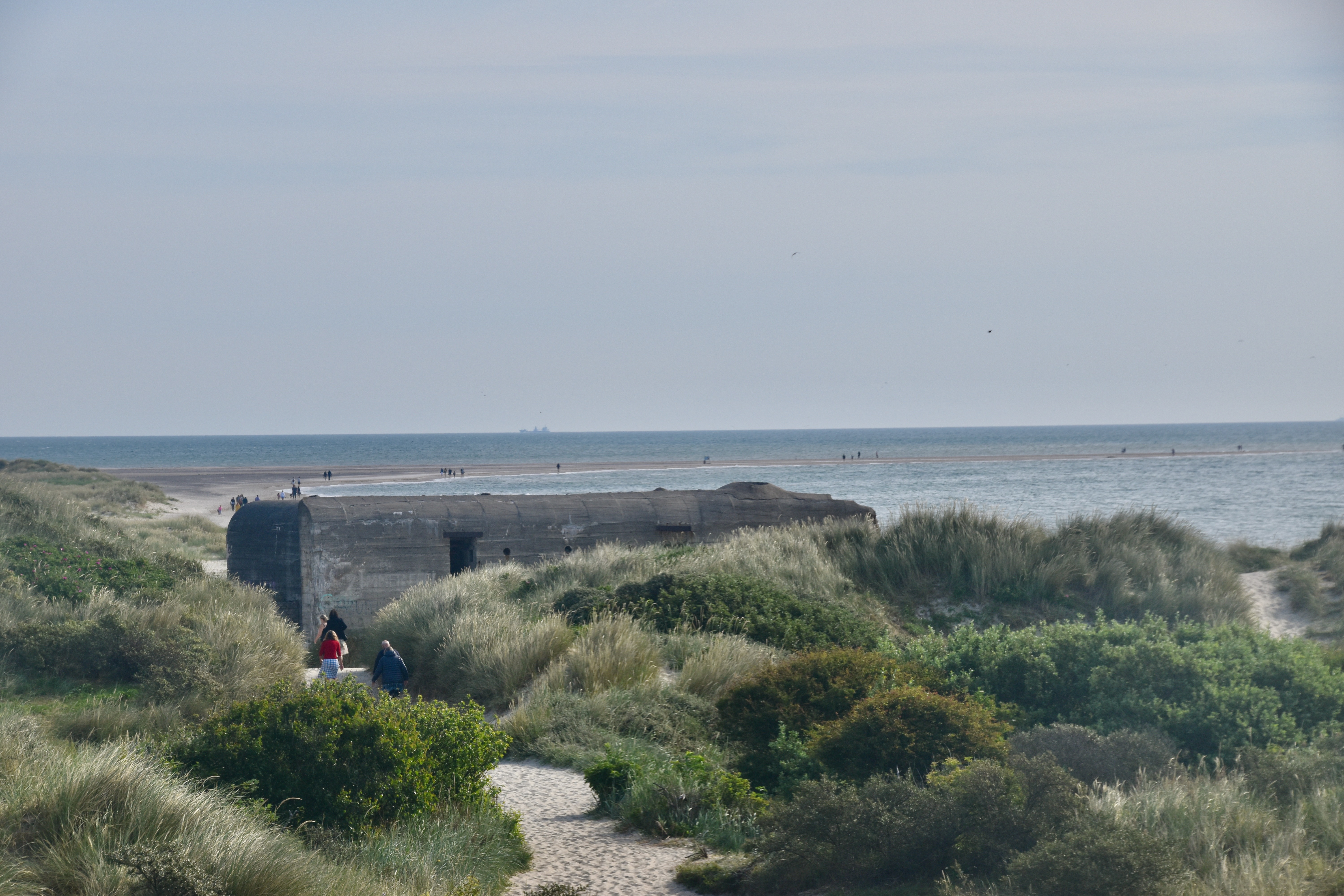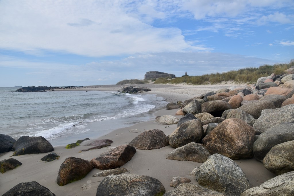 Du terminus du 99, on a emprunté le chemin balisé qui nous amène dans les dunes, histoire de découvrir quelques vestiges architecturaux majeurs de la seconde guerre mondiale (des bunkers), puis la plage qui nous fait longer la Baltique jusqu’à la pointe où elle se confond avec la mer du Nord. Il n’y avait pas encore trop de monde à cette heure-là, mais lorsque nous avons fait demi-tour, un tracteur arrivait par la mer du Nord, tractant un bus plein de touristes… et au terminus du bus, deux autres tracteurs étaient déjà prêts à partir, remplis eux aussi de leur contingent de touristes. On avait donc bien fait !