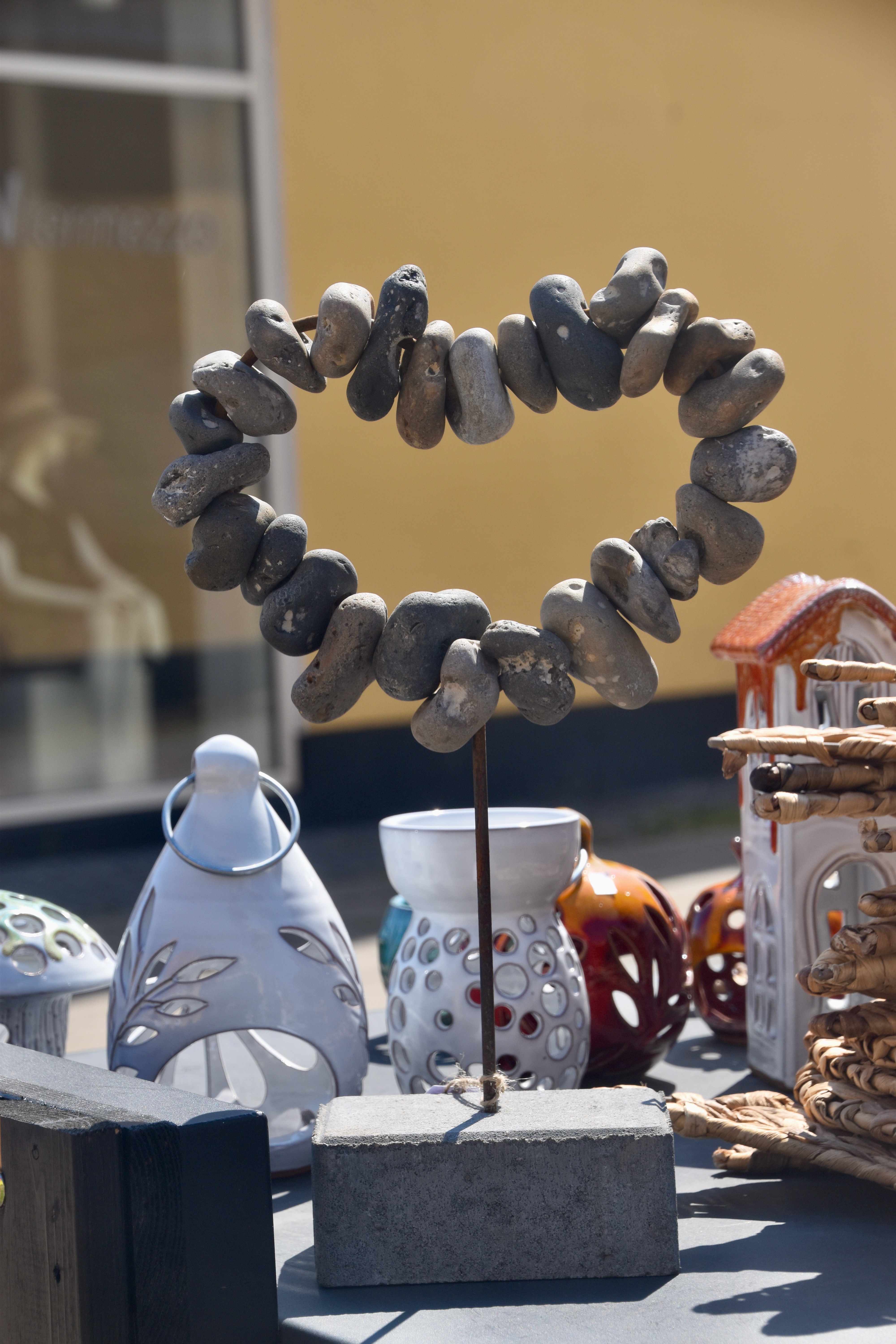 Je vous ai déjà parlé des cailloux peints, mais l’amour des Danois pour les cailloux semble aller au-delà de ça, car on trouve quantité de brols plus ou moins artistiques en cailloux, et notamment des sortes de colliers de cailloux qui sont parfois simplement suspendus (dans quel but ?) parfois disposés artistiquement pour faire des formes diverses.