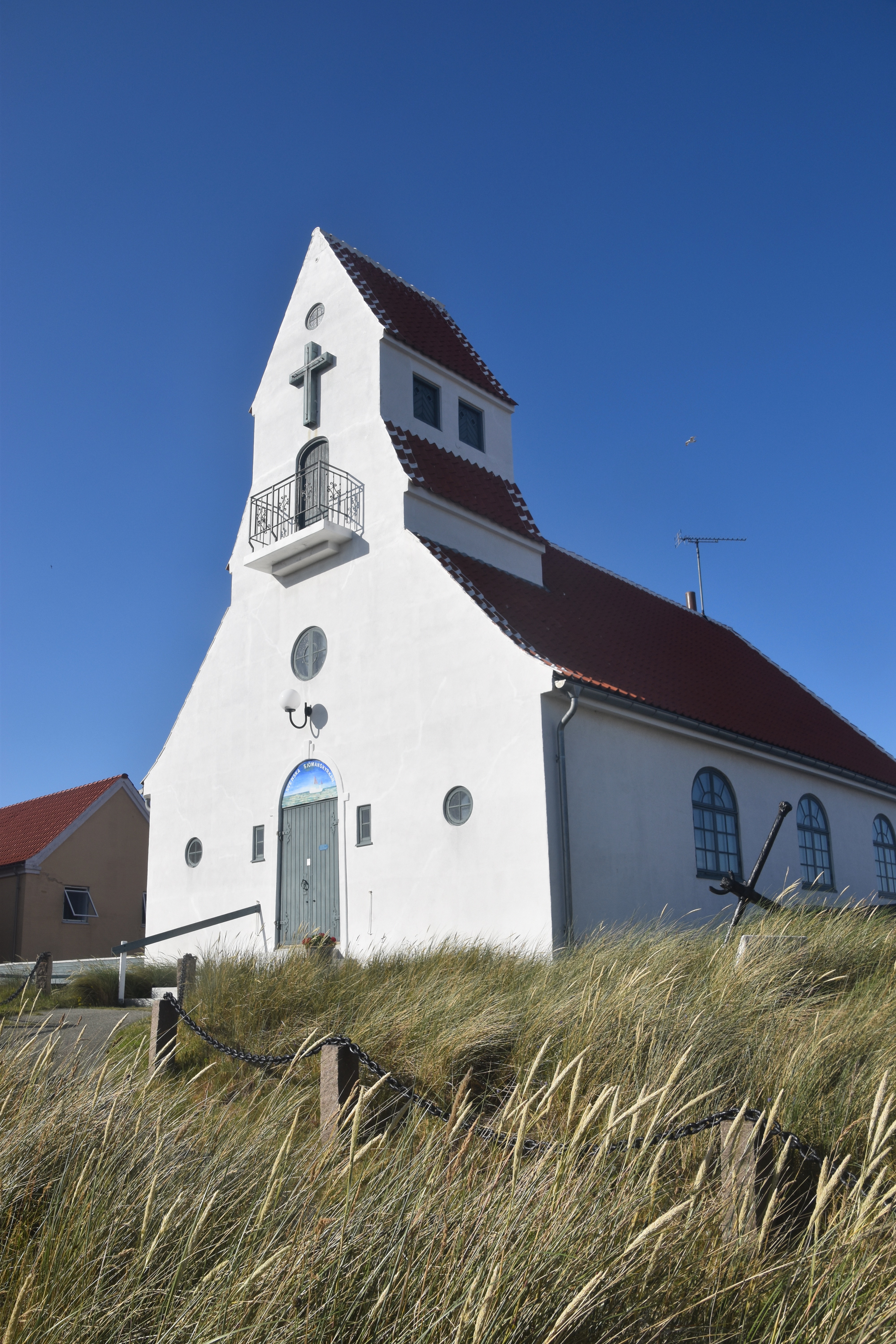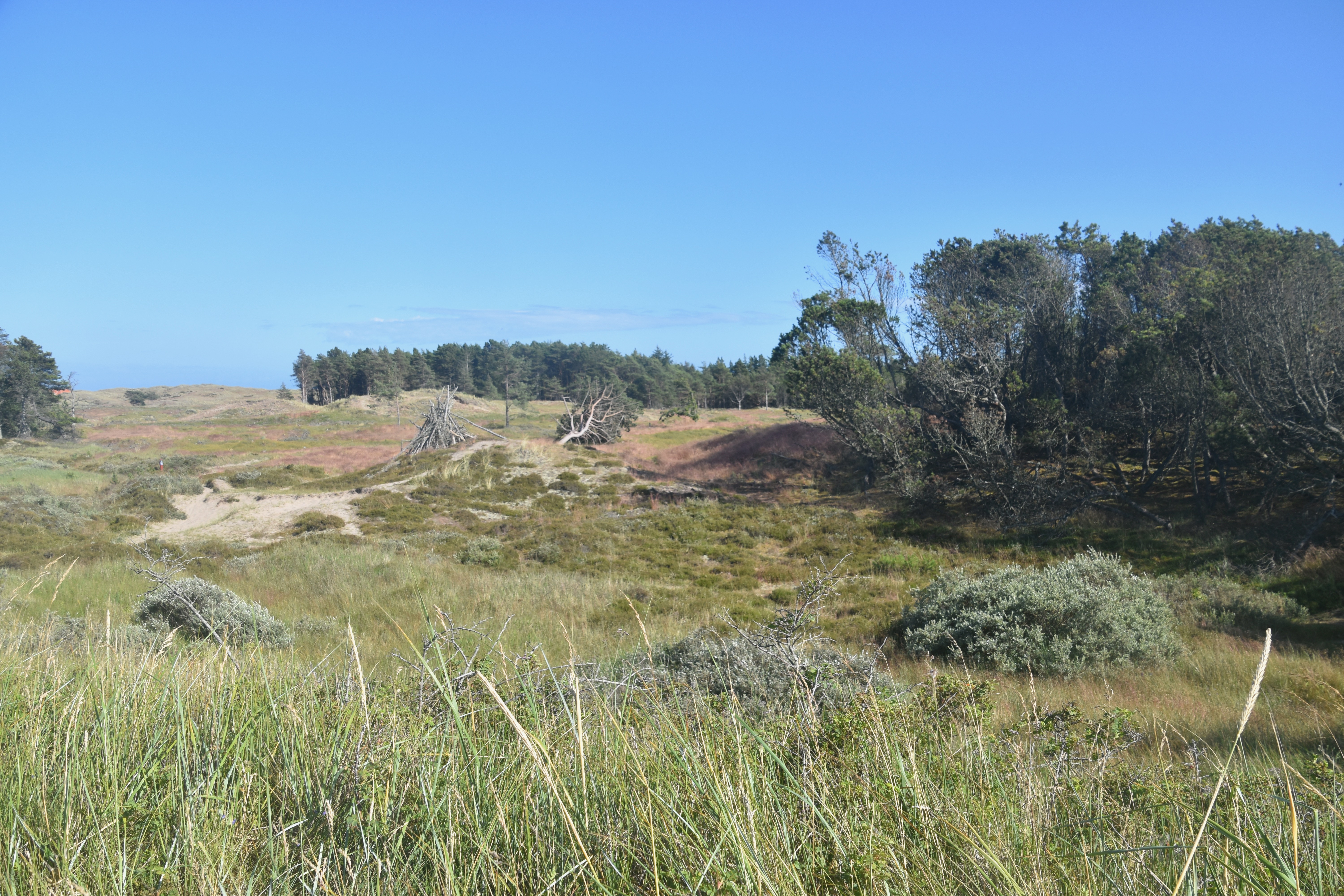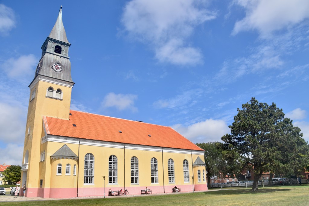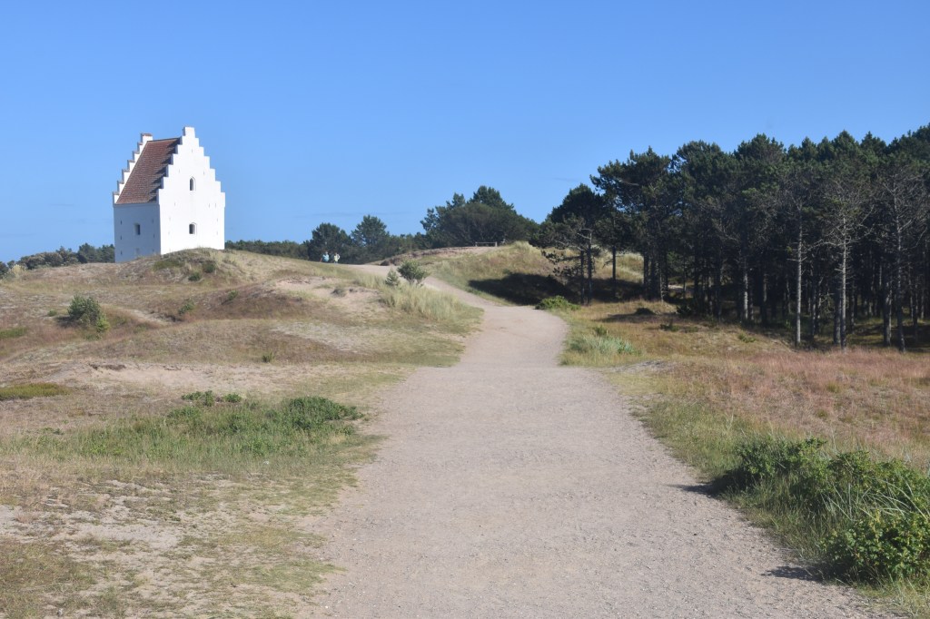 De retour à l’hôtel, j’ai profité de la sieste de Philipp pour relire le manuscrit de mon prochain livre (moment pub : sortie le 6 septembre !), puis on est repartis, en direction cette fois de la Tilsandede Kirke, autrement dit l’église ensablée. Pour ça, on a pris le bus n°1, puis on a marché une vingtaine de minutes. Les conducteurs de bus sont vraiment gentils ici: celui-ci, quand on lui a dit où on voulait aller, nous a conseillé de plutôt prendre un autre bus pour avoir moins de trajet à faire à pied (sauf qu’on le savait déjà, mais l’intention était là). Et comme rien n’indique, dans le bus, le nom de l’arrêt suivant, ils s’arrêtent là où on leur a dit qu’on voulait descendre et nous font signe. Celui-ci est même descendu de son bus pour nous indiquer l’itinéraire à suivre à pied pour arriver à cette fameuse église ensablée, dont l’histoire est vraiment très triste : elle date de la fin du 14è siècle, et c’est à l’époque un des plus grands édifices religieux du Jutland. Mais à partir du 16è siècle, le sable commence à envahir l’église, puis les murs du cimetière adjacent. En quelques dizaines d’années, malgré les efforts de la congrégation, l’église est envahie par le sable, tant et si bien qu’elle est détruite en 1795. Mais le roi Christian VII ordonne que le clocher soit préservé et utilisé comme phare. (Merci Wikipédia)