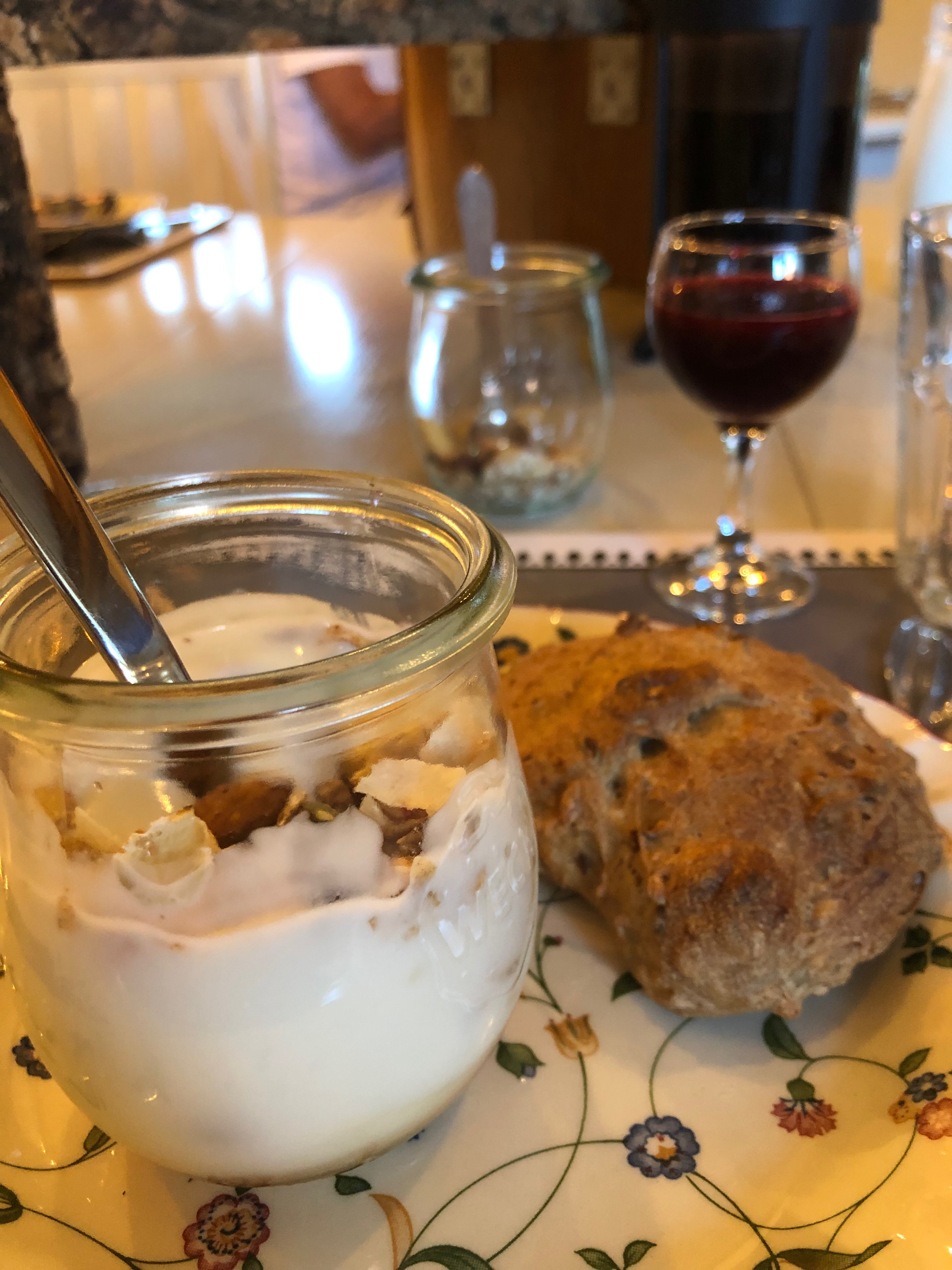 Finalement, c’était le jour « buffet », avec un seul buffet où je me suis gavée de gratin dauphinois, de petits pois, de fêta, d’olives noire et de salade. Eh bien je n’avais plus si bien mangé depuis longtemps ! Pareil pour Philipp, mais dans un style nettement plus carnivore !