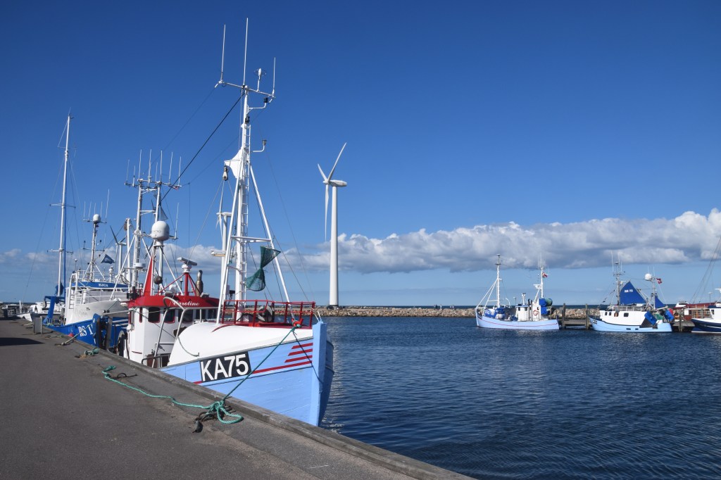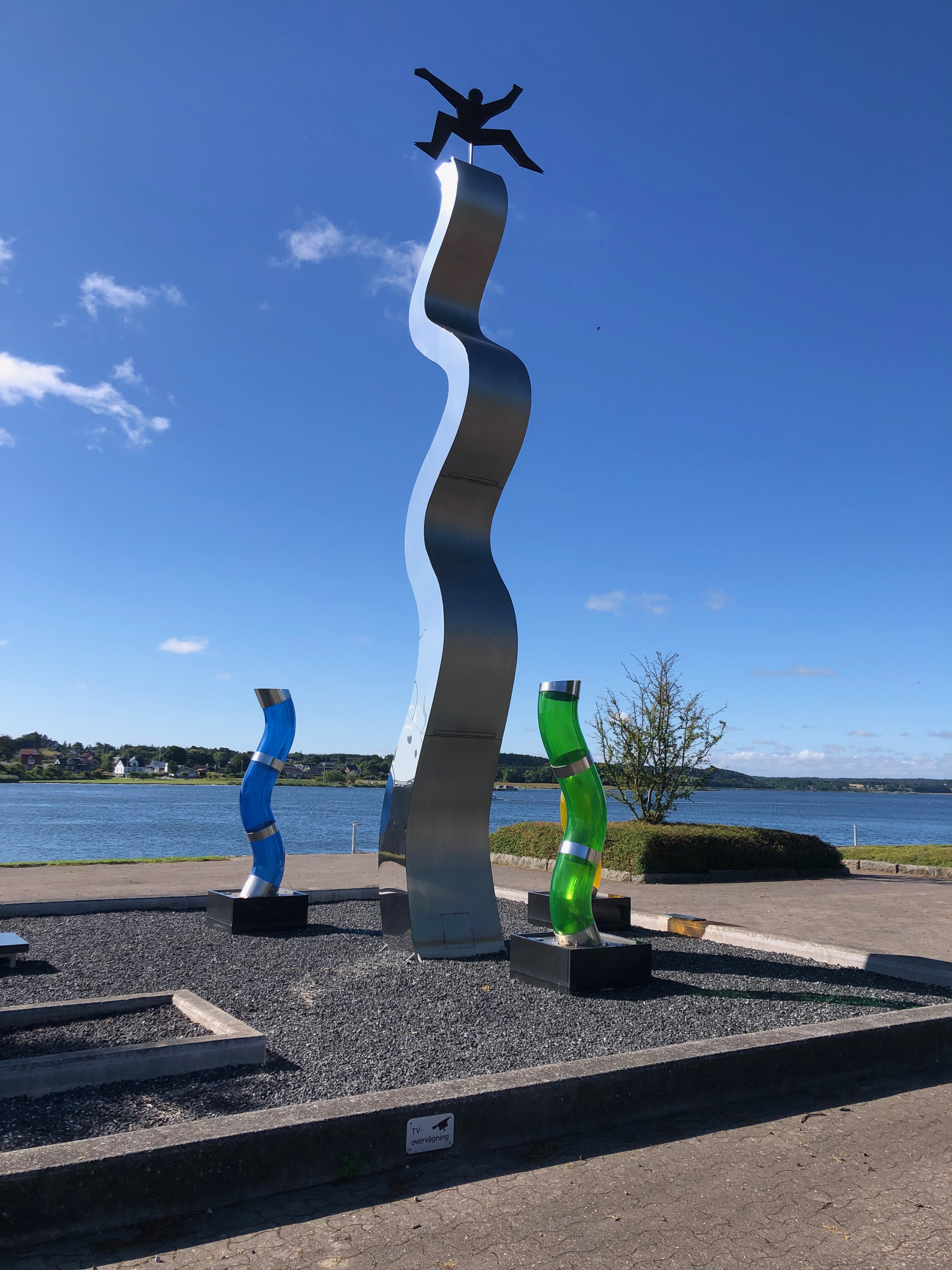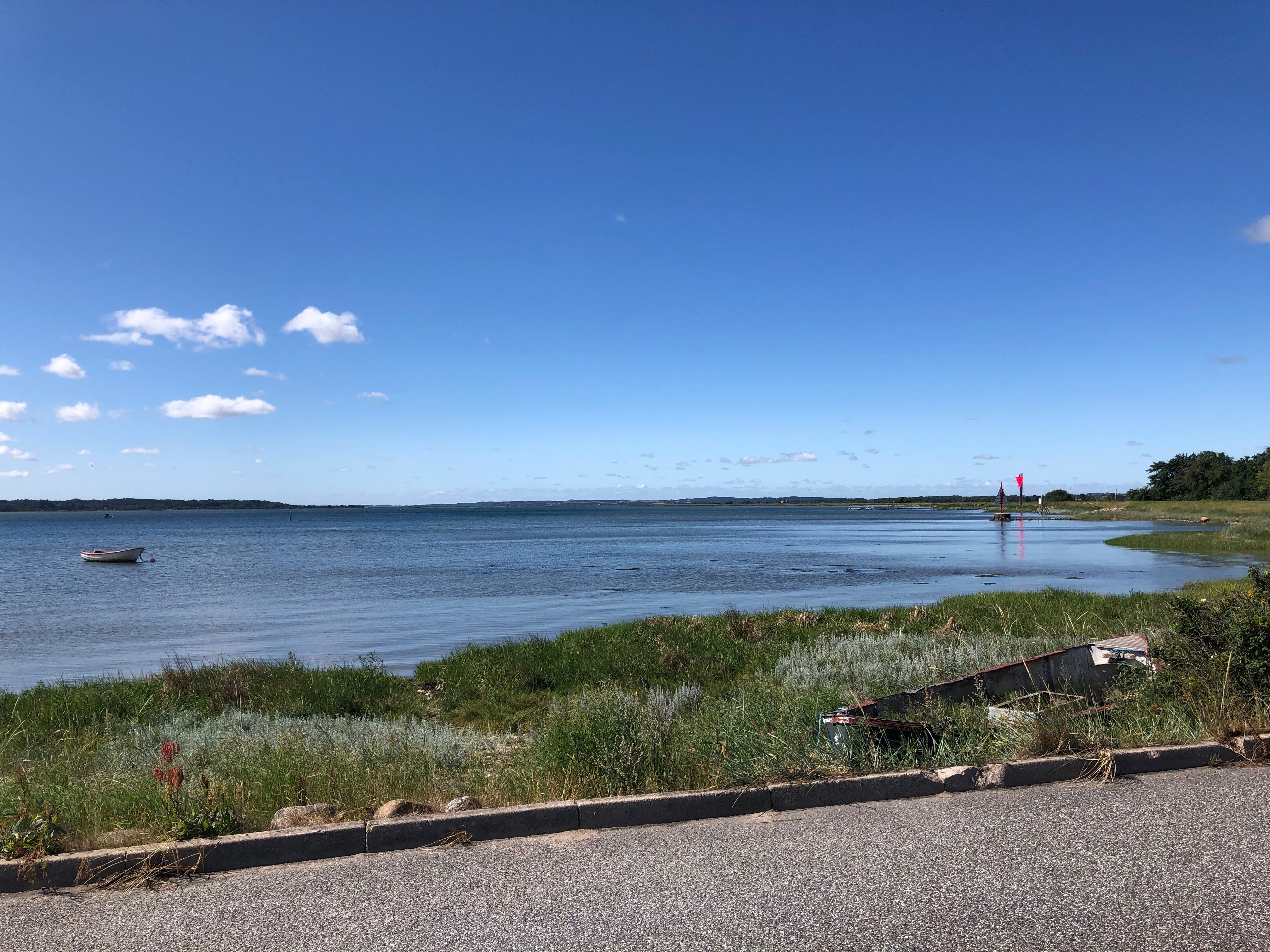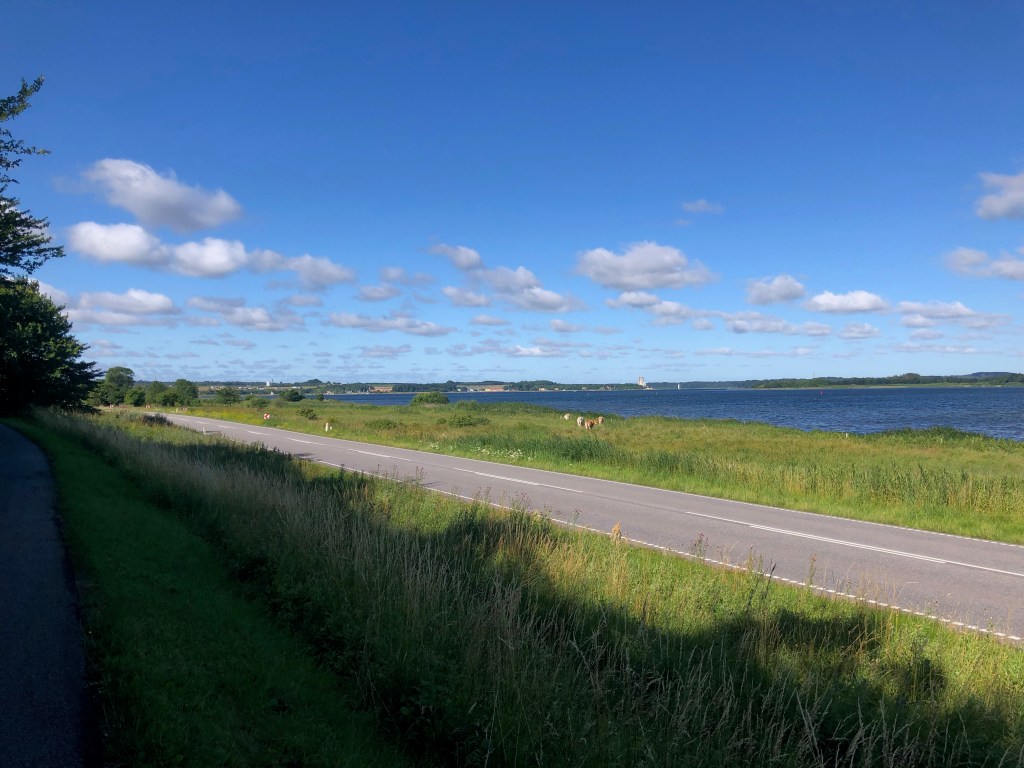 La journée, cela dit, s’annonce magnifique : le soleil brille, le ciel est bleu, il fait déjà assez chaud, et le vent ne souffle pas trop fort. On se met donc en route avec entrain, et on arrive rapidement à Hadsund (nous logions en réalité plutôt à Visborg hier, à quelques kilomètres de Hadsund), où on s’attend à prendre un bac, mais en fait c’est un pont au-dessus du Mariager Fjord, qu’on longe ensuite sur quelques kilomètres, avant de s’en éloigner pour emprunter une route assez vallonnée mais magnifique.