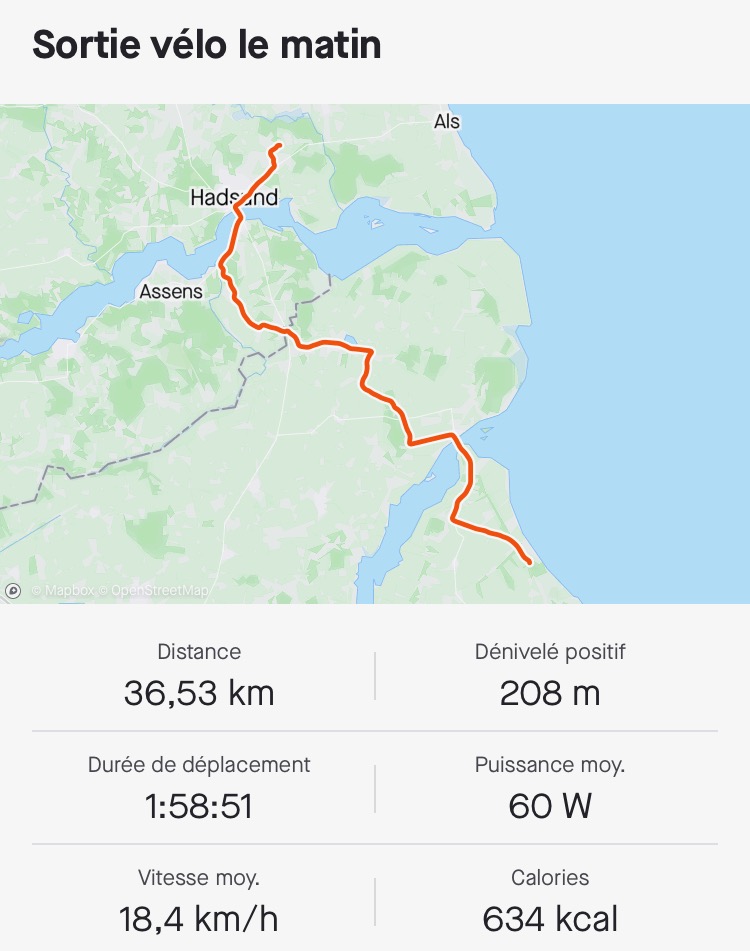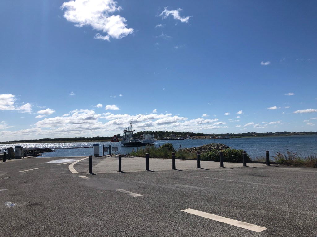 Mon pneu, par contre, ne rigole pas. Je pensais pouvoir me contenter de le regonfler tous les 10km, mais il ne tient même pas aussi longtemps. J’essaie de rouler plus vite qu’il ne se dégonfle, mais il est coriace… Lorsqu’on arrive à 11h au bac qu’on doit prendre à Udbyhøj, je l’ai déjà regonflé trois fois, et on n’a fait que 27km.