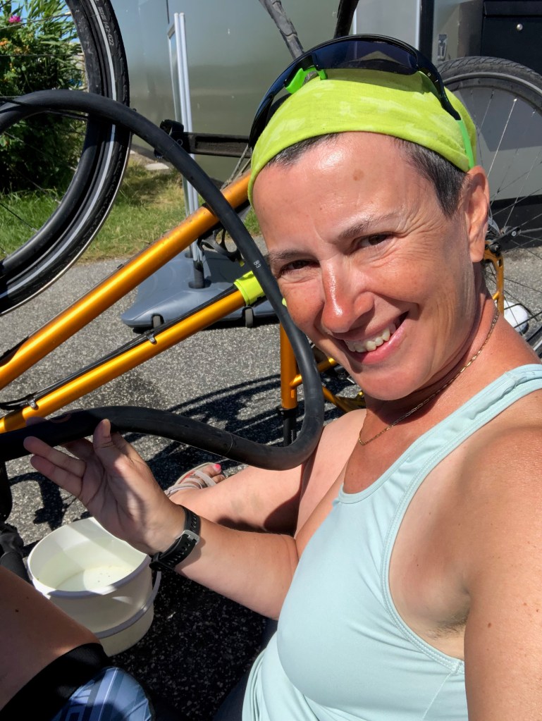 Il va donc falloir prendre le taureau par les cornes et réparer. Heureusement, une bassine d’eau traîne à proximité, et on n’a pas trop de mal à repérer l’origine de la fuite. Ensuite, une rustine, « Et klet, c’est collé », il est 11h40 et on peut repartir !