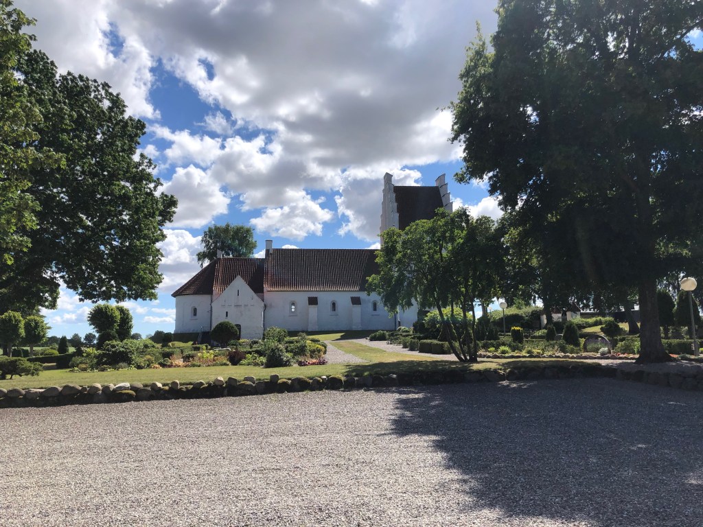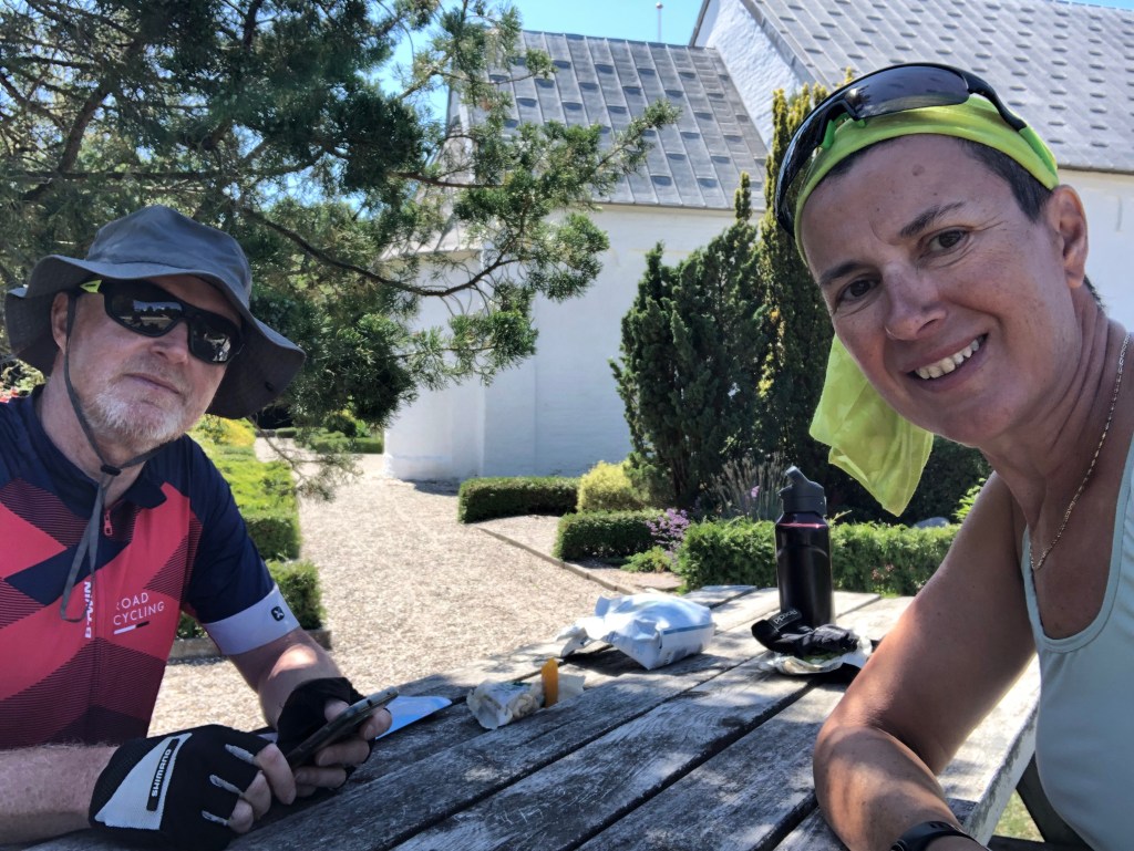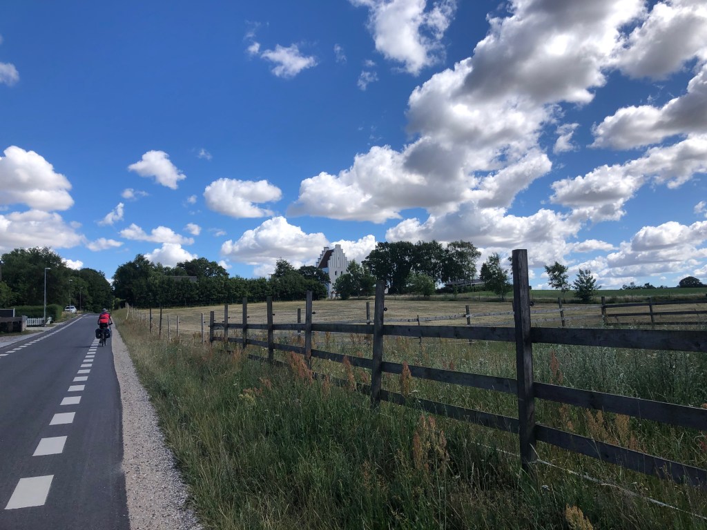 On ne croit plus vraiment à la la possibilité de trouver un resto ou même un supermarché, puisqu’il n’y a pas vraiment de ville ou de gros village dans la région qu’on traverse. On s’arrête donc à 12h30 dans le cimetière de l’église d’Estruplund, après avoir roulé 36km, pour un pique-nique frugal : noix de cajou et biscuits salés.