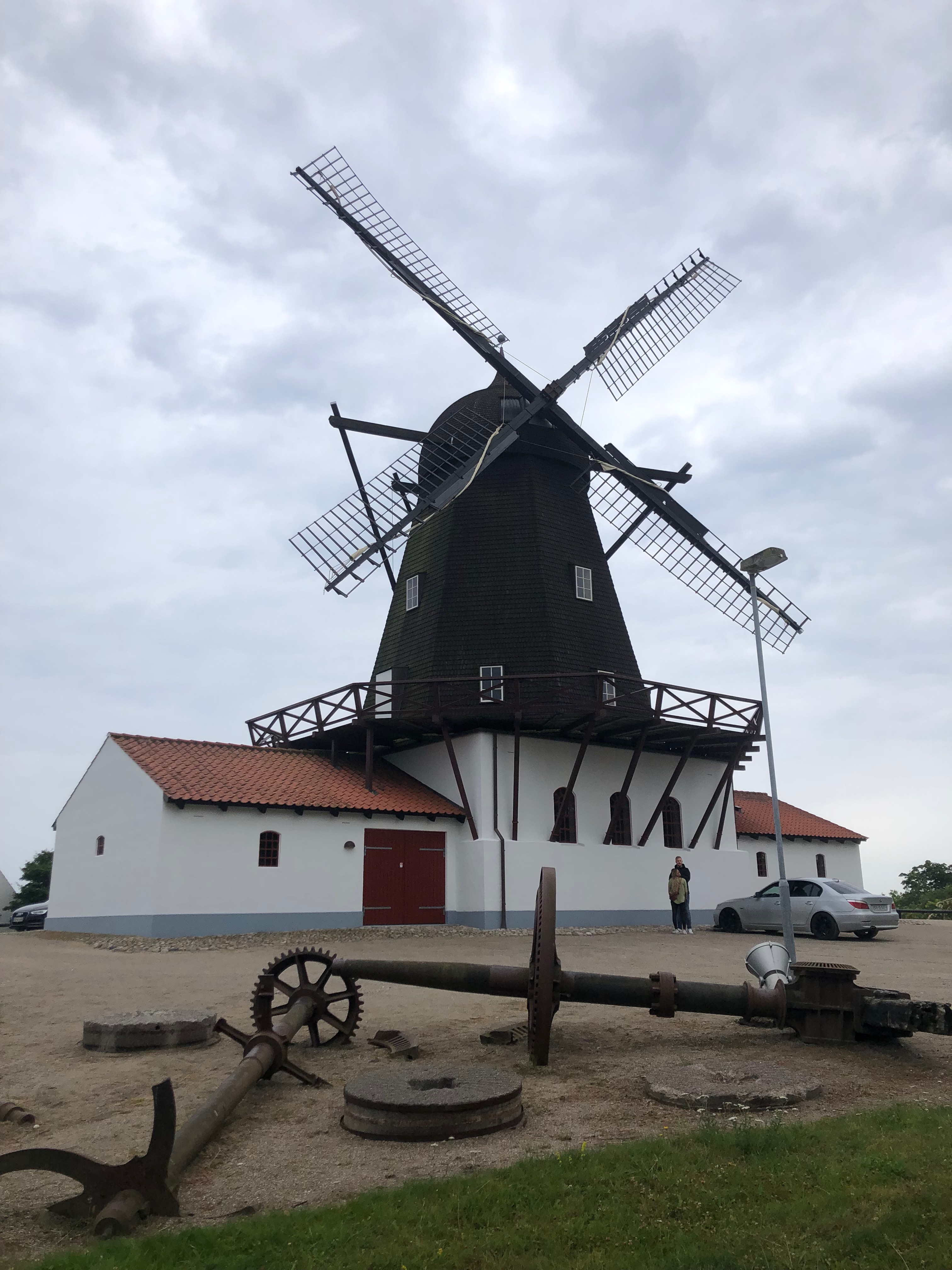 Ensuite, on se repose un peu, puis on repart à vélo vers le centre (prendre des informations à l’office du tourisme sur la meilleure manière d’aller en train jusqu’à Kiel demain), puis à la gare (découvrir qu’il est impossible d’acheter un billet pour le lendemain via les bornes automatiques, et qu’il n’y a évidemment pas de guichet), puis enfin vers le Baunhøj Mølle (un moulin qui surplombe Grenå et d’où on a du coup une vue splendide sur la ville).