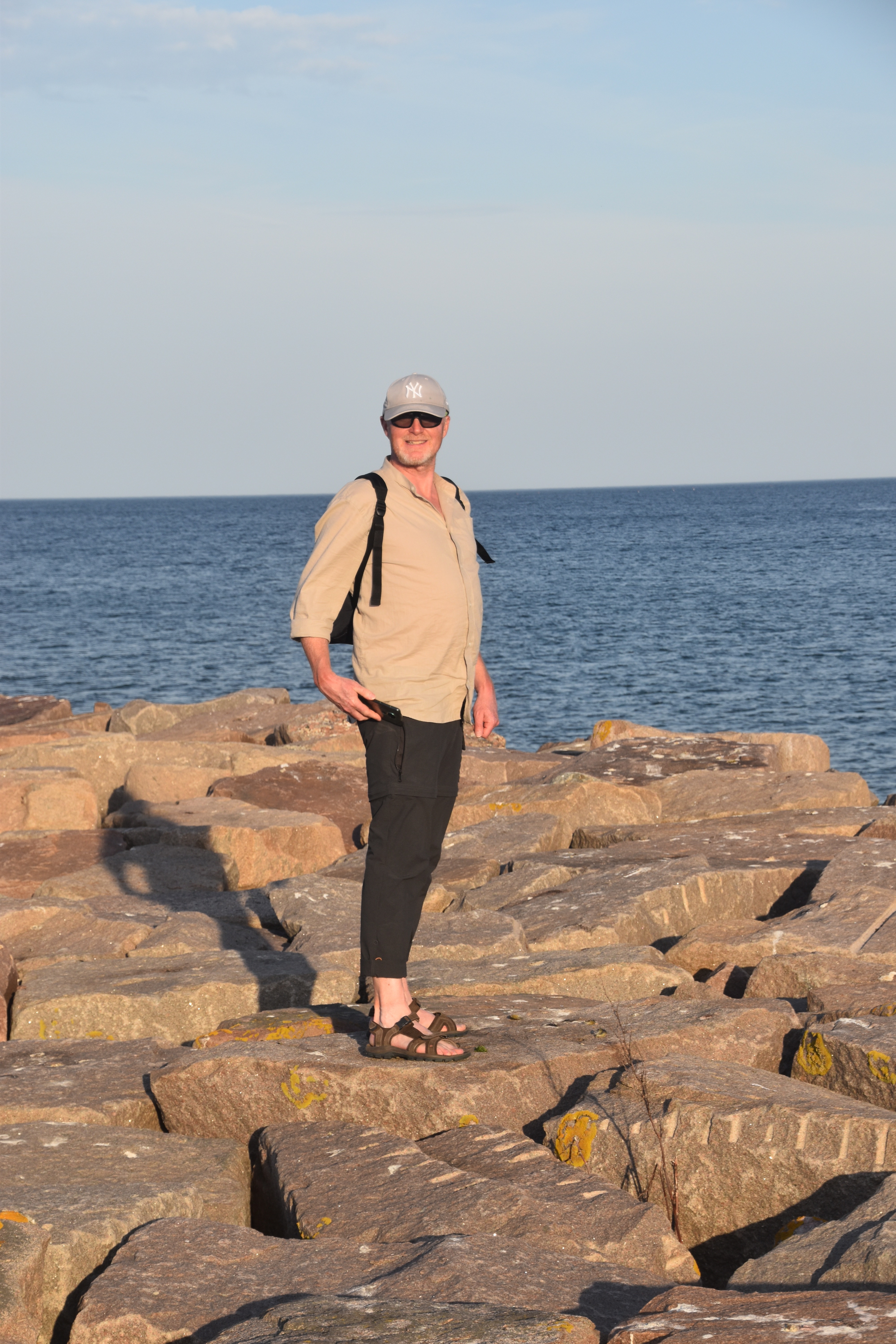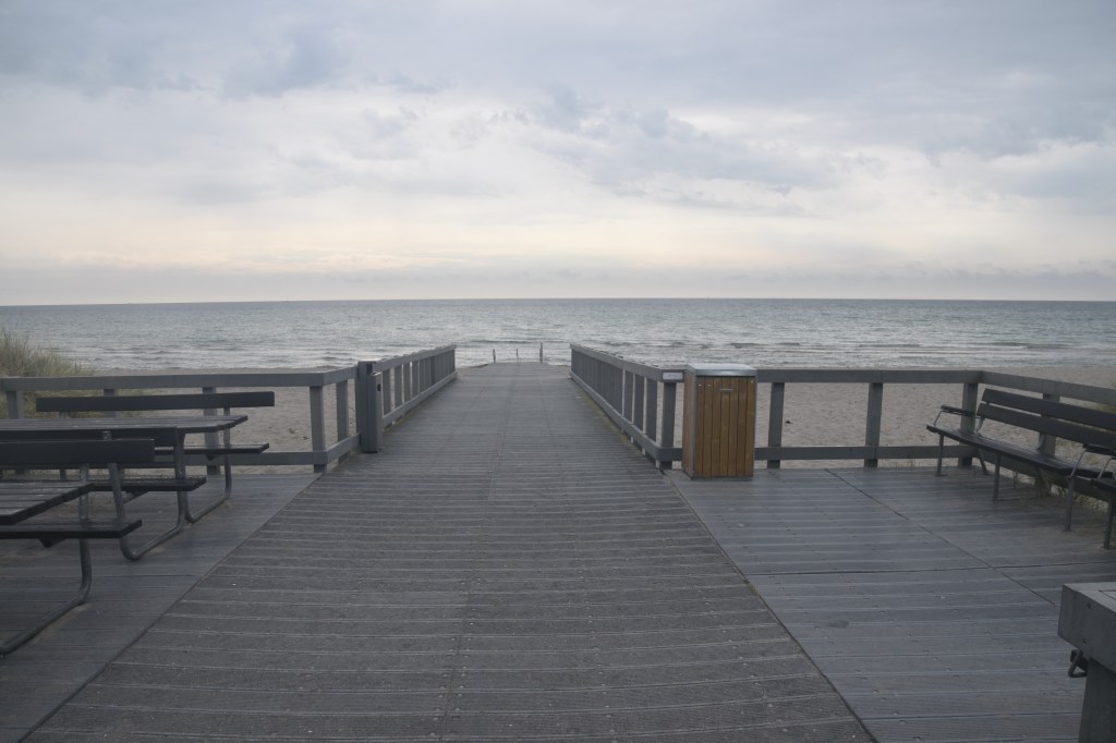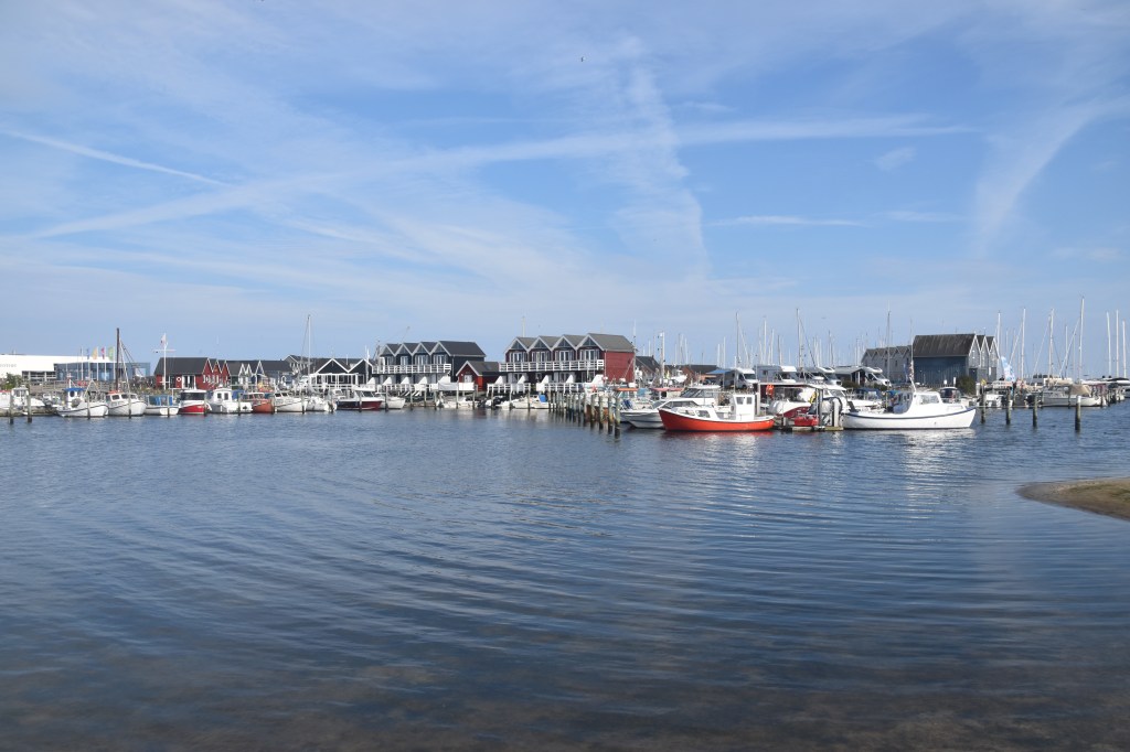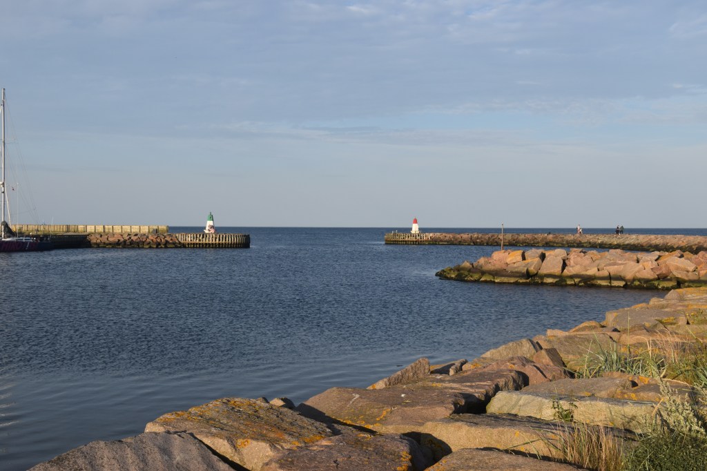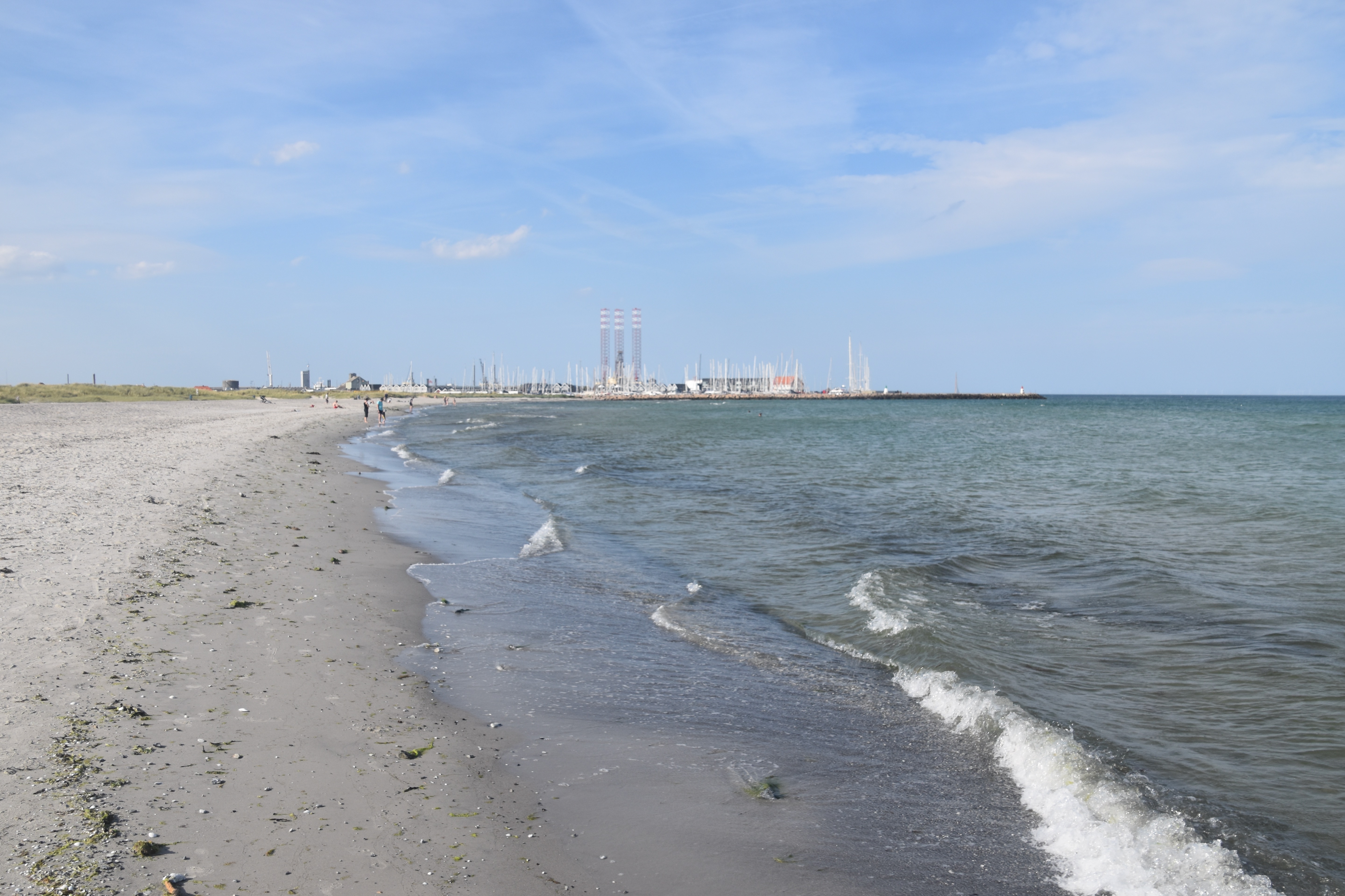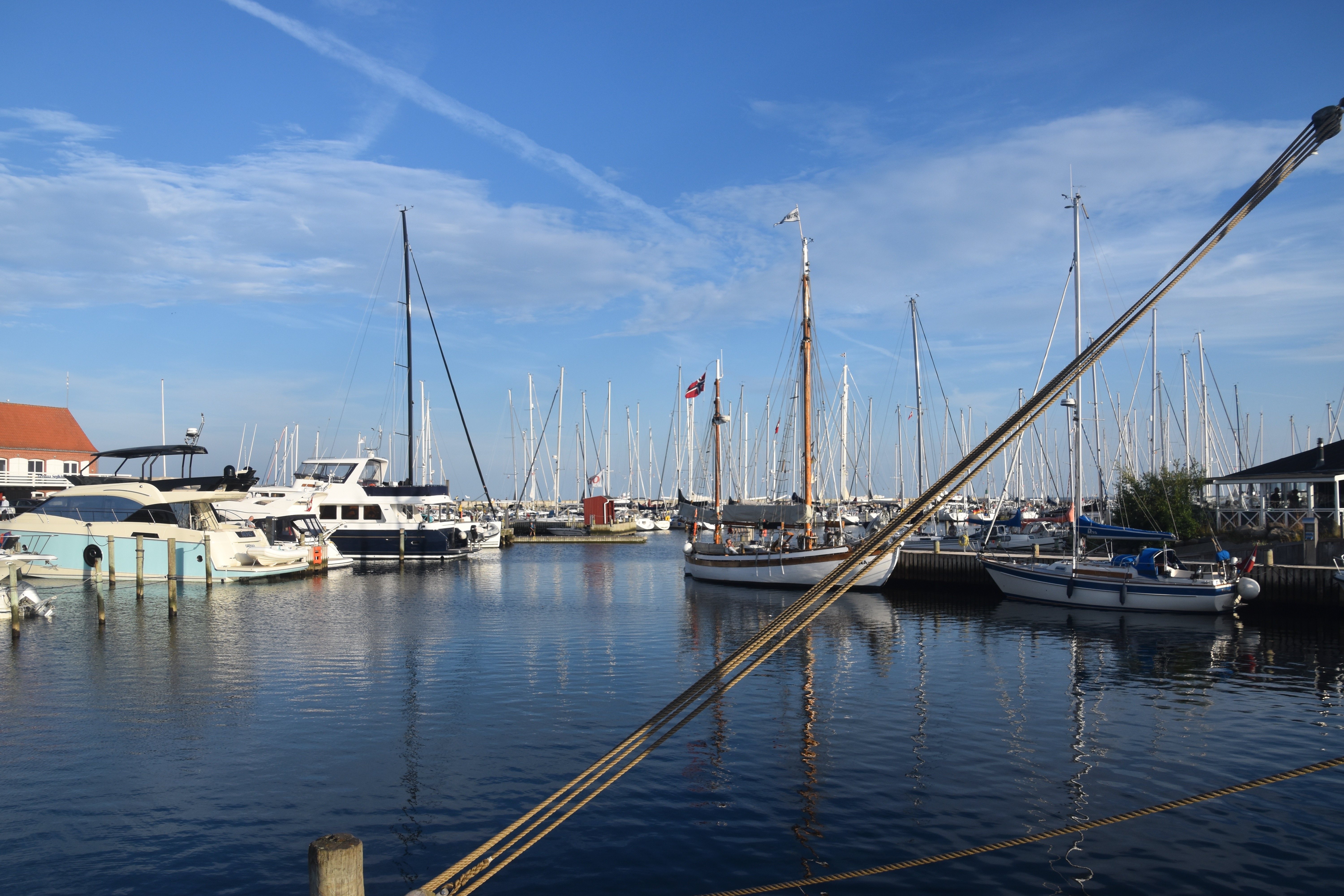 En fin de journée, après une petite pause à l’hôtel, on repart par la plage, à pied, en direction du port. Le soleil a percé et il fait maintenant magnifique, au point que je m’offre une mini-baignade dans le Kattegat. « Mini » parce qu’il y a tout de même beaucoup de méduses sur la plage et dans l’eau.