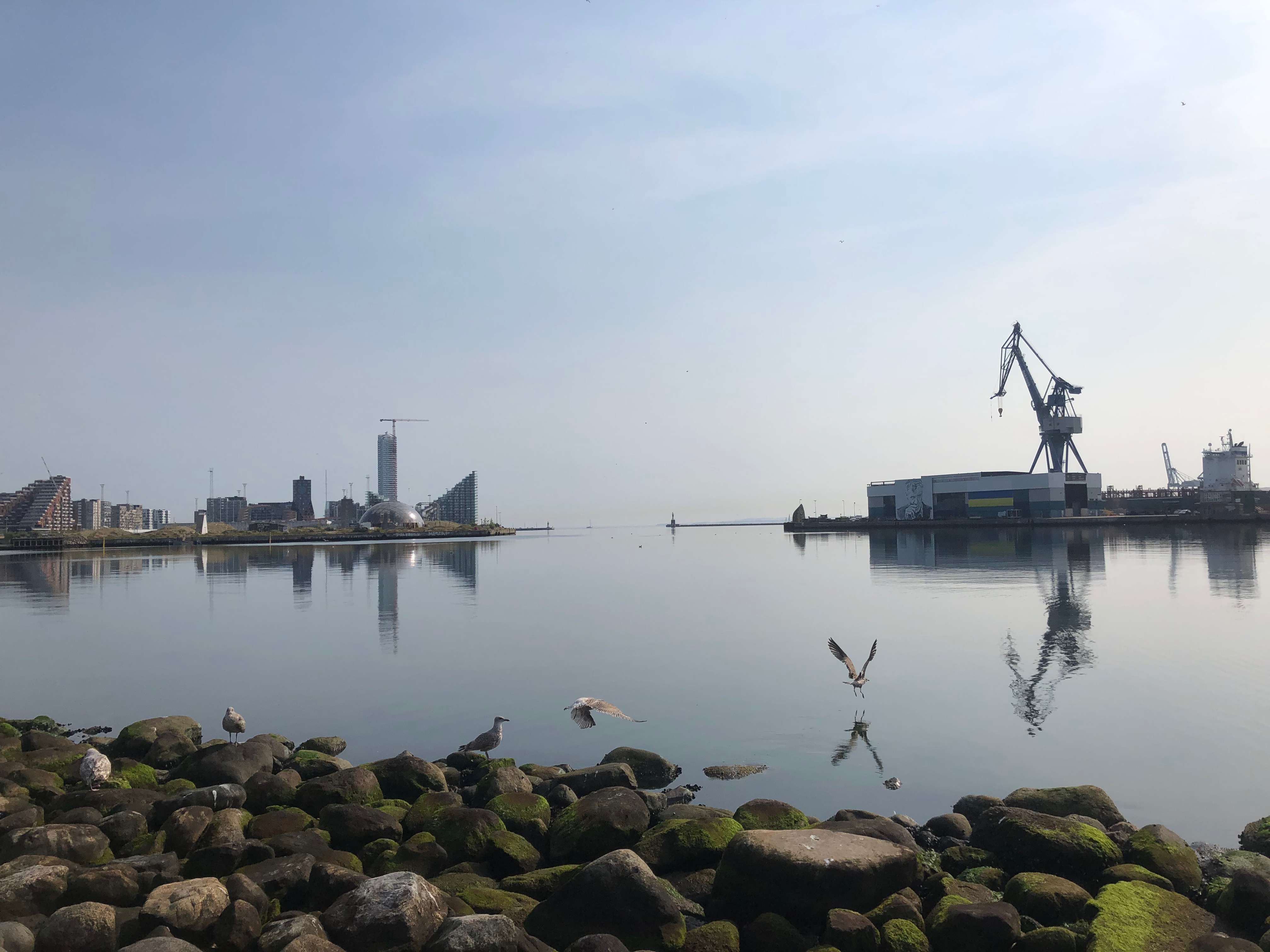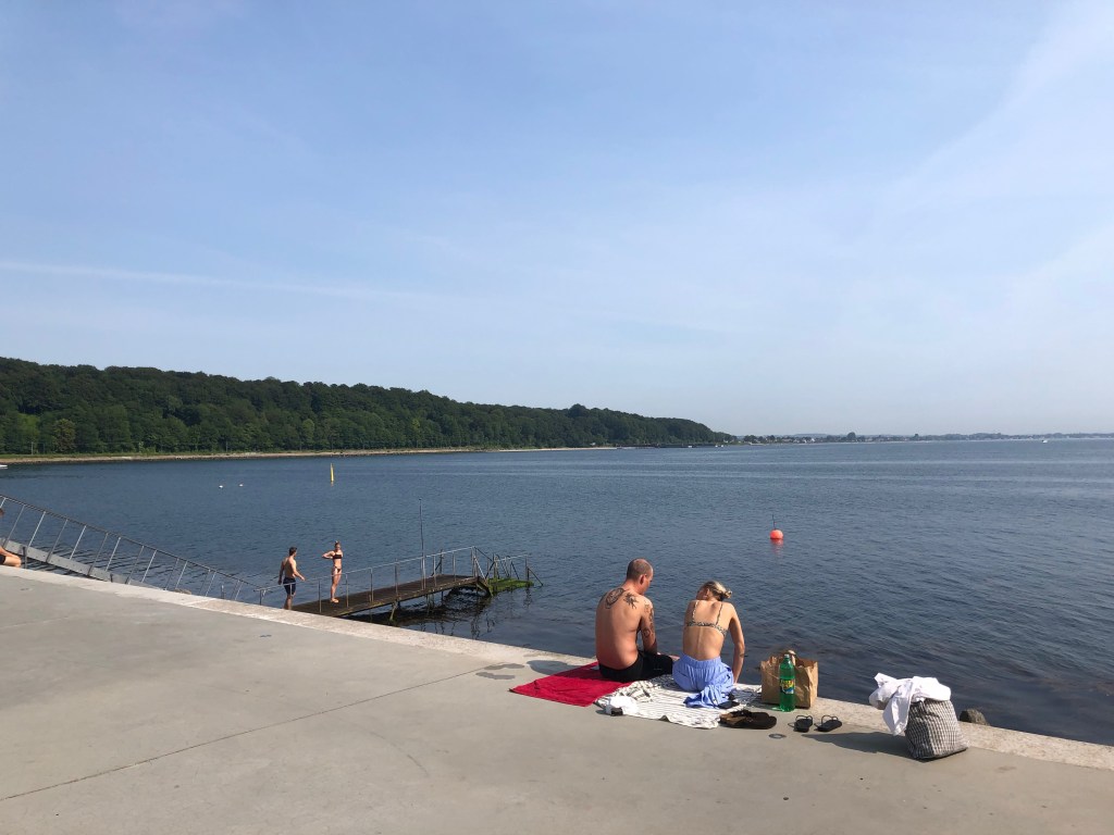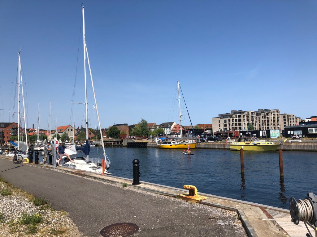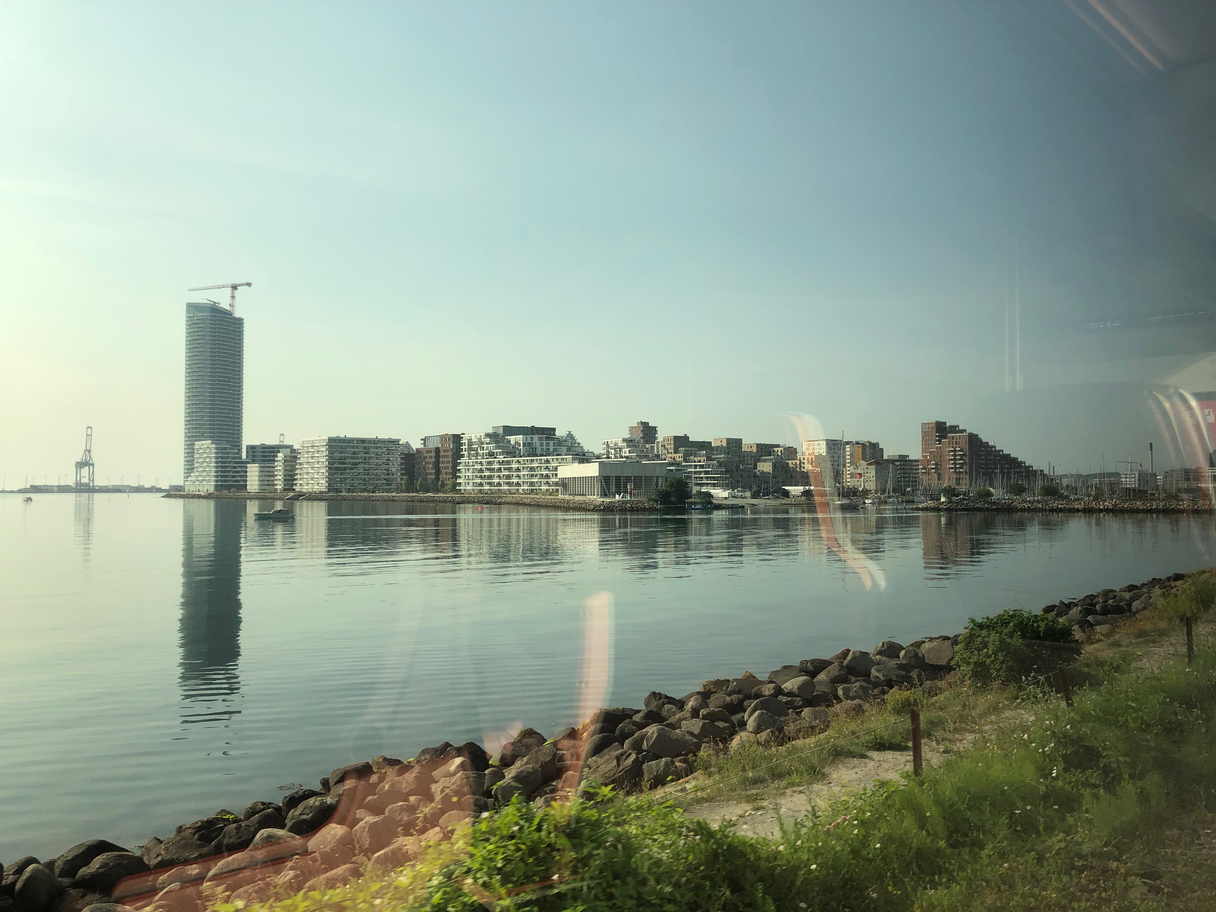 Juste avant Aarhus, le train longe quasiment la plage et la baie, ce qui nous donne l’occasion d’avoir une superbe vue sur la ville, en tout cas sur son port et sa partie moderne. Waouw ! Je suis émerveillée et une chose est d’emblée sûre pour moi : Je veux revenir à Aarhus !