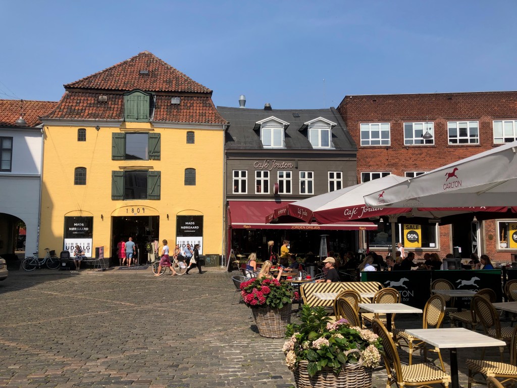 On revient vers le centre, et on prend notre repas de midi à la terrasse du Jorden Drejer : hamburger veggie pour nous deux, accompagné de drôles de frites crollées. Je profite de la proximité de magasins fort tentants pour m’acheter une petite robe, puis on se dirige vers la gare centrale, où on prend le train pour Fredericia de 13h32.