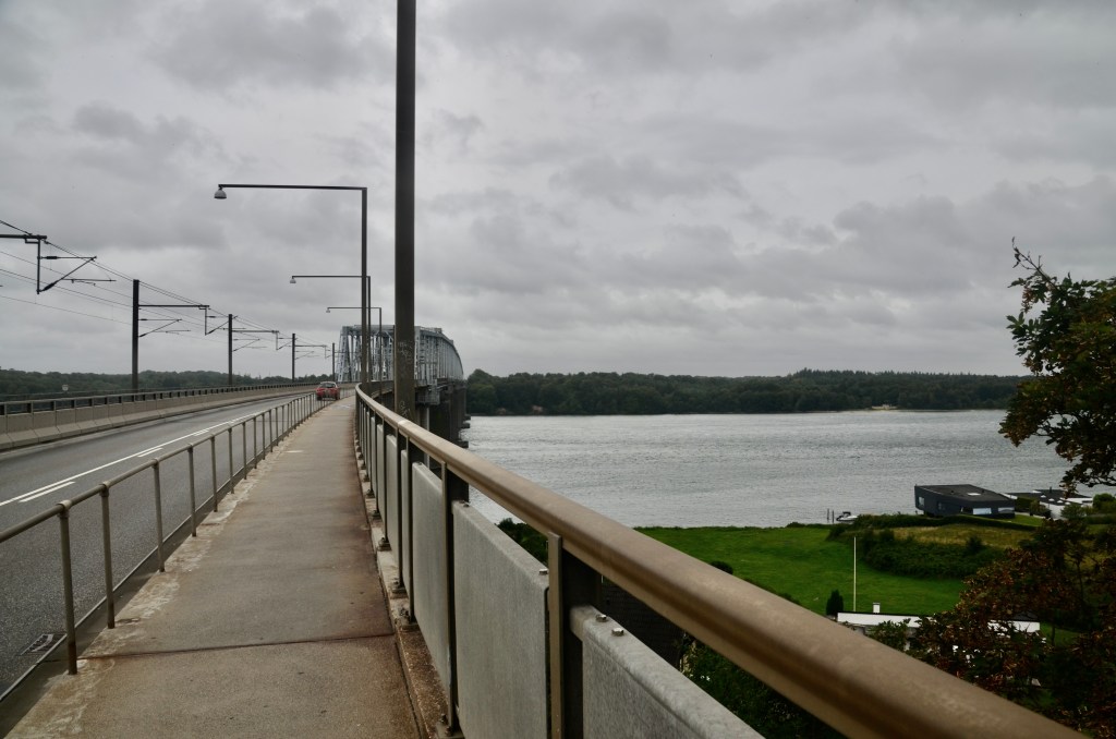 Ce matin, on se met donc en route peu après 8h30, bien calés par un copieux petit-déjeuner. Le vent souffle fameusement fort, mais heureusement, on l’a globalement dans le dos… sauf évidemment, après 8 km, pour emprunter le pont, qui n’est pas finalement le Nye Lillebæltsbro (le Nouveau pont du Petit Belt) que j’ai photographié hier, mais le vieux Lillebæltsbro : il y a donc un ancien et un nouveau, il n’y a qu’un cheveu sur la tête à Mathieu, et surtout, le Nye Lillebæltsbro est en fait une autoroute, inaccessible aux vélos donc.