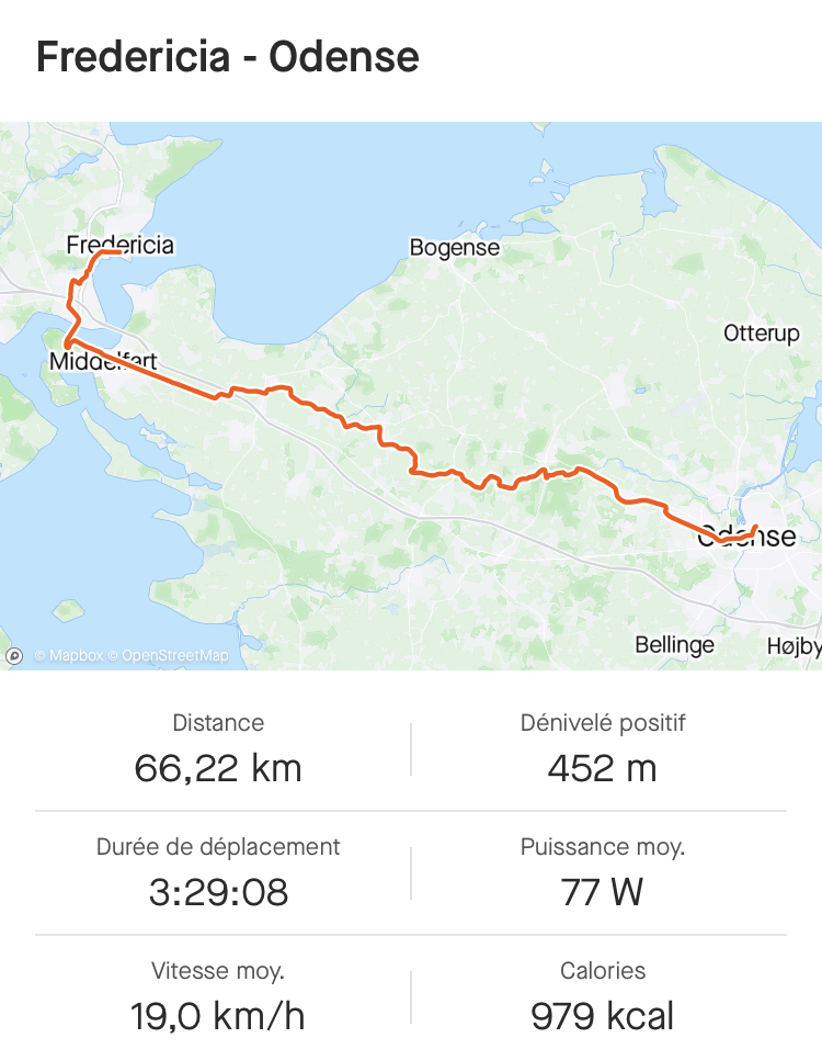 On rejoint donc une grand route heureusement pas trop éloignée, et on la suit sur quelques kilomètres avant de retenter notre chance en rejoignant l’itinéraire 6 pour les quelques derniers kilomètres qui nous séparent d’Odense. Et on fait bien, car on rejoint alors une magnifique piste cyclable dans les bois, toute droite et toute lisse, à double sens, qui nous mène au centre, où la circulation cycliste est assez dense mais très bien organisée, avec des pistes cyclables comportant un marquage au sol distinct pour ceux qui tournent et pour ceux qui vont tout droit.