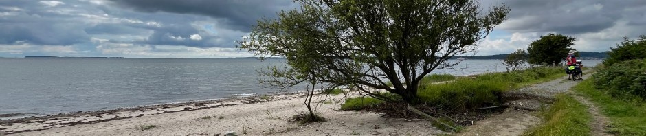 On longe ensuite le fjord pendant un bon paquet de kilomètres, et malheureusement, ça signifie emprunter une nationale assez fréquentée, qui monte et qui descend tout le temps, avec une très étroite piste cyclable sur le côté. Pas très drôle ! Heureusement, on a de temps en temps une vue magnifique sur le fjord. Et évidemment, on voit des drapeaux danois, de ravissantes petites églises, d’adorables maisons aux toits de chaume, etc.