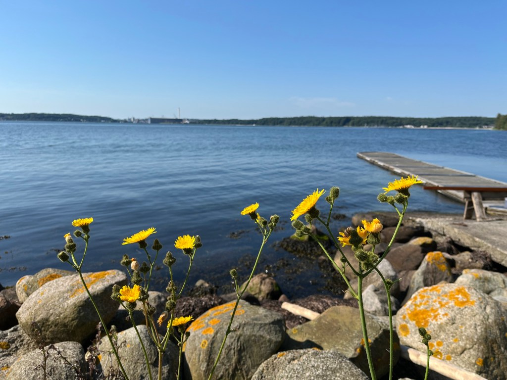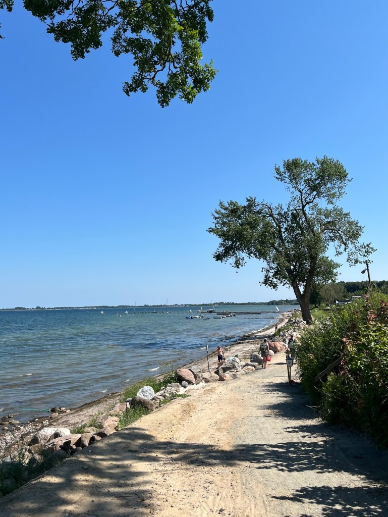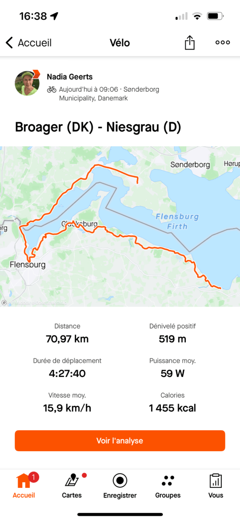 À 10h10, on fait une première pause à Kollund, au bord de l’eau, après un trajet vraiment très agréable sur des routes asphaltées, avec juste ce qu’il faut de montées et de descentes pour qu’on arrive à faire 20 km en à peine plus qu’une heure !