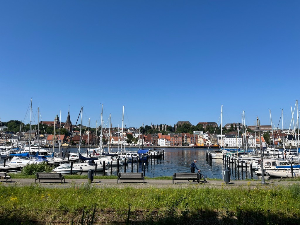 Ça monte fameusement pour contourner ce domaine militaire, puis on redescend droit sur la côte et de jolies petites plages. On roule encore un petit peu, histoire d’avoir fait 40 km kilomètres avant le repas de midi, et on s’arrête au bord d’un petit lac. En face de nous trône un magnifique château, celui de Glücksburg. Il y a de l’ombre, c’est là qu’on s’installe pour déjeuner après 41 km, à 12h40.