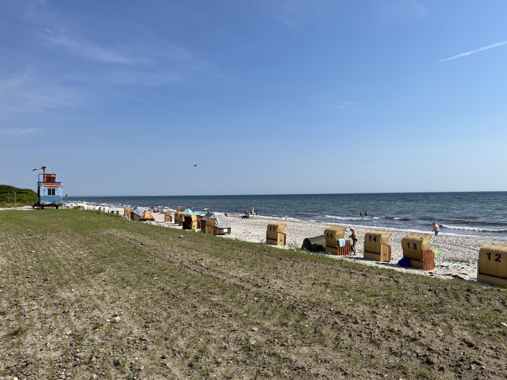 - le contraste saisissant entre deux pays (le Danemark et l’Allemagne), mais aussi, dans une moindre mesure certes, entre les anciennes Allemagne de l’Ouest et de l’Est. En gros, les paysages danois très peu peuplés, une manière danoise de profiter de la plage ou plus généralement de la vie d’une manière très simple (ni transats ni Strandkörbe, mais aussi très peu de cafés ou restaurants, et ceux-ci généralement très « sans chichi », burgers ou pizzas. Le contraste est donc saisissant avec l’Allemagne de l’Ouest, beaucoup plus peuplée, avec de nombreux villes et villages, de l’horeca à foison, des stations balnéaires très « côte belge » (les Strandkörbe en plus et les grands immeubles en moins !) qui côtoient des petites plages « sauvages » à la danoise. Passer à l’Est, c’est retrouver un peu de cette atmosphère danoise, avec à nouveau davantage d’espaces naturels exempts d’habitations, une tradition culinaire spécifique aussi, conservée depuis l’époque de la RDA.