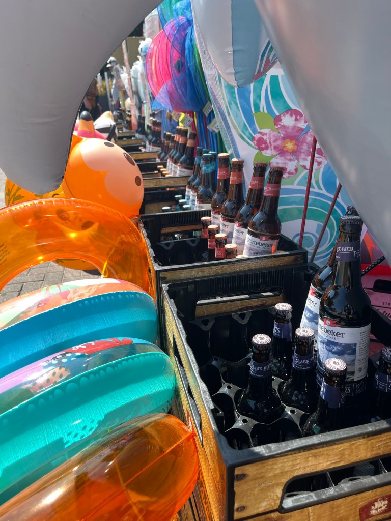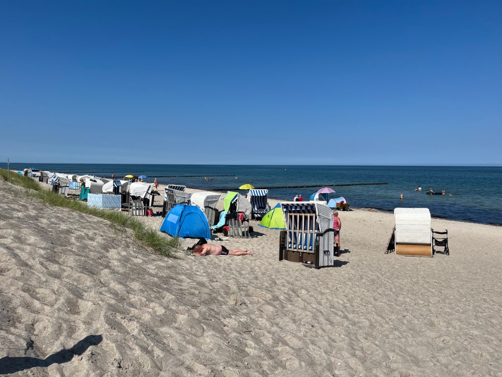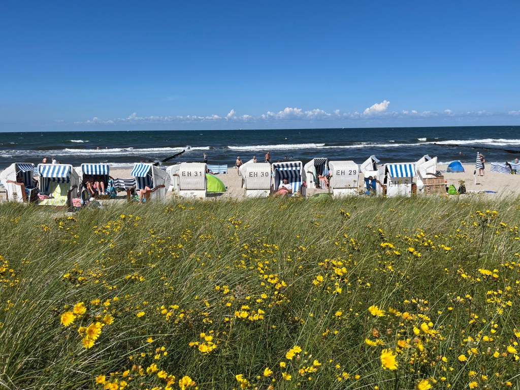 Manifestement, si les stations balnéaires sont un concept inconnu des Danois et peu fréquent aux Pays-Bas, elles font partie de la culture allemande comme belge ! Mais en Allemagne coexistent des plages « sauvages » sans infrastructure particulière, et des plages payantes, avec des Strandkõrbe, et dans ce cas, si on ne loue pas une Strandkorb, on doit acheter une carte journalière qui donne accès à la plage. Je comprends mieux pourquoi dans la plupart des logements, nous avons reçu une carte touristique à notre nom…