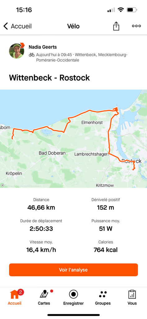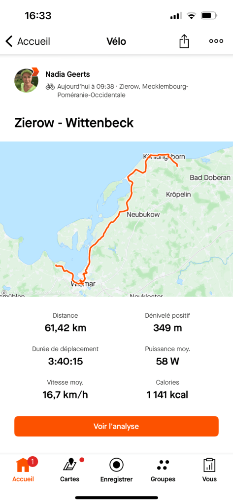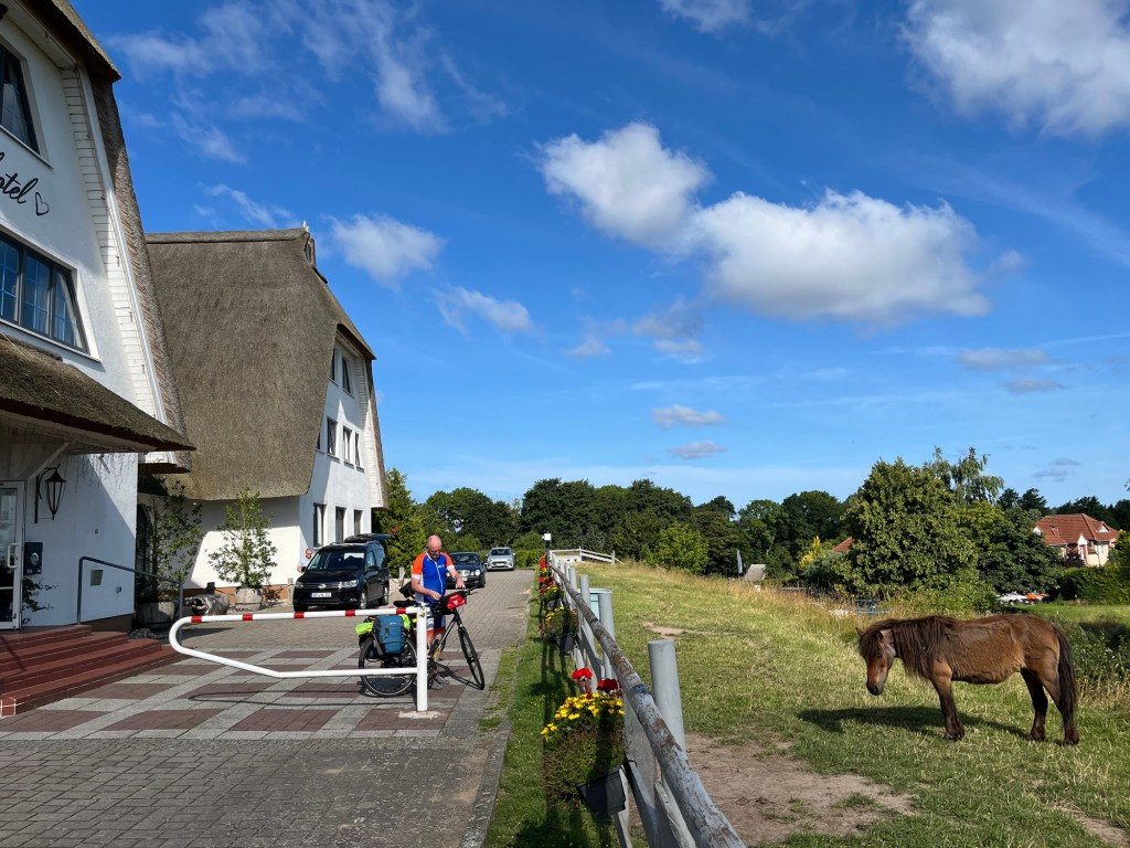 Bon, Kühlungsborn est très joli, mais c’est un peu Knokke-Le-Zoute, faut avouer. Beaucoup de monde, de boutiques, de glaces, de vélos, … On repart pour les 6 derniers kilomètres et à 16h pile, on arrive à notre hôtel, le Wittenbeck Resort, mais dont l’appellation locale semble être plutôt Das Landhotel, après avoir fait 61km. Il y a deux poneys dans un enclos juste devant l’entrée, on a la chambre 204, au premier étage, et vue sur nos vélos ! Et comme il y a piscine et sauna, on y court !