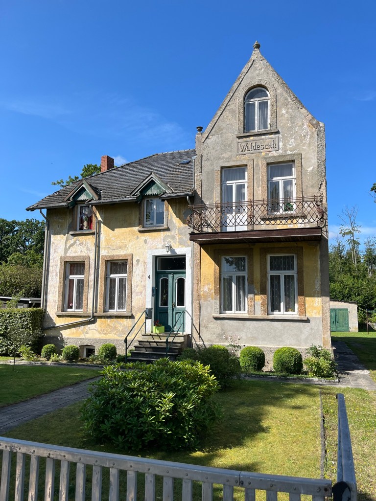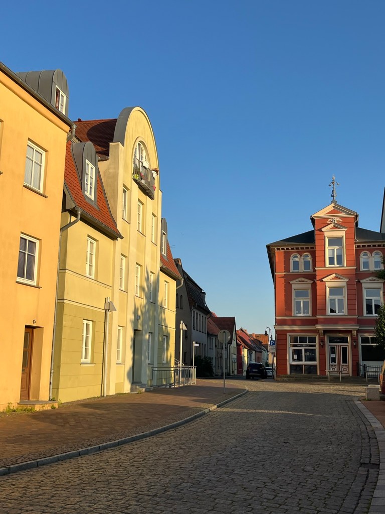 À 9h45 on se met en route. Il fait un soleil radieux, le vent souffle assez fort, comme hier, mais cette fois on l’a dans le dos ! On traverse un petit village où l’on peut admirer l’architecture de la région, version est-allemande non entretenue et version rénovée !