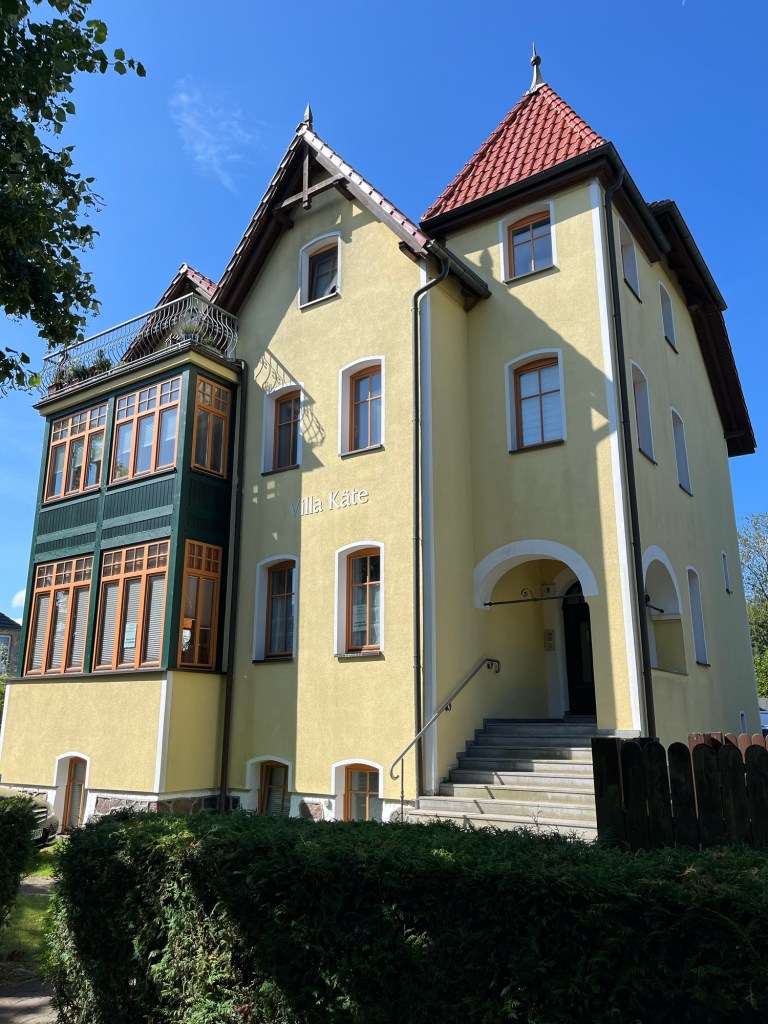 Et donc, à Kühlungsborn, on découvre une Promenade et une architecture balnéaire splendides. Il est 15 heures, on a fait 55 km depuis ce matin, et on s’arrête à une terrasse au bord de la mer, qui est très agitée. On s’offre un café glacé (moi), un chocolat glacé (lui), et deux croissants au chocolat (un pour chaque), et on souffle.