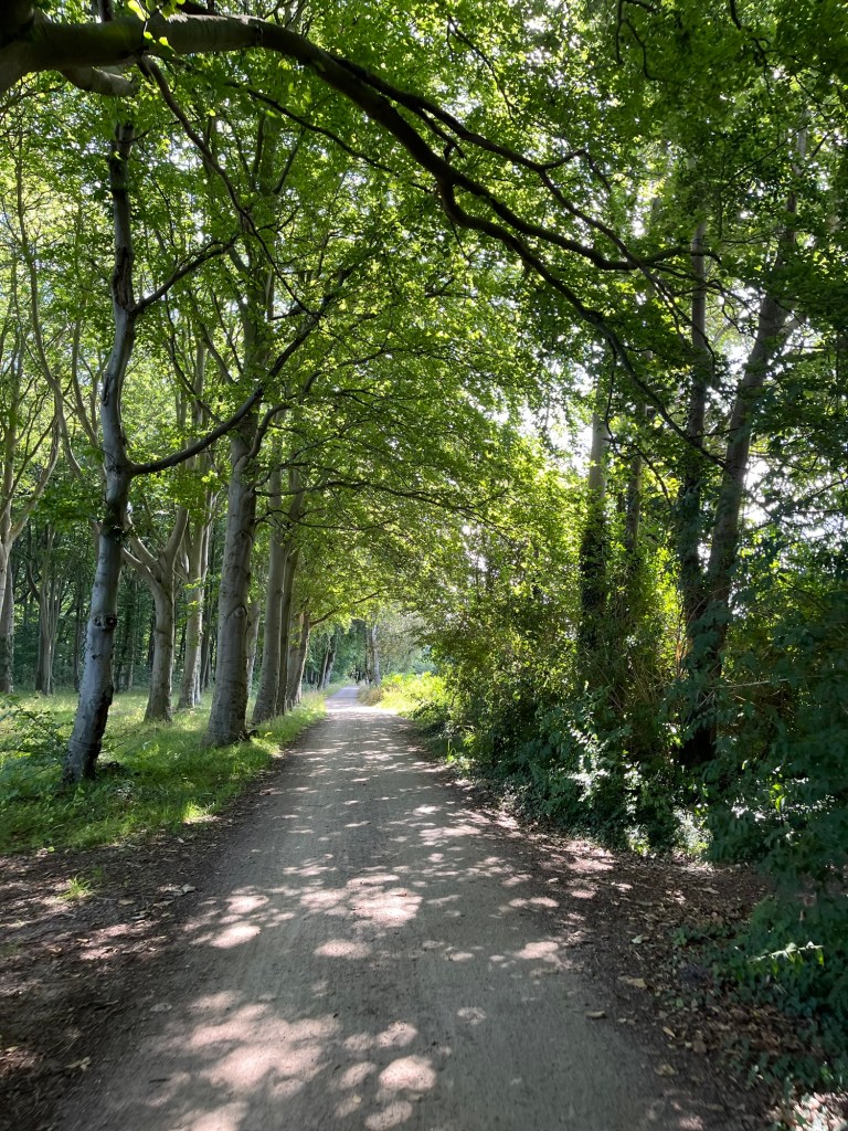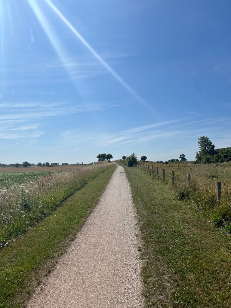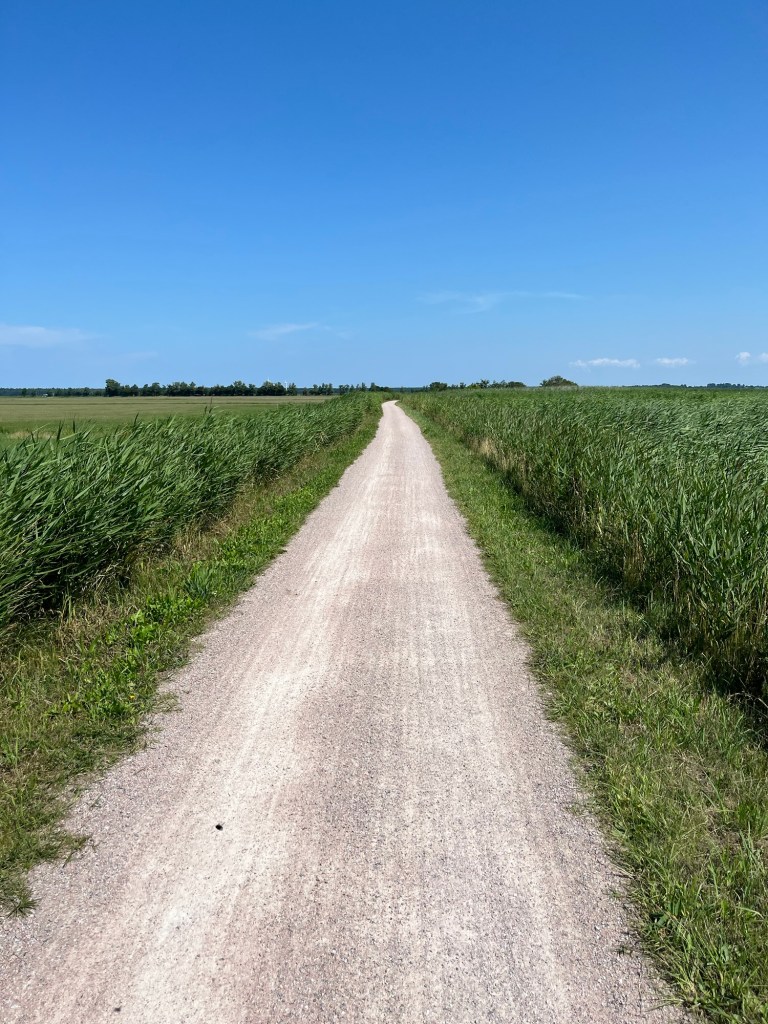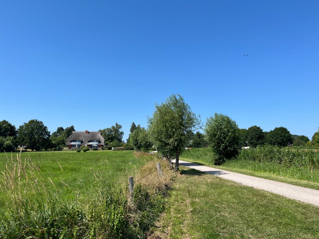 Le chemin est ensuite magnifique, fait de coquillages concassés formant un ruban blanc dans une immensité verte, avec de temps en temps une vue sur l’eau à notre droite. Mais on commence à fatiguer ! On s’accorde donc une petite pause après 50 km, puis on traverse un ravissant petit village, Born, où se succèdent d’adorables maisons pastel aux toits de chaume, puis en suivant l’itinéraire balisé, on s’éloigne radicalement de celui qu’on avait préparé. Qu’à cela ne tienne, ça revient au même, et c’est très joli !
