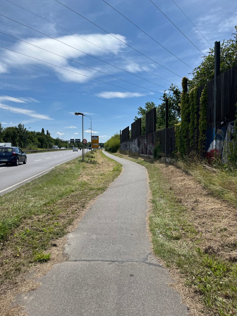 Ensuite, il est temps d’aborder le dernier tronçon de notre voyage, celui vers le centre de Rostock et notre hôtel. On longe d’abord une quasi-autoroute: deux fois deux bandes, mais avec une piste cyclable le long, ce qui implique qu’à chaque sortie et entrée d’autoroute, on doit vérifier soigneusement que rien n’arrive avant de traverser la bretelle ! Un peu stressant…